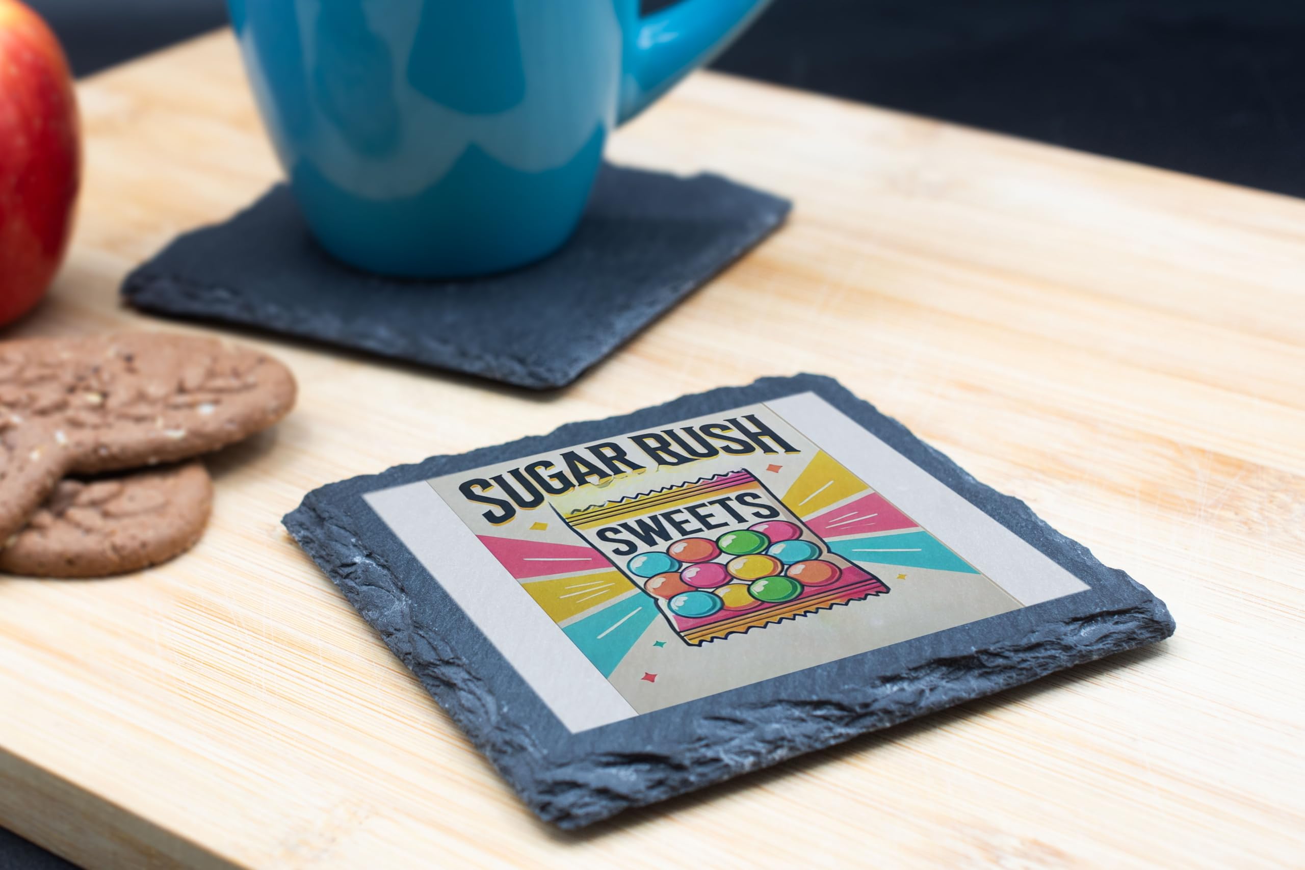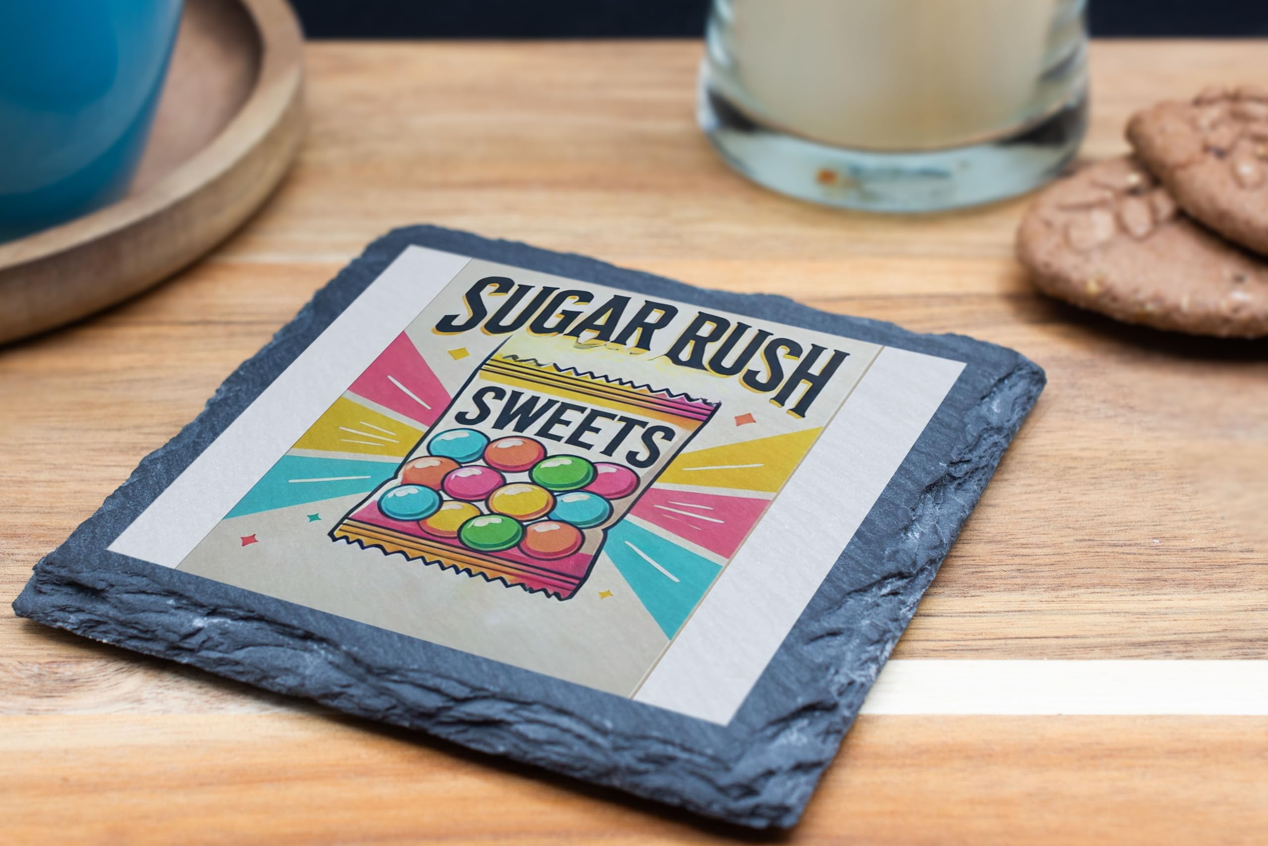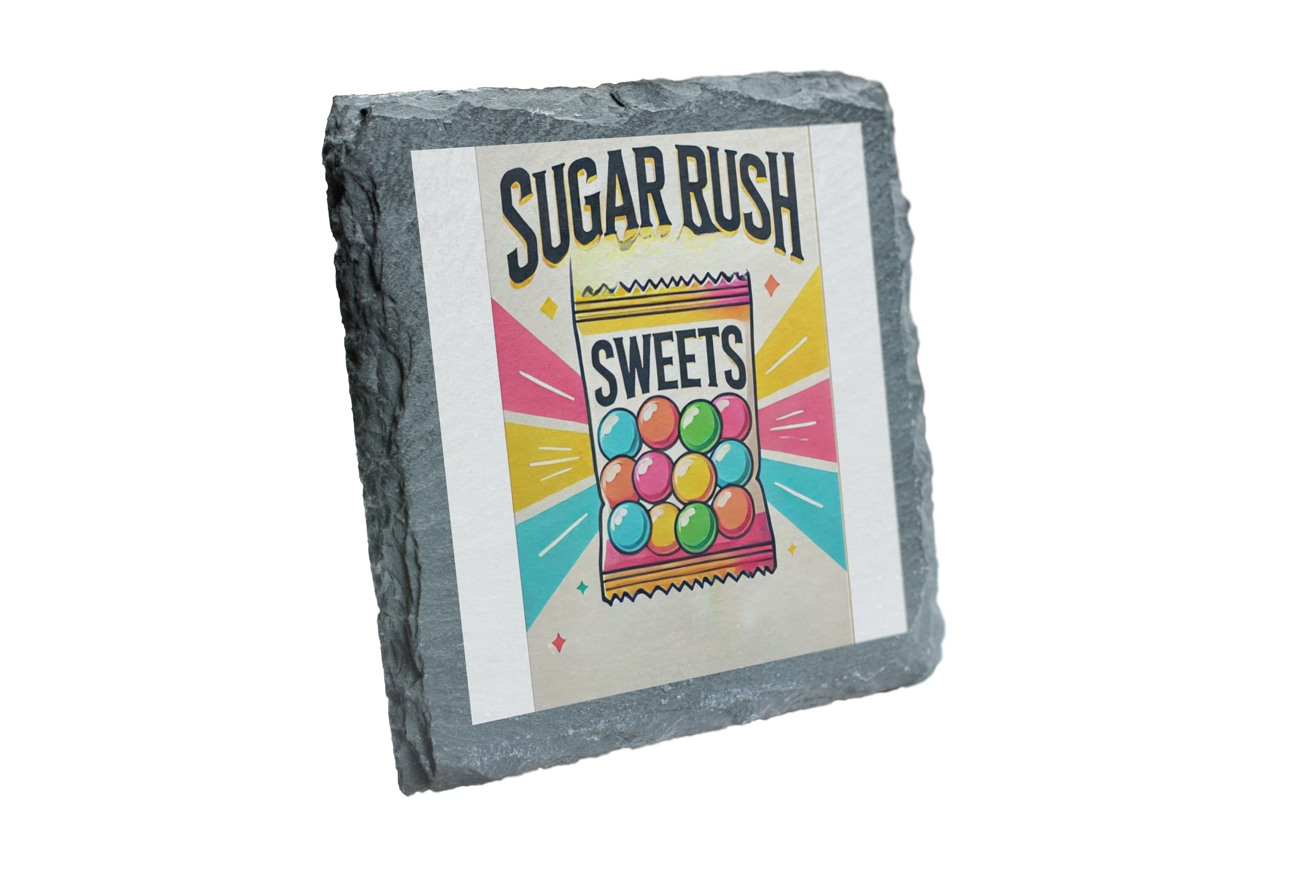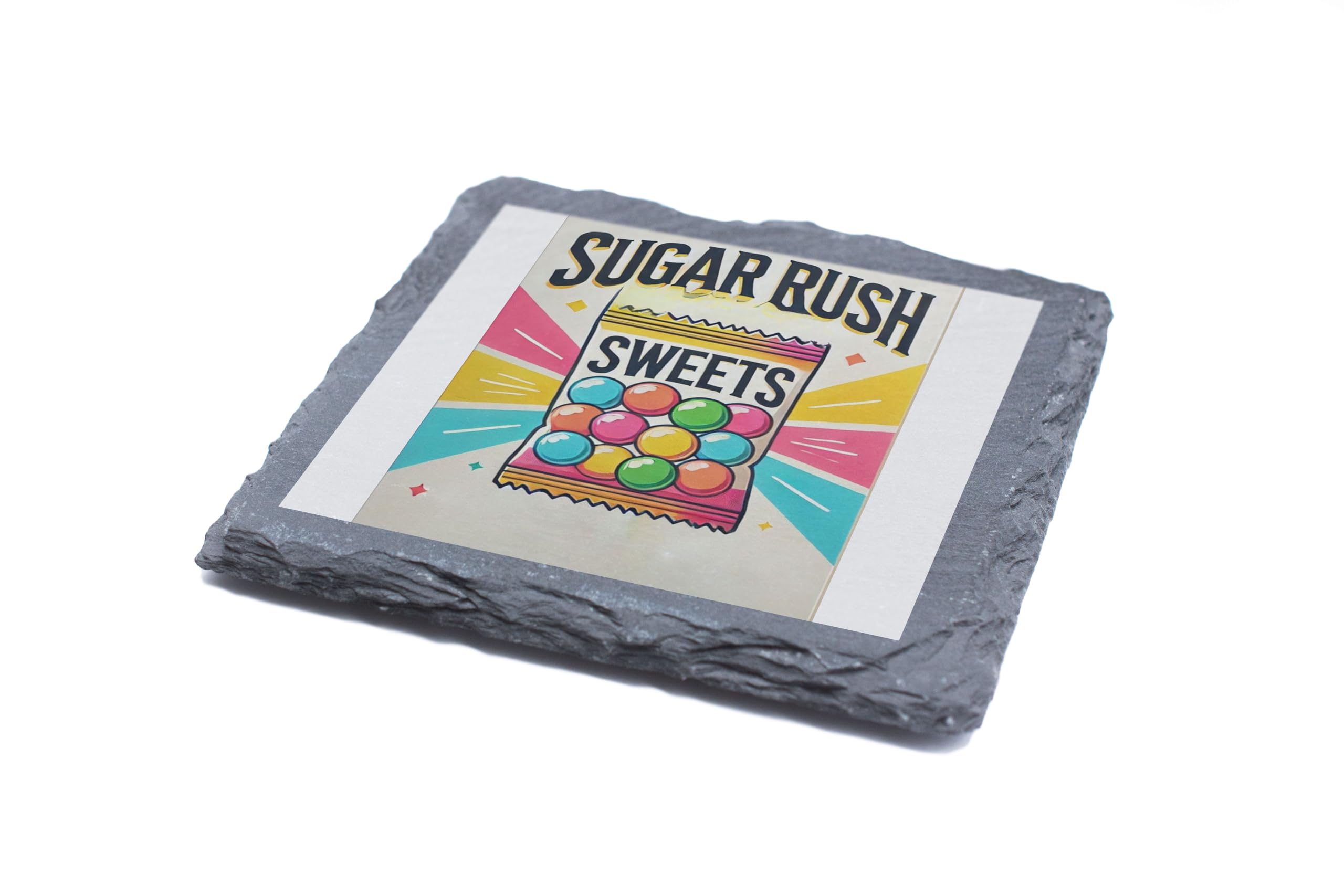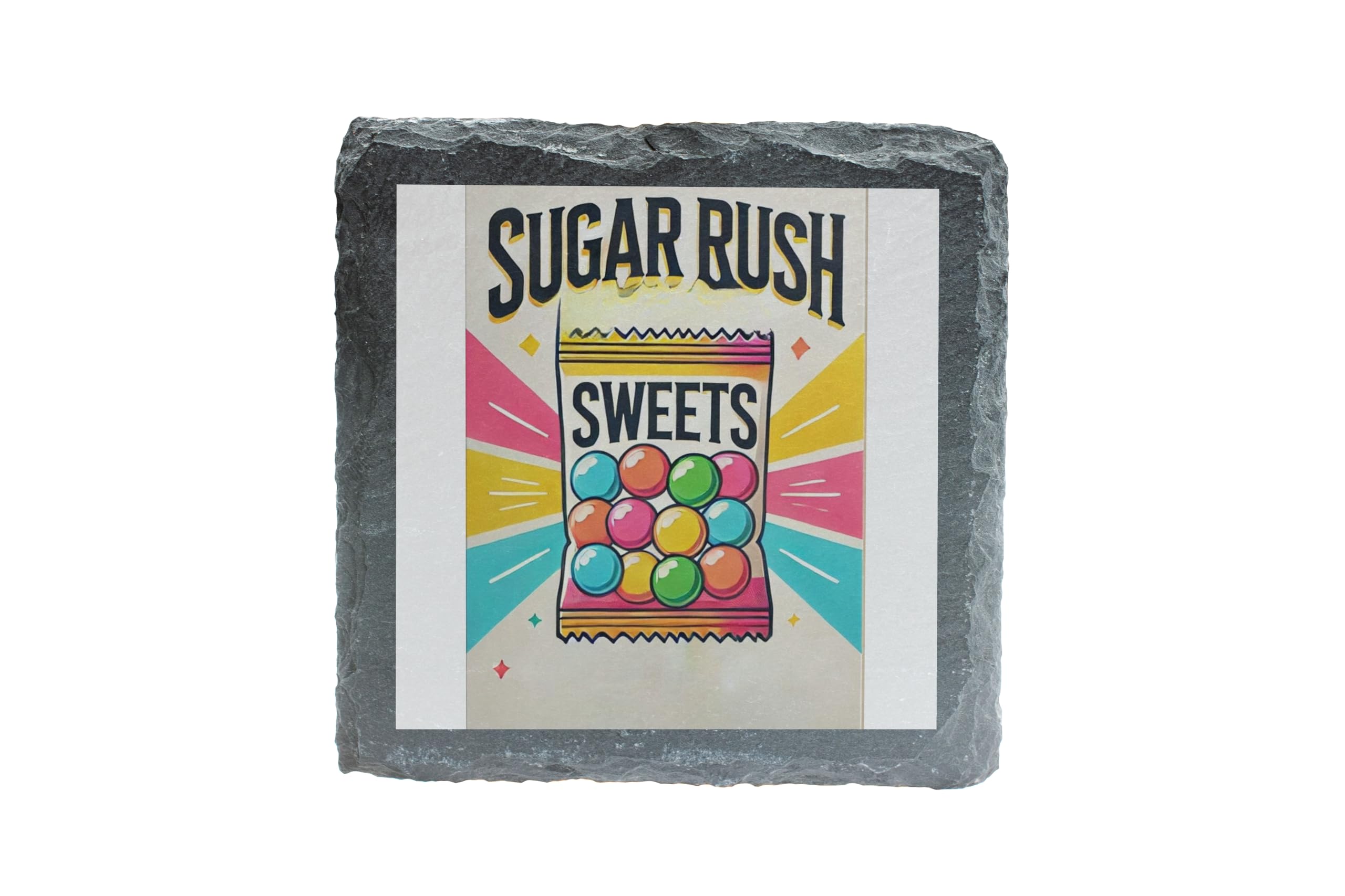 Add a burst of sweetness to your home with the "Sugar Rush Sweets" Slate Coaster. Featuring a vibrant, candy-themed design, this playful coaster is perfect for those who love a bit of fun and indulgence in their decor. The colorful illustration of a candy bag radiates charm and nostalgia, making it a delightful centerpiece for any space. Crafted from high-quality slate, this coaster not only protects your surfaces from spills and heat but also adds a stylish touch to your table. Its natural, textured finish ensures durability while maintaining an elegant look. Whether you're enjoying a treat during movie night or hosting a candy-themed party, this coaster is both functional and decorative. Gift it to the sweet lover in your life or keep it for yourself as a whimsical addition to your home.