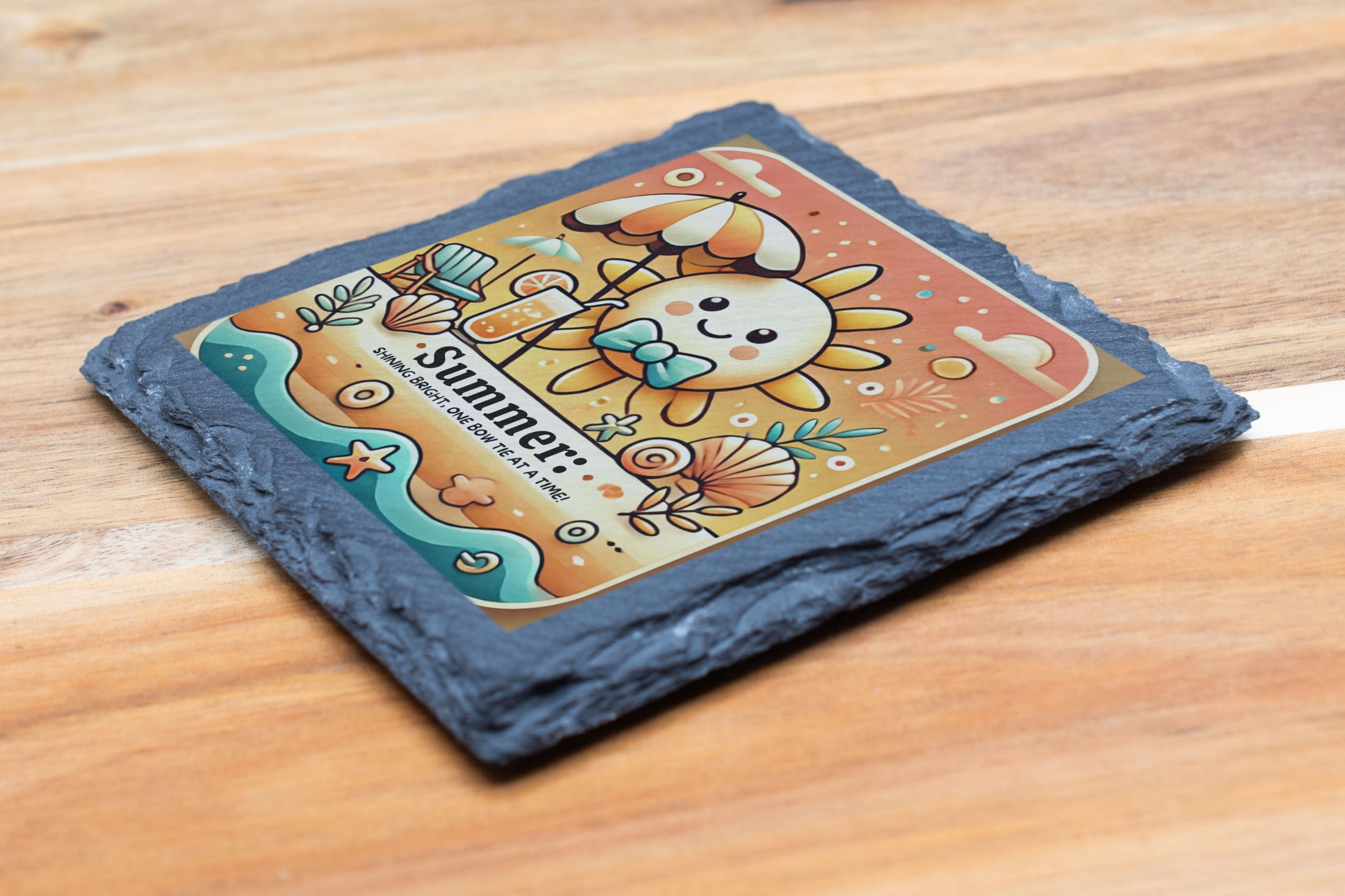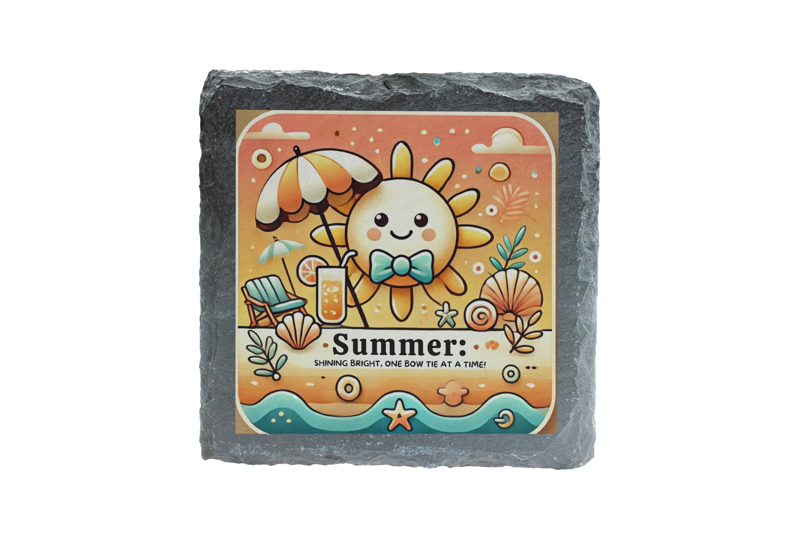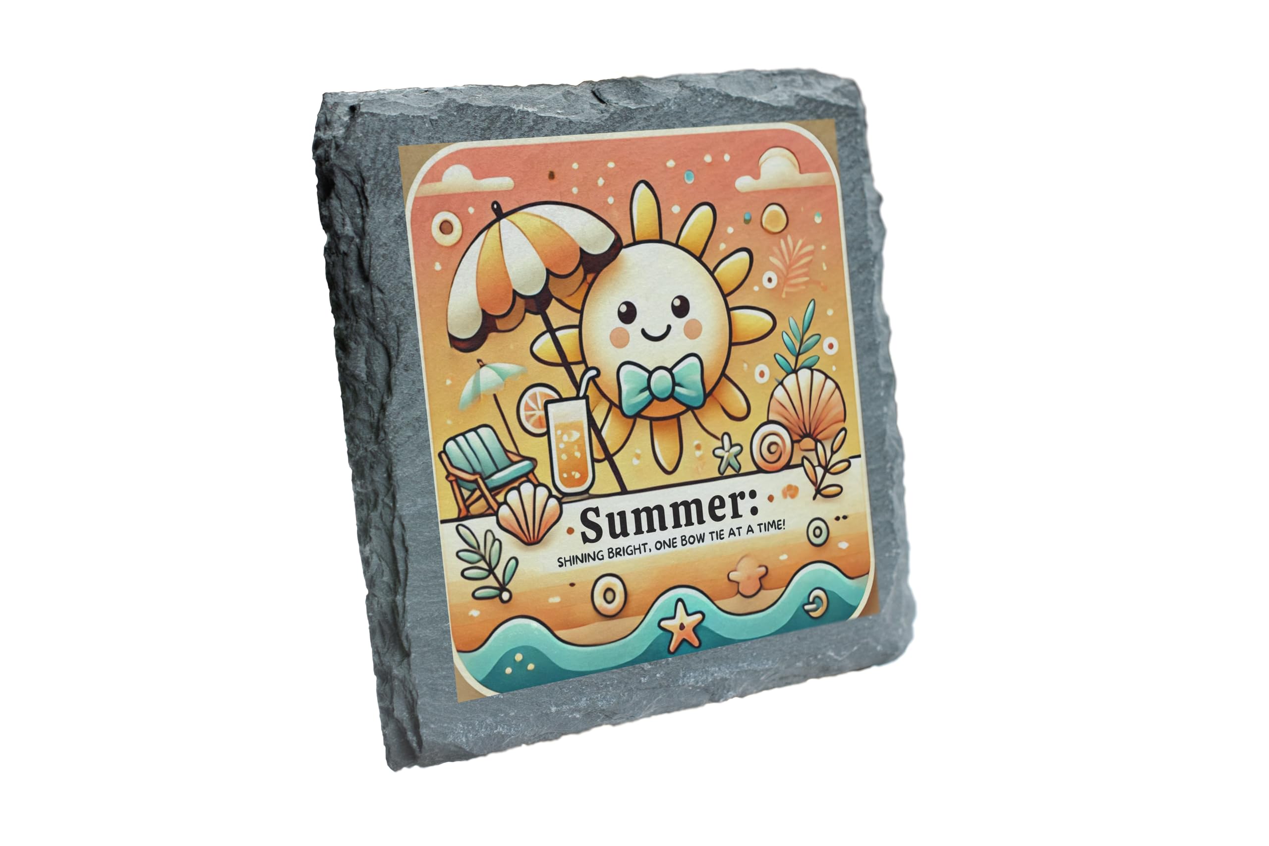 Welcome the sunny vibes of summer into your home with the "Summer: Shining Bright One Bow Tie at a Time" Beach-Themed Slate Coaster. This whimsical coaster features an adorable sun character dressed up with a bow tie, surrounded by vibrant seaside elements like waves, starfish, and lounge chairs. Made from premium slate, this coaster is not only a functional protector for your surfaces but also a decorative piece that adds charm to your summer gatherings or home decor. The fade-resistant design ensures the vibrant colors remain intact for seasons to come. Whether you're gifting it to a beach enthusiast or using it to elevate your summer decor, this coaster is sure to bring smiles and sunny vibes!