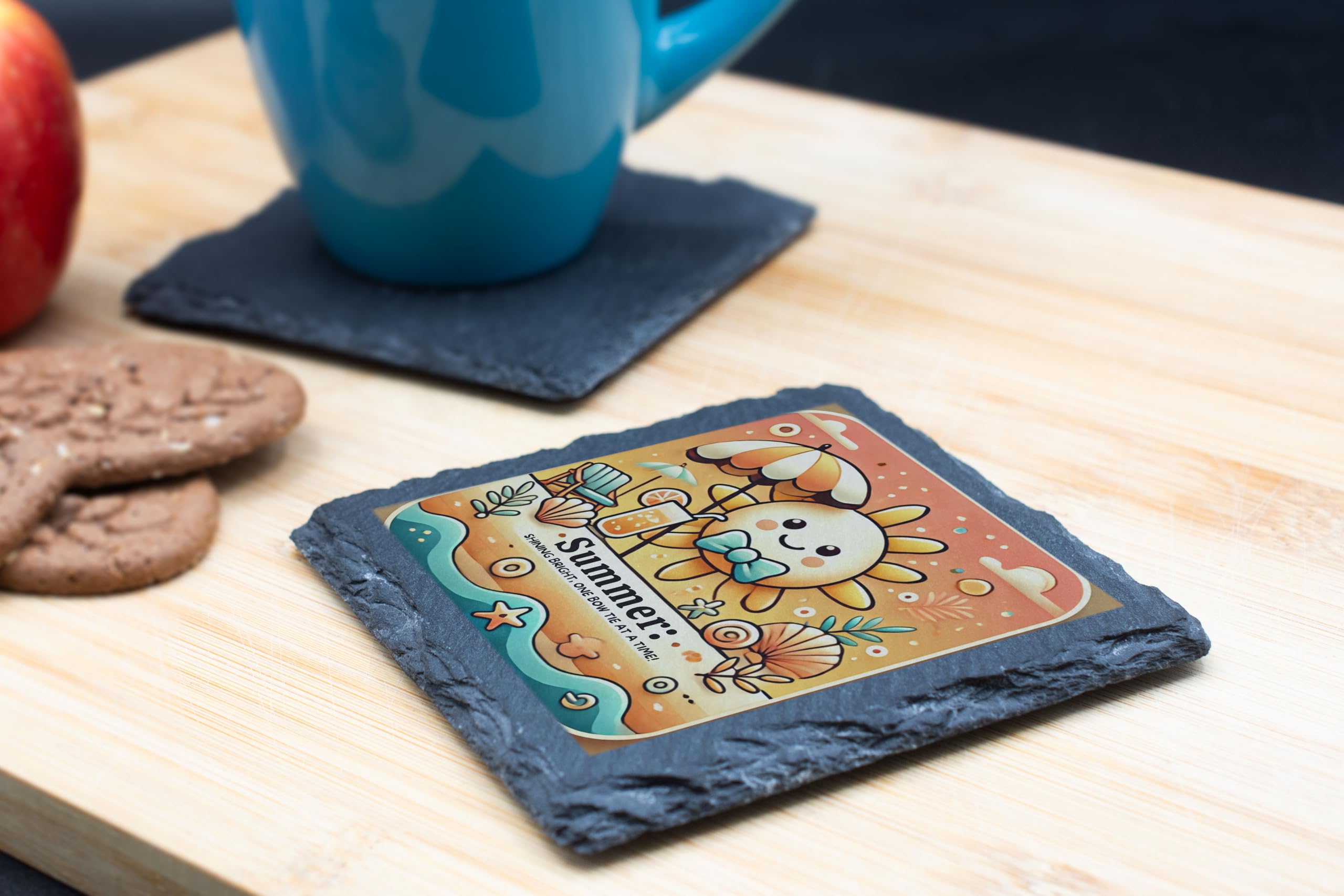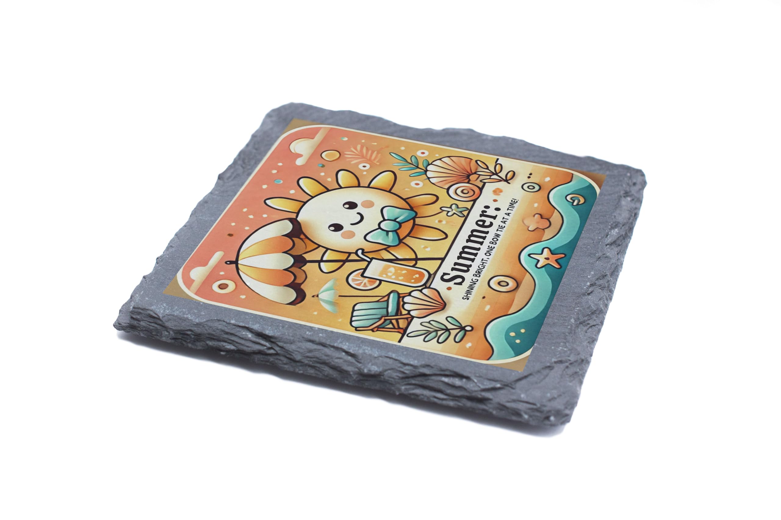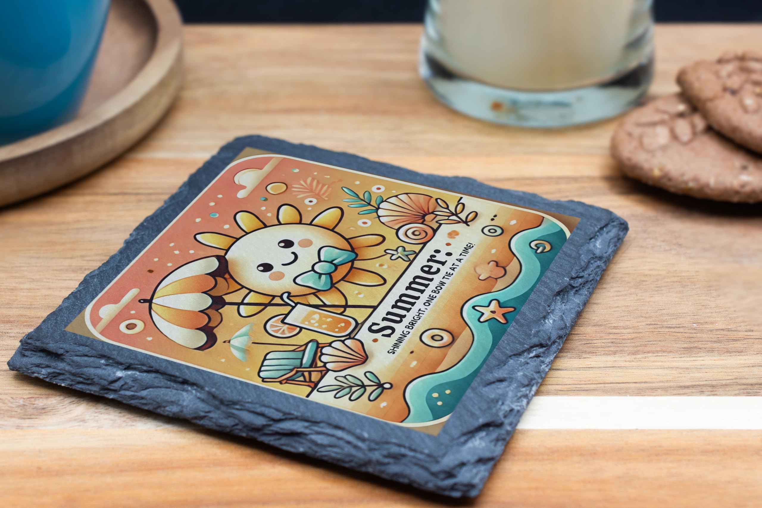 Welcome the sunny vibes of summer into your home with the "Summer: Shining Bright One Bow Tie at a Time" Beach-Themed Slate Coaster. This whimsical coaster features an adorable sun character dressed up with a bow tie, surrounded by vibrant seaside elements like waves, starfish, and lounge chairs. Made from premium slate, this coaster is not only a functional protector for your surfaces but also a decorative piece that adds charm to your summer gatherings or home decor. The fade-resistant design ensures the vibrant colors remain intact for seasons to come. Whether you're gifting it to a beach enthusiast or using it to elevate your summer decor, this coaster is sure to bring smiles and sunny vibes!