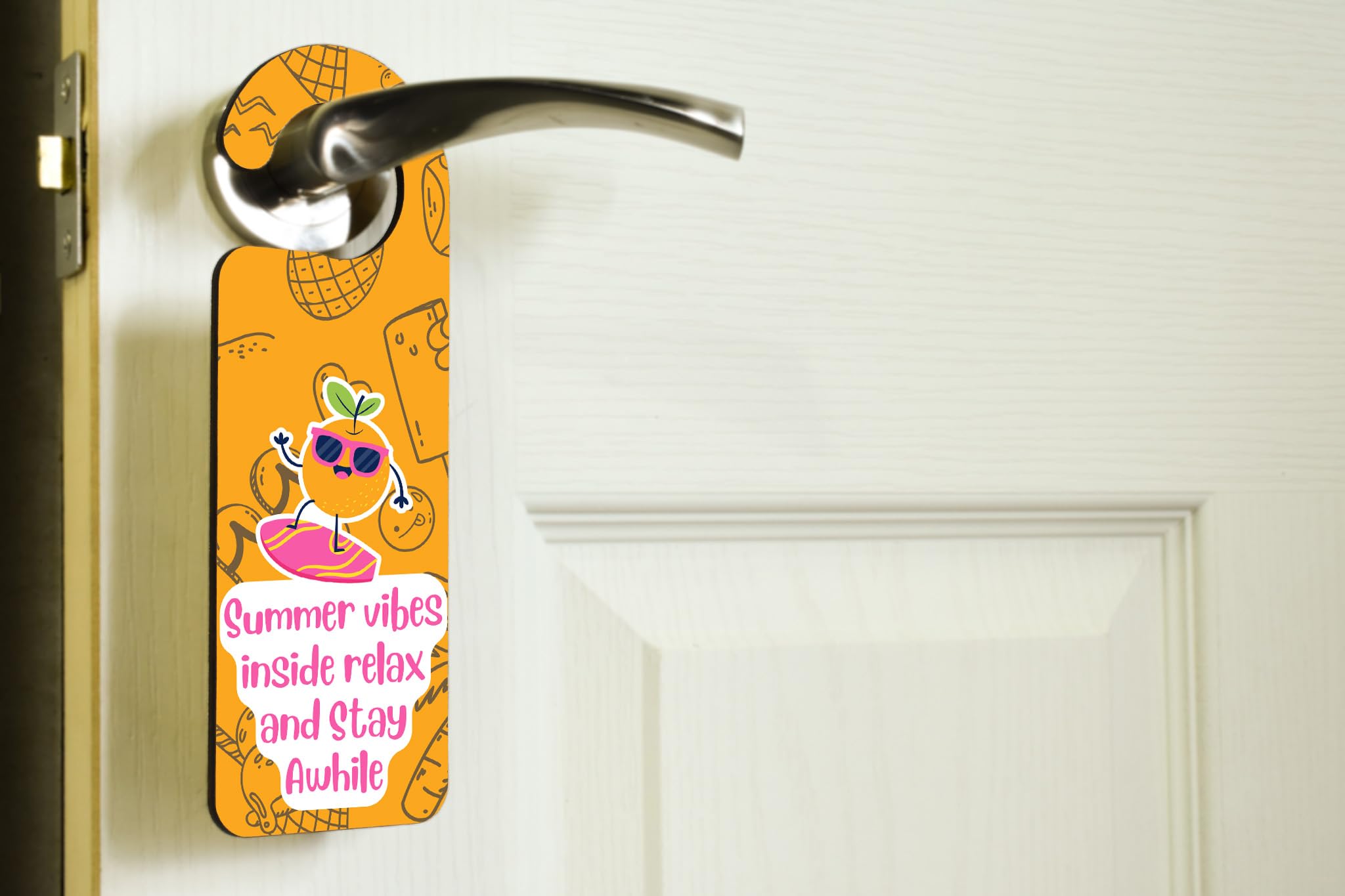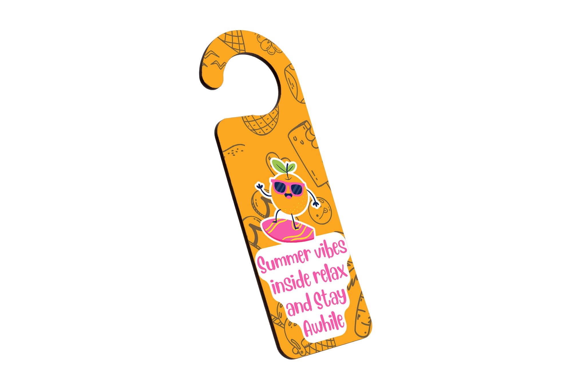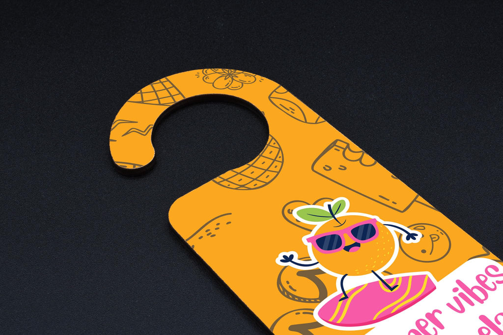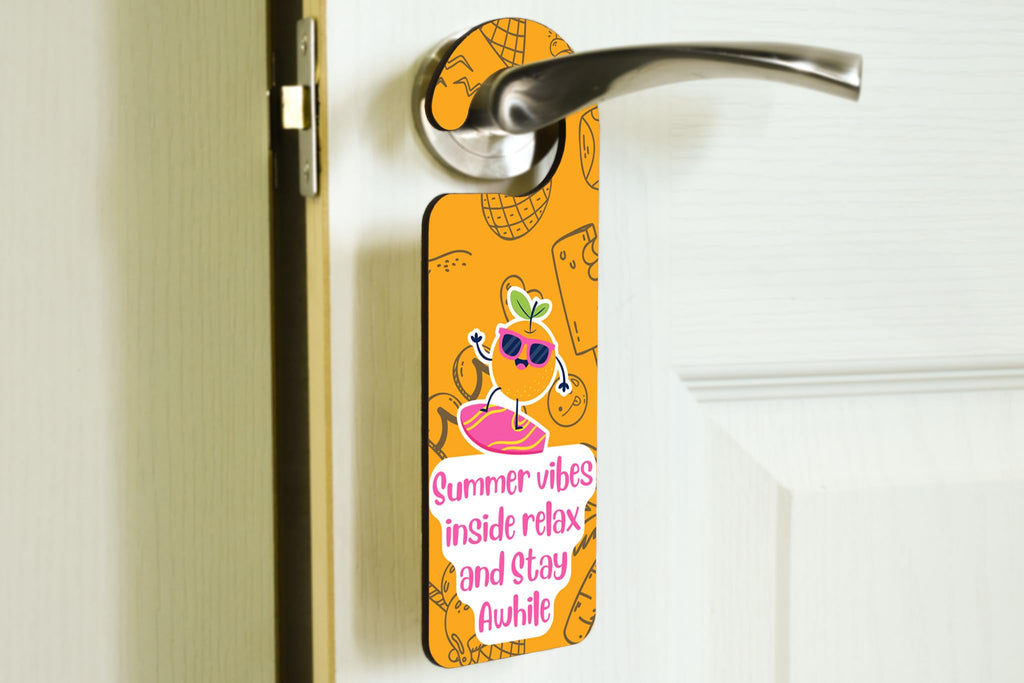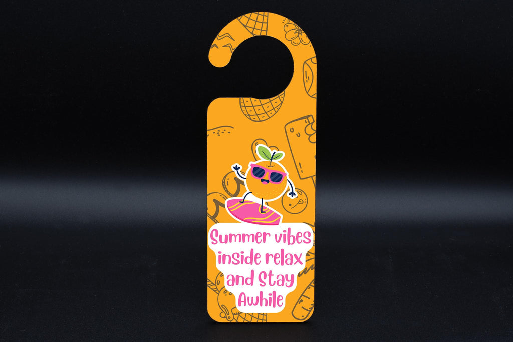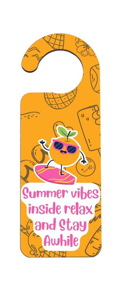 Add a touch of summer vibes to your home with our Summer Vibes Inside! Door Handle Hanger. Made with quality plywood, this door sign is not only durable but also adds a pop of colour to any room. Featuring a bright, summery, full-colour design in orange with sunglasses surfing, this hanger is sure to bring a smile to anyone's face. The words 'Summer Vibes Inside! Relax and Stay Awhile' are elegantly displayed, inviting friends and family to unwind and enjoy their time in your home. This door hanger also makes a perfect gift for son, daughter, teens, kids, siblings, and grandparents. It's a thoughtful present that will surely brighten up their day and remind them of the carefree days of summer. Hang it on your front door, bedroom door, or any other door that needs a little touch of sunshine. Order your Summer Vibes Inside! Door Handle Hanger today and enjoy the warmth and joy it brings to your home.