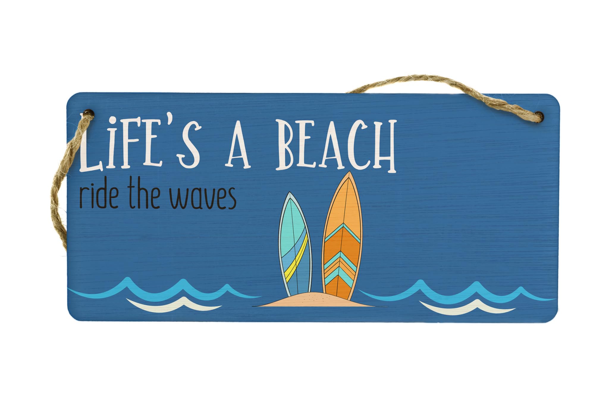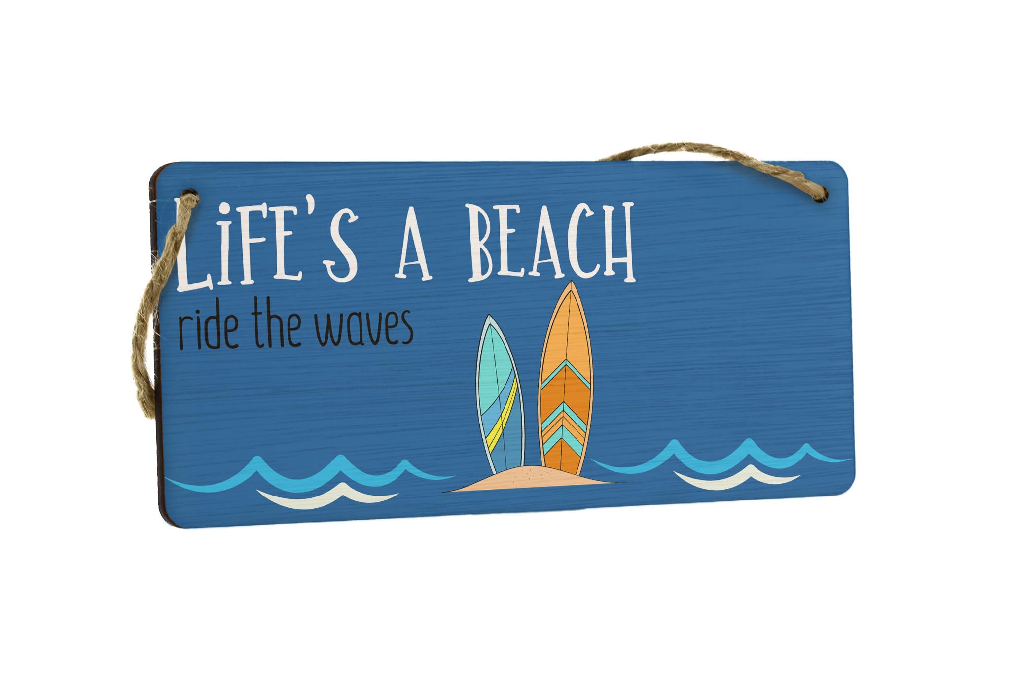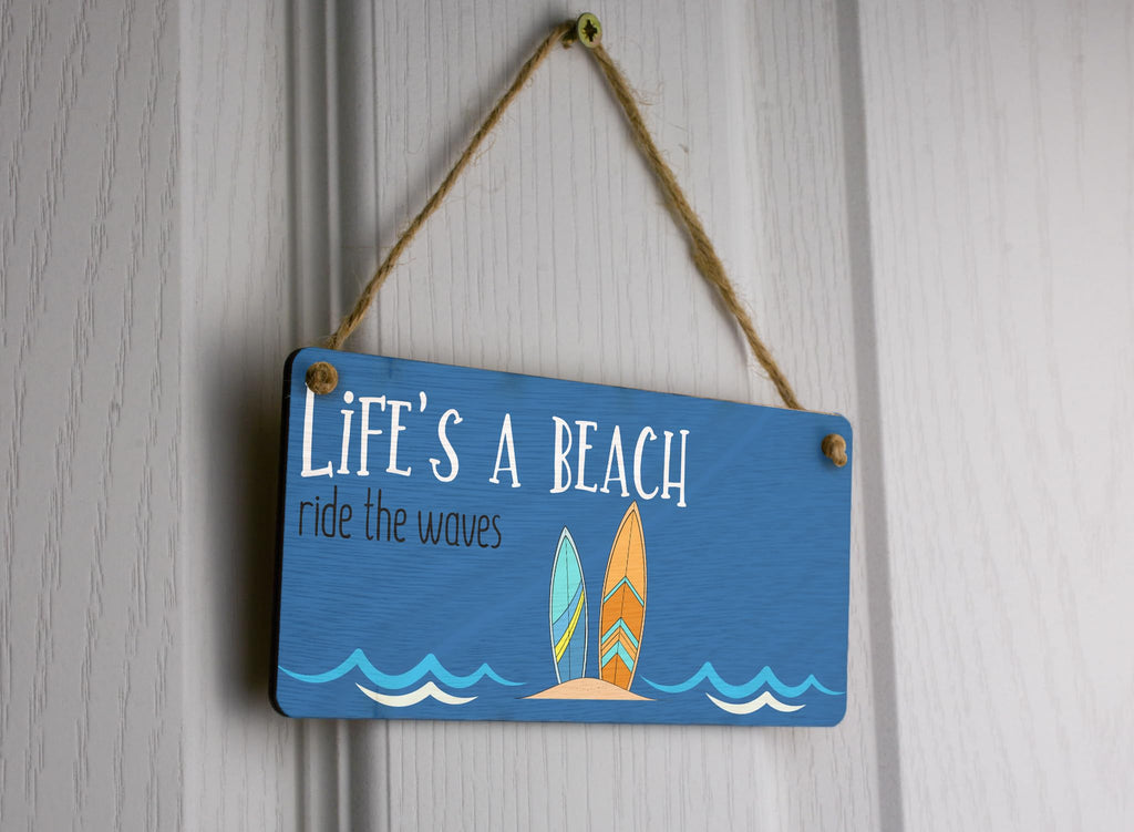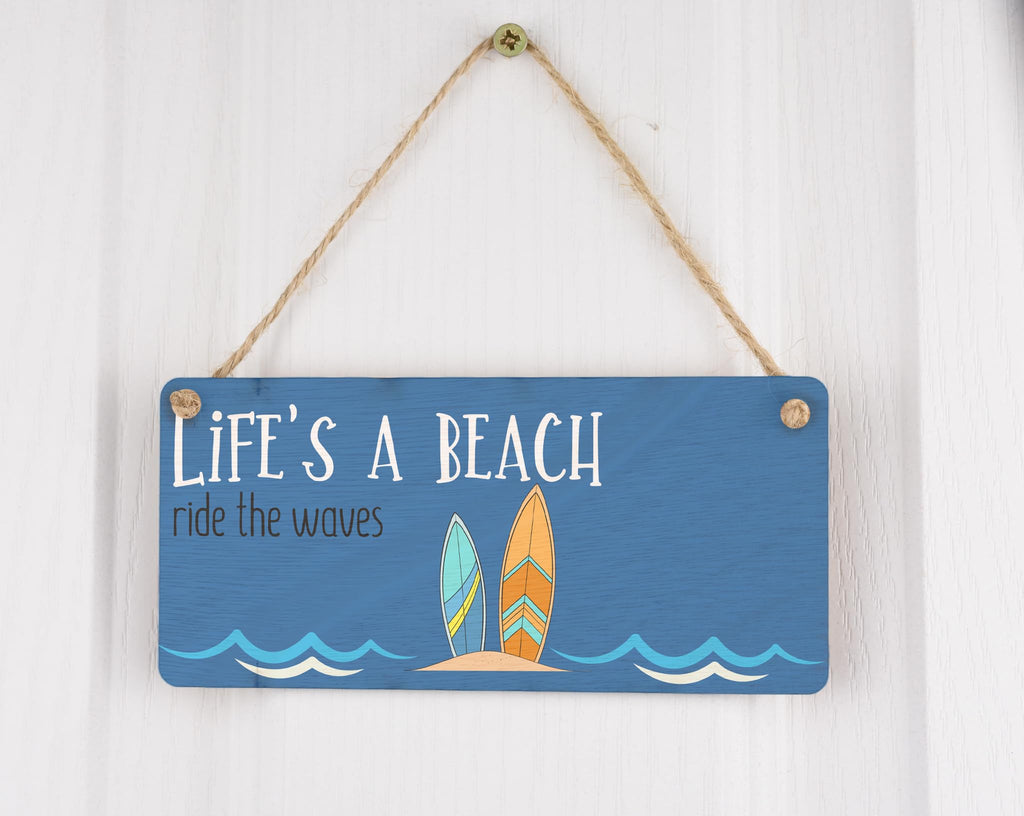 Add a touch of coastal charm to your home with this beautiful Surfing Beach Sign. Made from quality plywood, this hanging sign features a full colour design that includes an image of surfboards, bringing the beach vibes to any room. Whether you're looking for a gift for couples, mum, or dad, this sign makes a perfect choice. With its positive message that reads 'Life's a Beach, Ride the Waves', it is sure to uplift and inspire. Hang it in the bedroom, kitchen, or living room to create a relaxing and stylish atmosphere. Get ready to transform your home decor with this captivating sign.