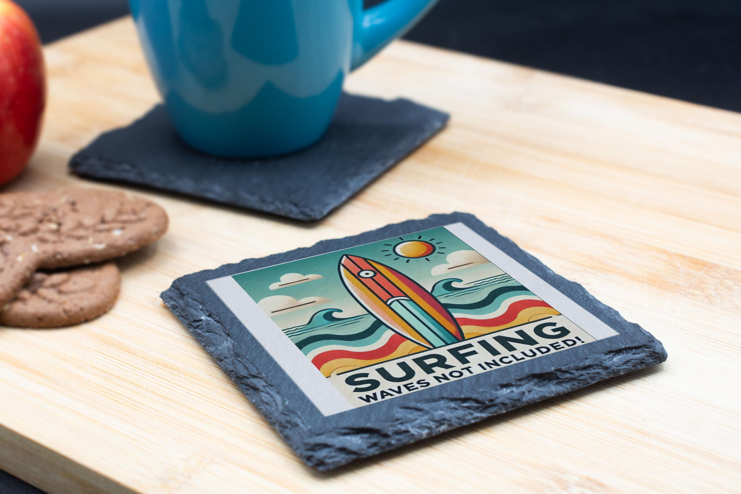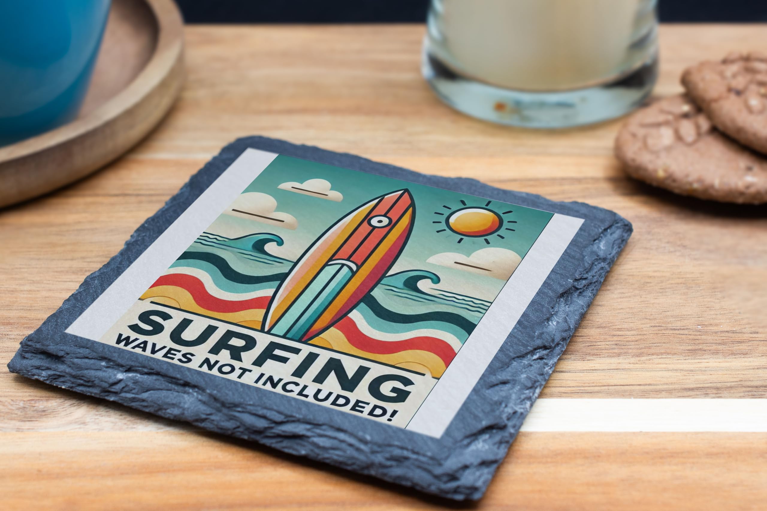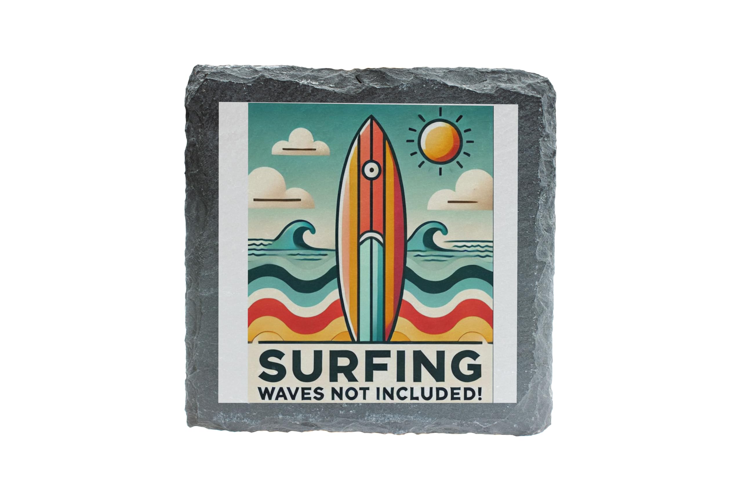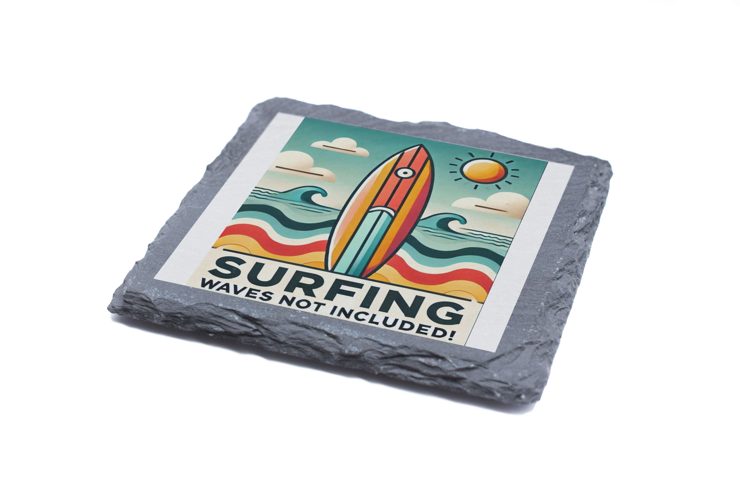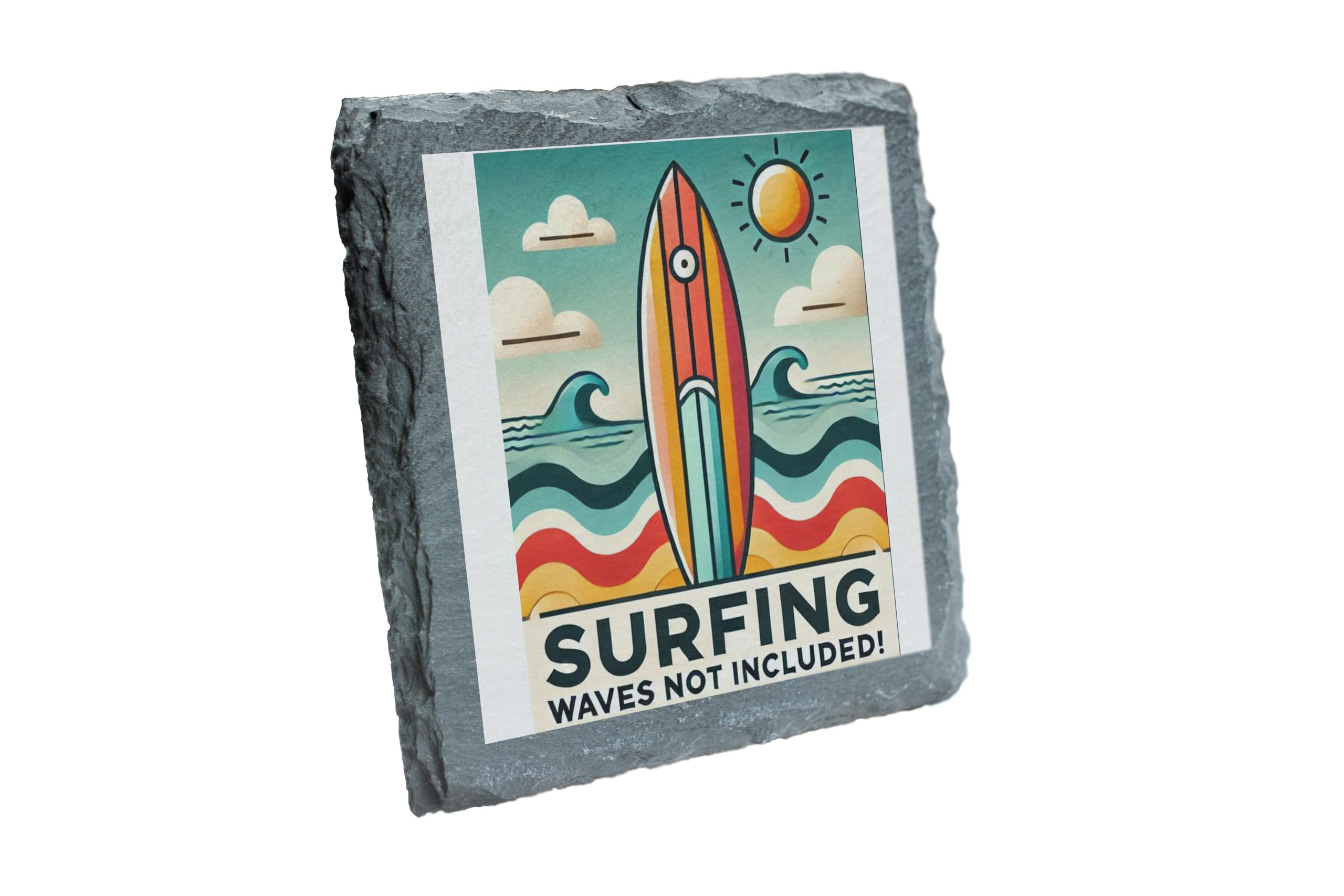 Bring the beach to your home with this vibrant retro-style surfing slate coaster. Showcasing a bold design with waves and a surfboard under a sunny sky, it?s a fun nod to the joys of summer. Whether you?re an avid surfer or a fan of the ocean?s beauty, this coaster adds a touch of coastal charm to any room. Crafted from premium natural slate, this durable coaster not only protects your surfaces but also serves as a decorative statement piece. Perfect for gifting to surf enthusiasts or keeping as a reminder of sunny days at the beach, it?s a must-have for any coastal-inspired collection.