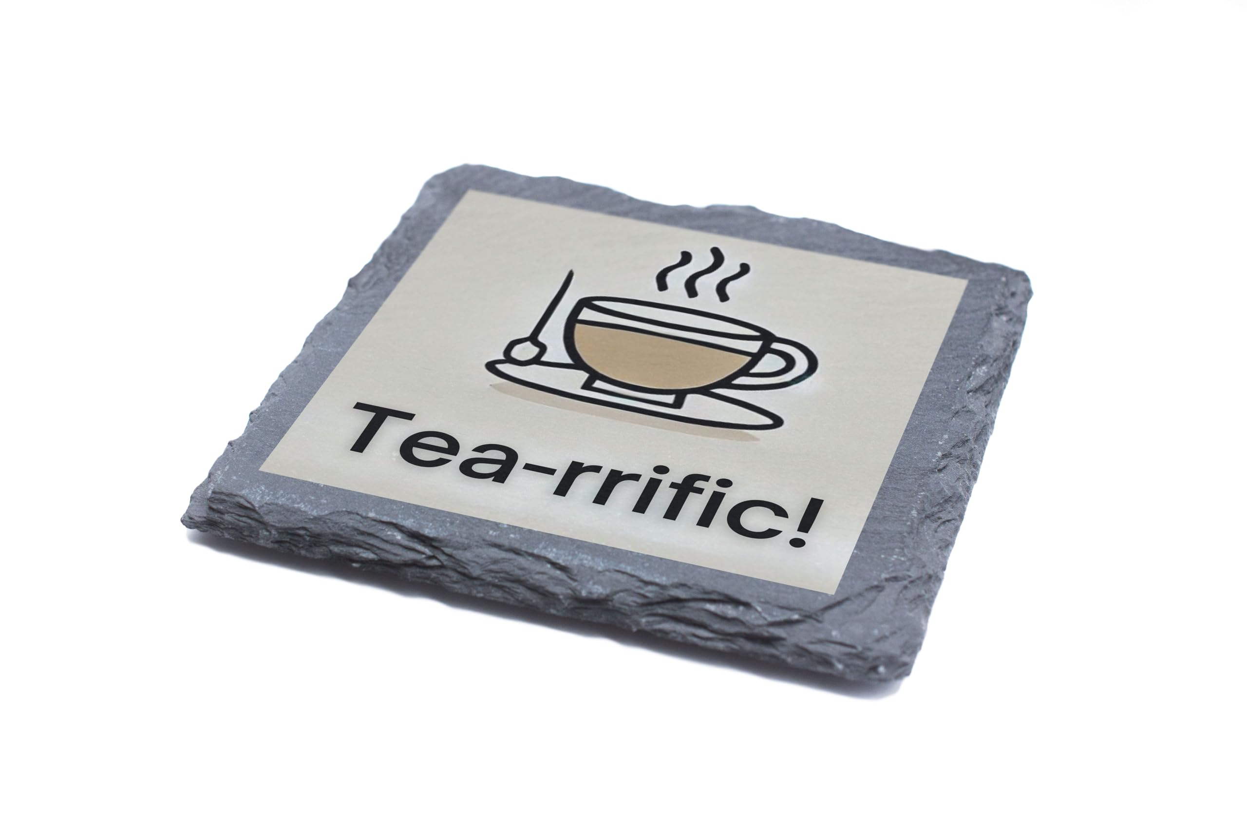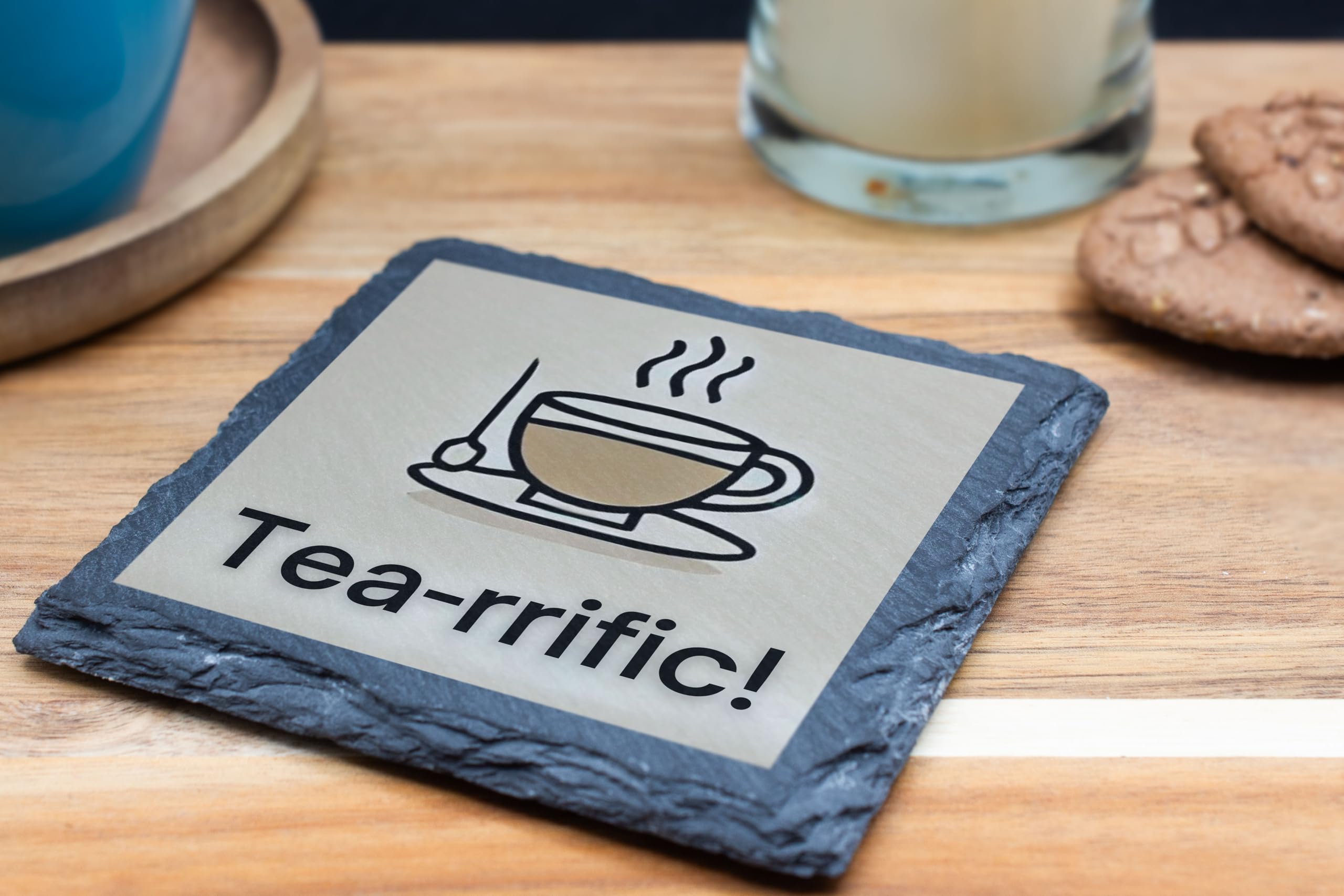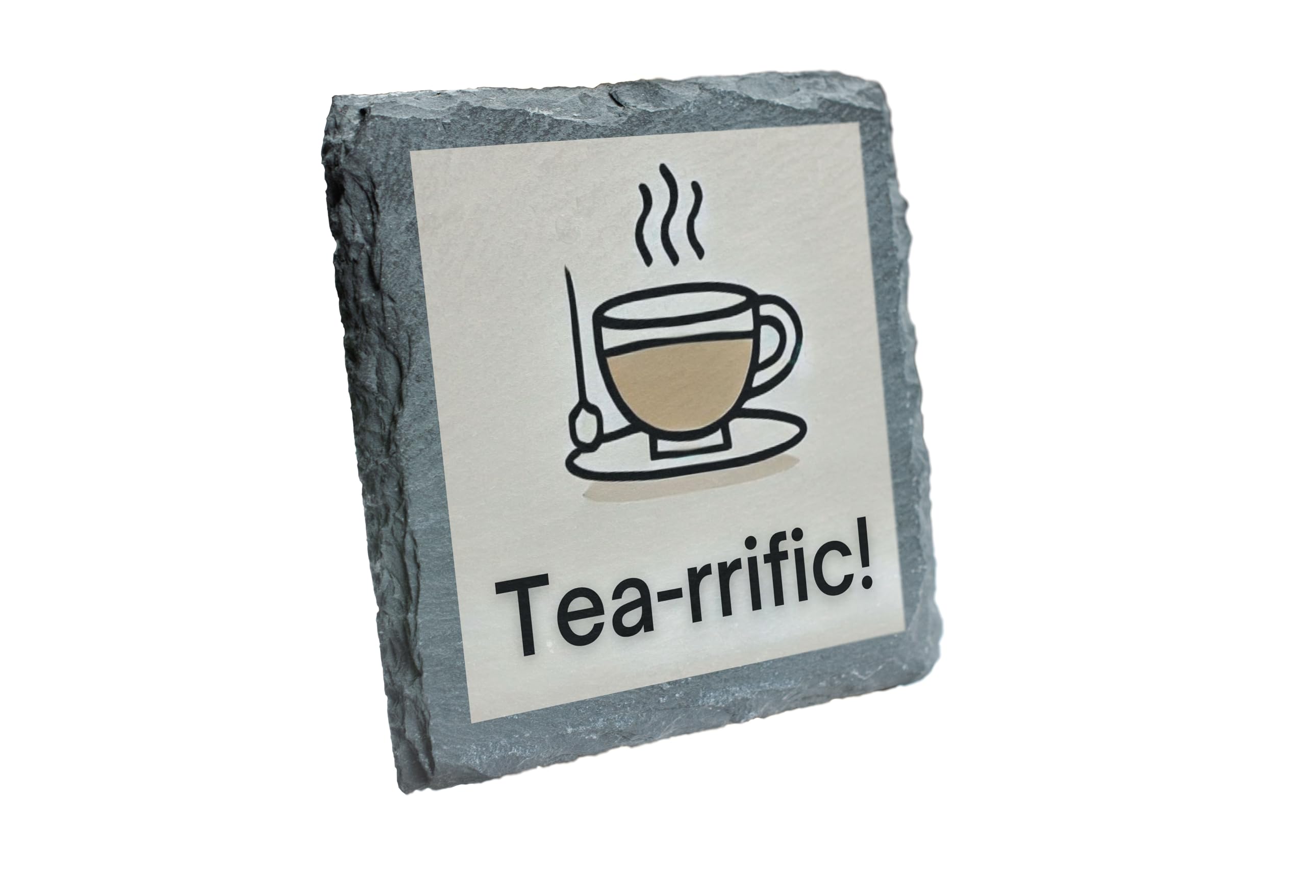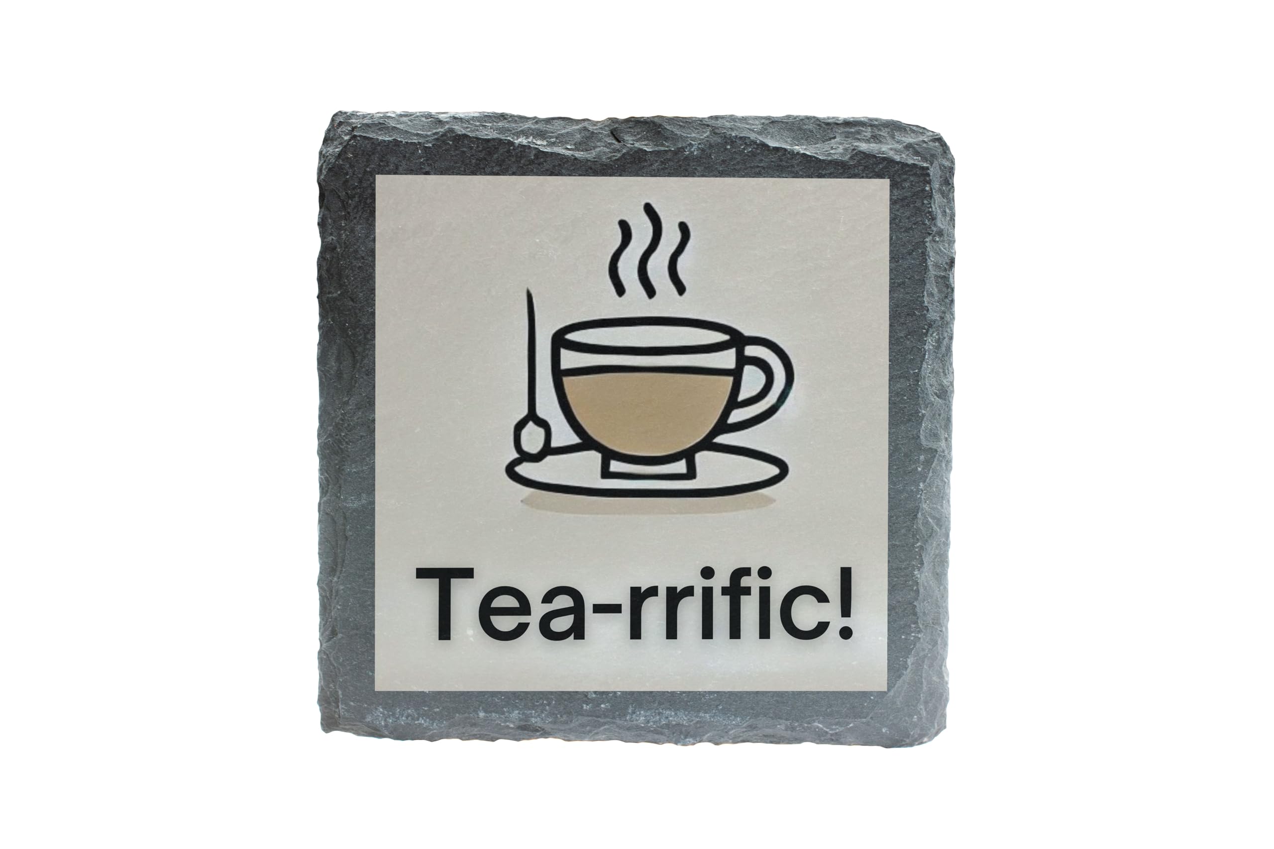 Bring a touch of whimsy and charm to your tea time with the "Tea-rrific" slate coaster. This high-quality coaster is a must-have for tea lovers, combining practicality with a playful design. Made from natural slate, it not only protects your surfaces but also serves as a stylish accessory for your home or office. The sleek design and non-slip backing ensure durability and stability, making it perfect for daily use or as a decorative piece. Whether you're enjoying a solo cup of tea or hosting a tea party, this coaster is sure to be a conversation starter. Gift it to your favorite tea enthusiast or keep it for yourself ? either way, it's a tea-rrific addition to any tea lover's collection!