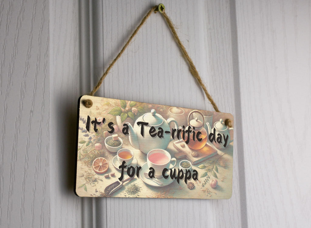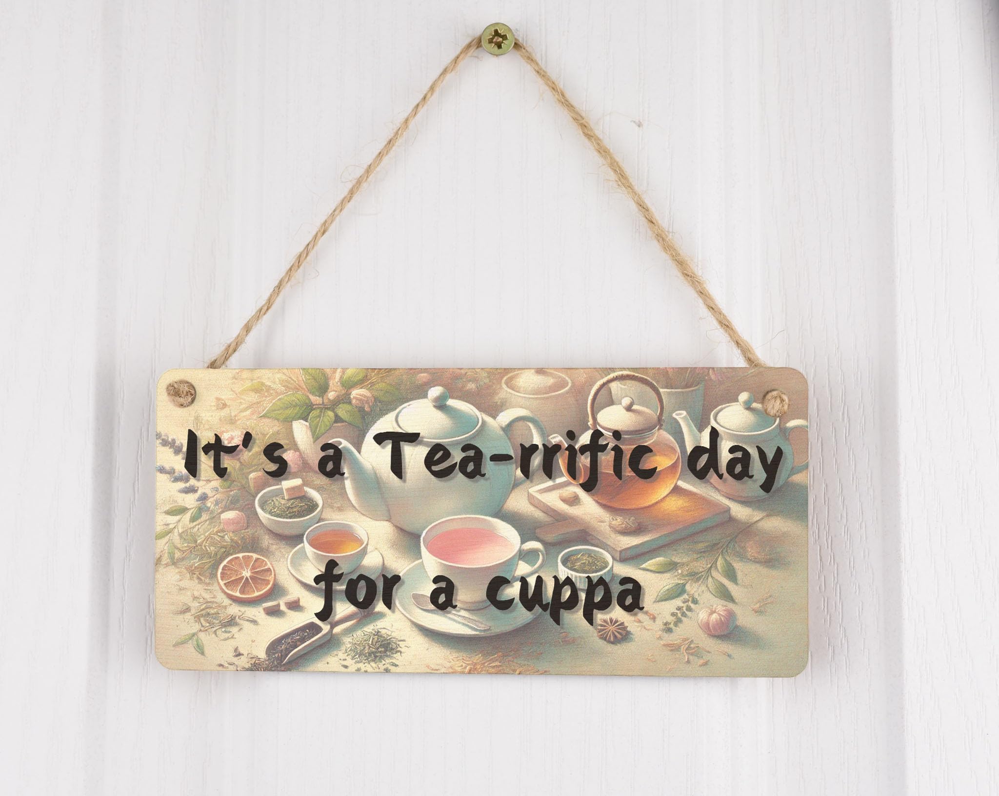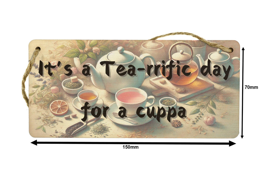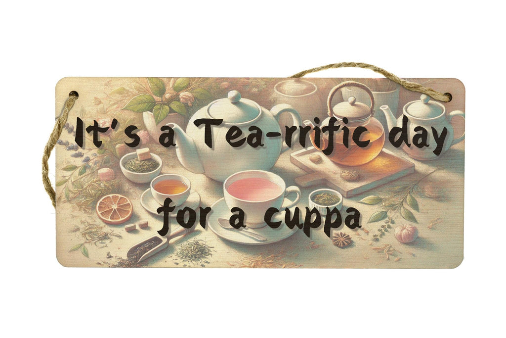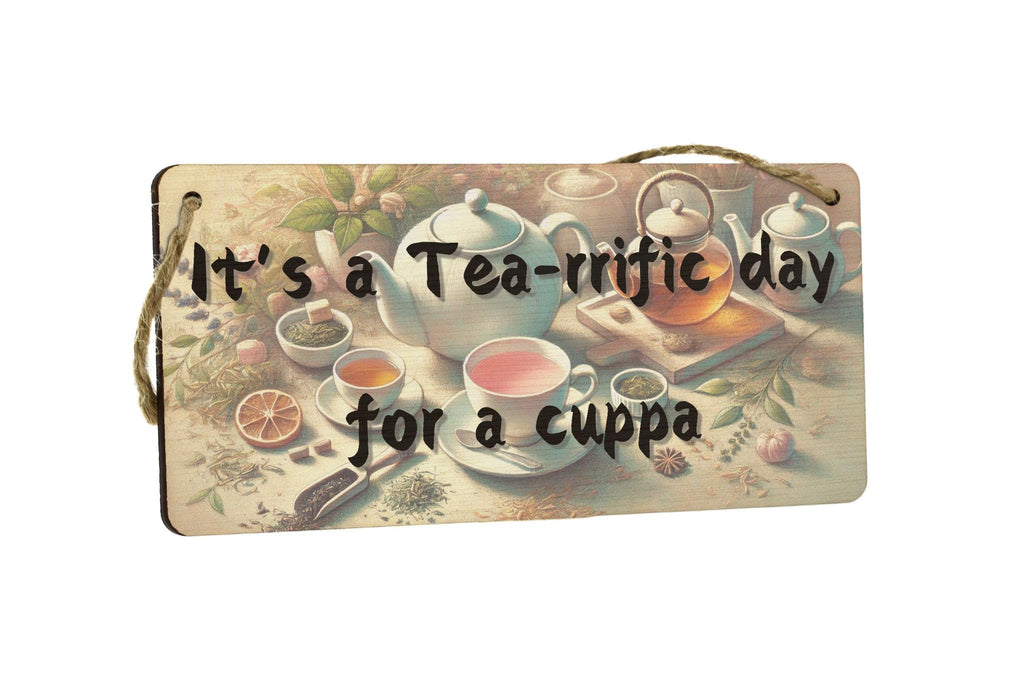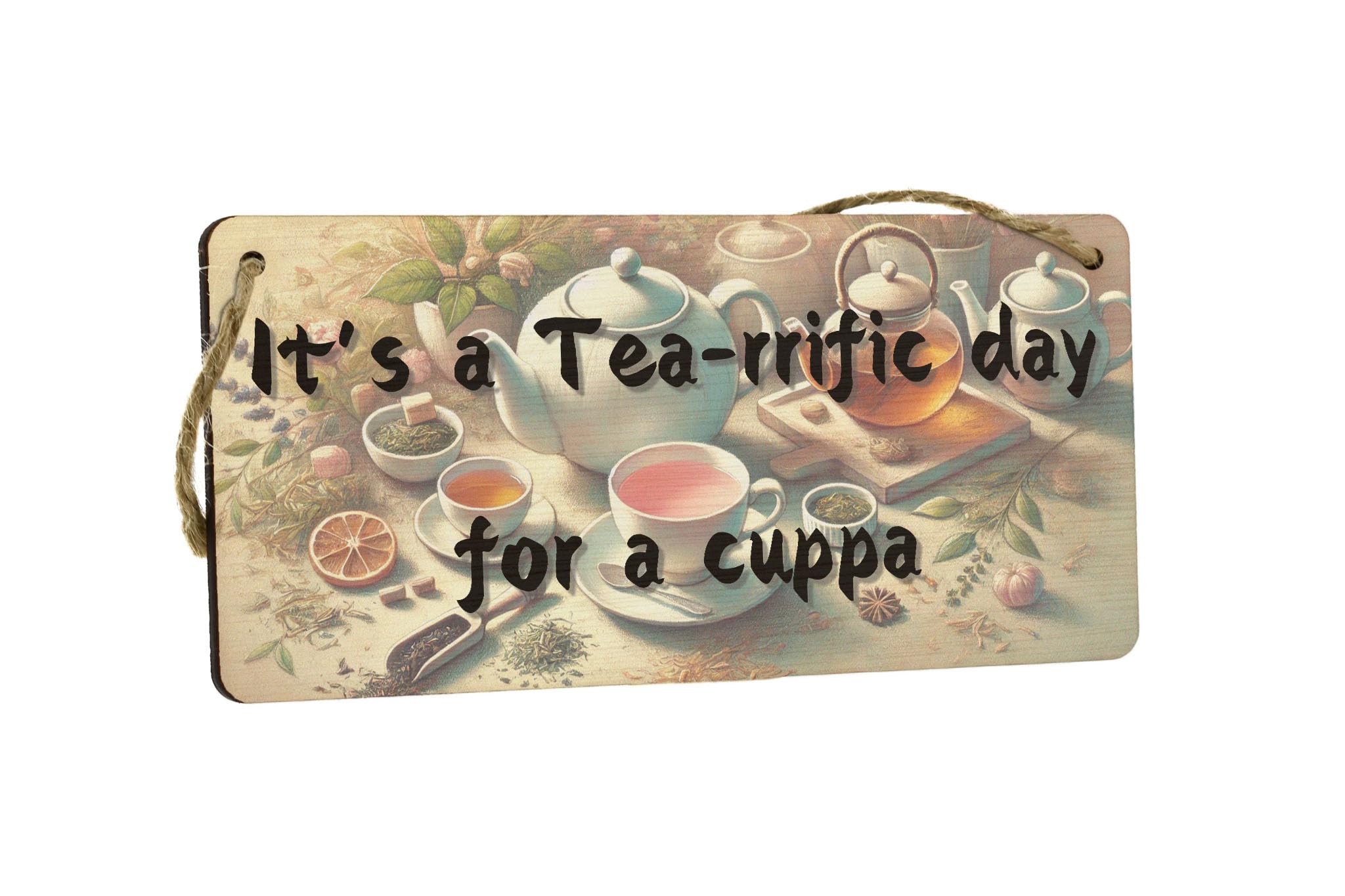 - Punny phrase 'It's a teariffic day for a cuppa' adds a playful and inspirational touch to your home decor