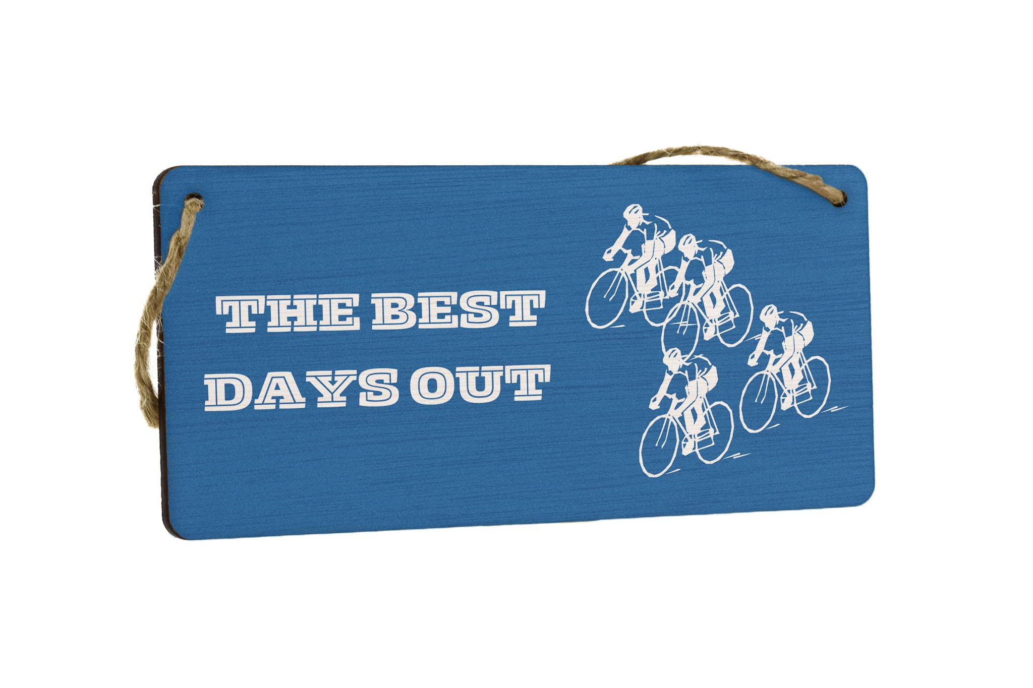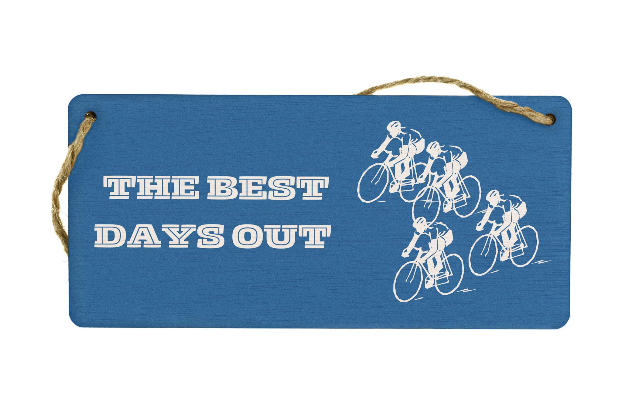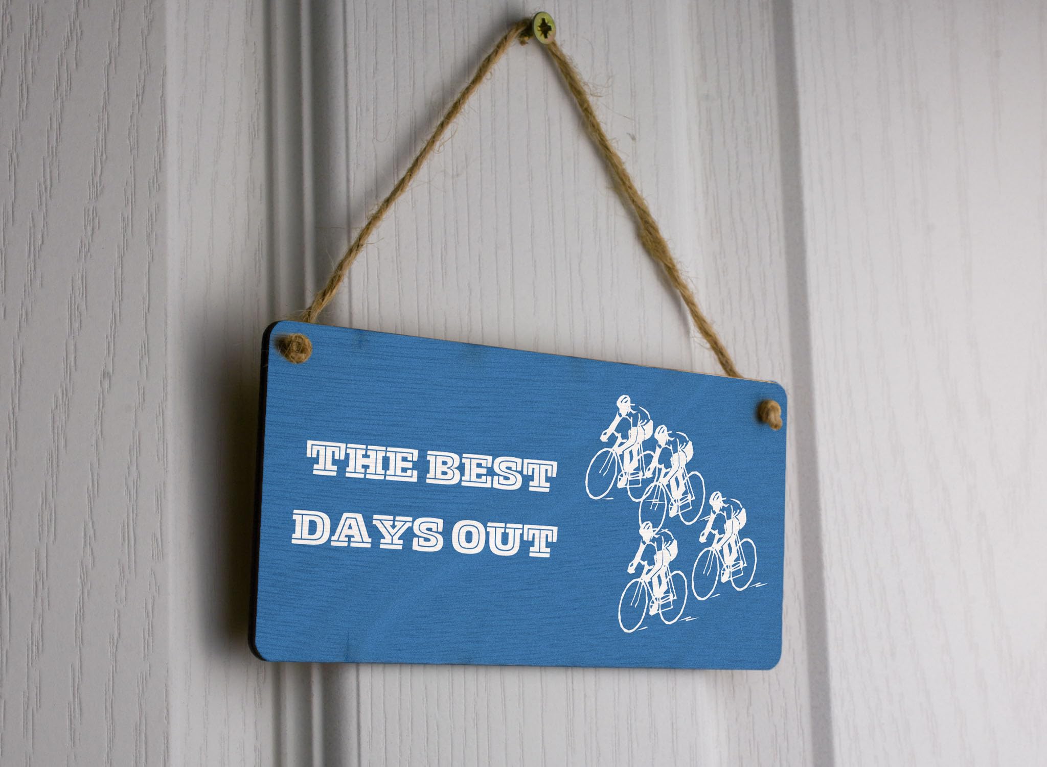 - High-quality plywood sign featuring white cyclist images on a vibrant blue background with the words 'The Best Days Out' written in elegant white font.