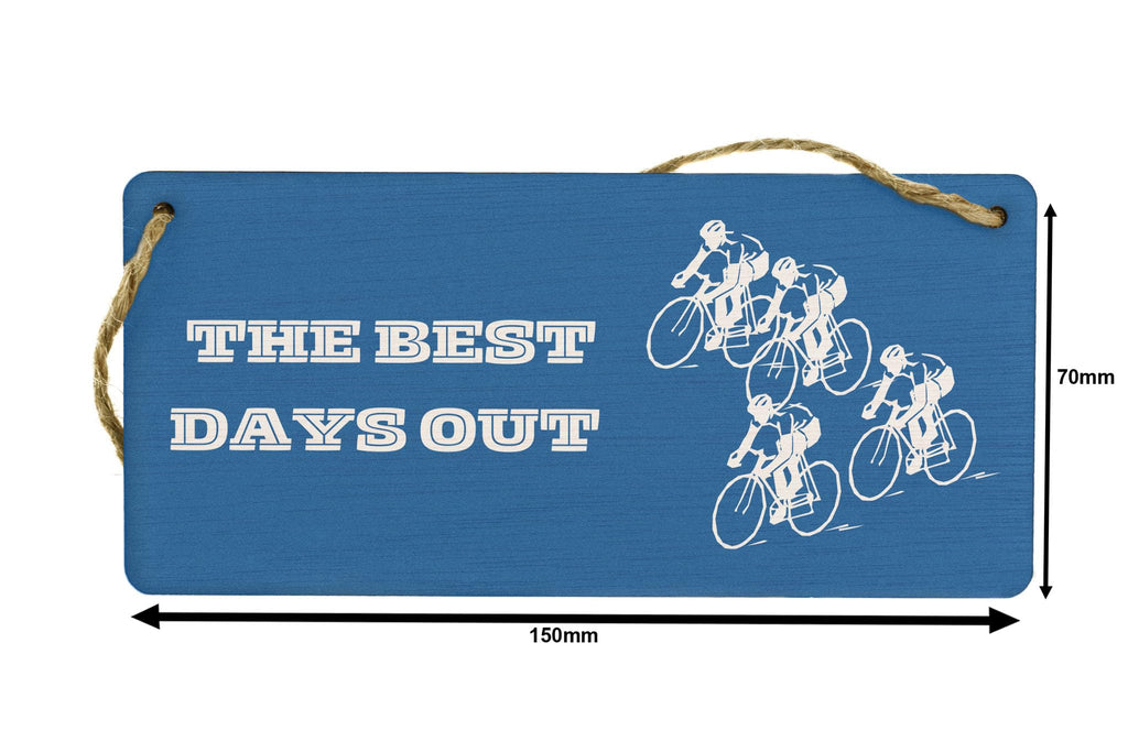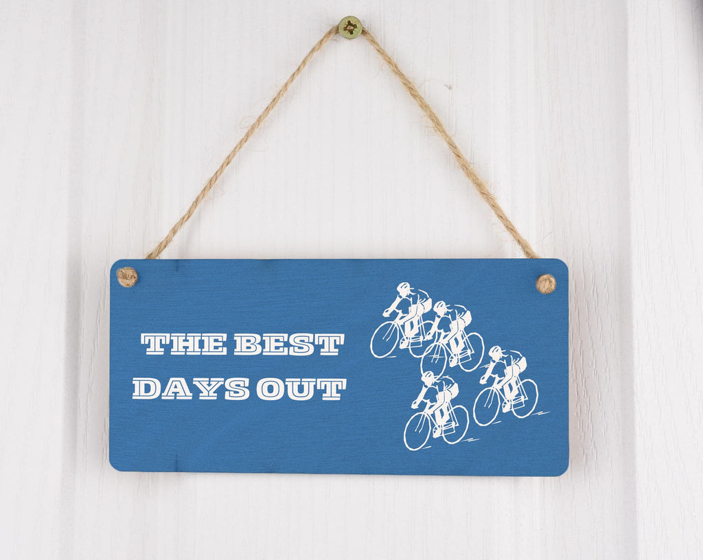Introducing our Plywood Hanging Sign - The Best Days Out! This novelty bike racing gift is perfect for friends and family who are avid cyclists. Whether it's for your wife, husband, girlfriend, boyfriend, son, daughter, siblings, parents, or grandparents, this sign is sure to bring a smile to their face. The sign is made from quality plywood and features white cyclist images on a vibrant blue background, along with the words 'The Best Days Out' written in elegant white font. Hang it on your garage door or in any room to showcase your love for cycling and add a touch of personality to your space. This versatile sign makes for a thoughtful and unique present for any occasion, be it a birthday, anniversary, or just to show someone you care. It is the perfect addition to any cycling enthusiast's collection!