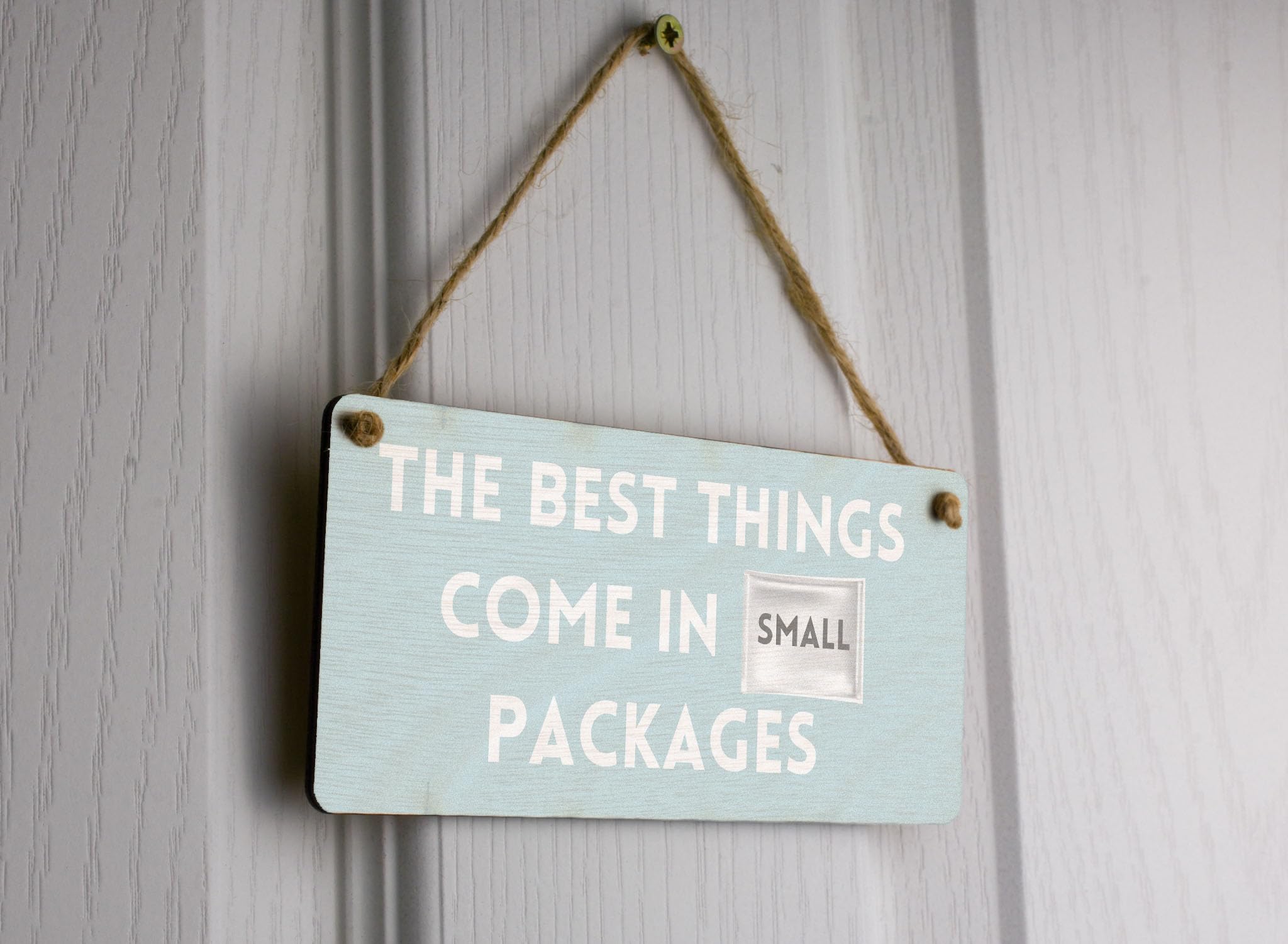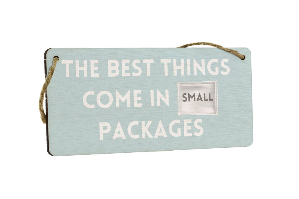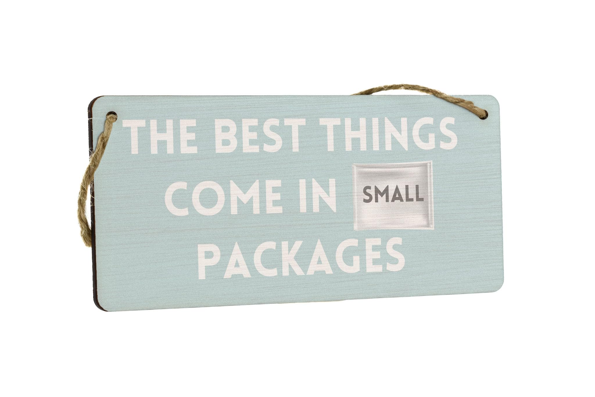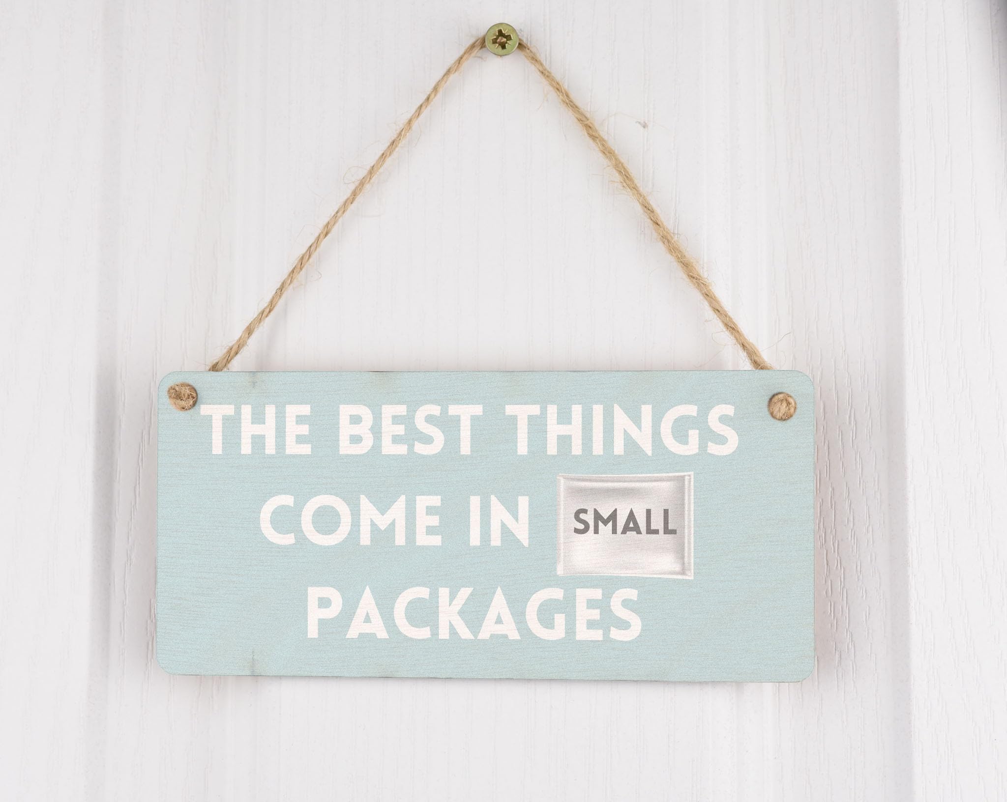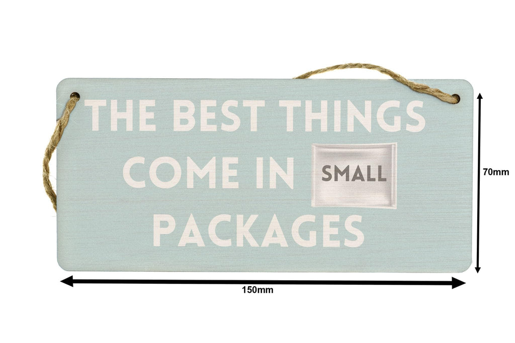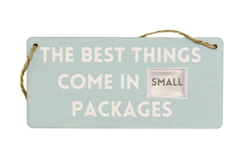 The Best Things Come in Small Packages - Funny Novelty Plywood Hanging Room Sign (smlsgn-ha23-smallpack)