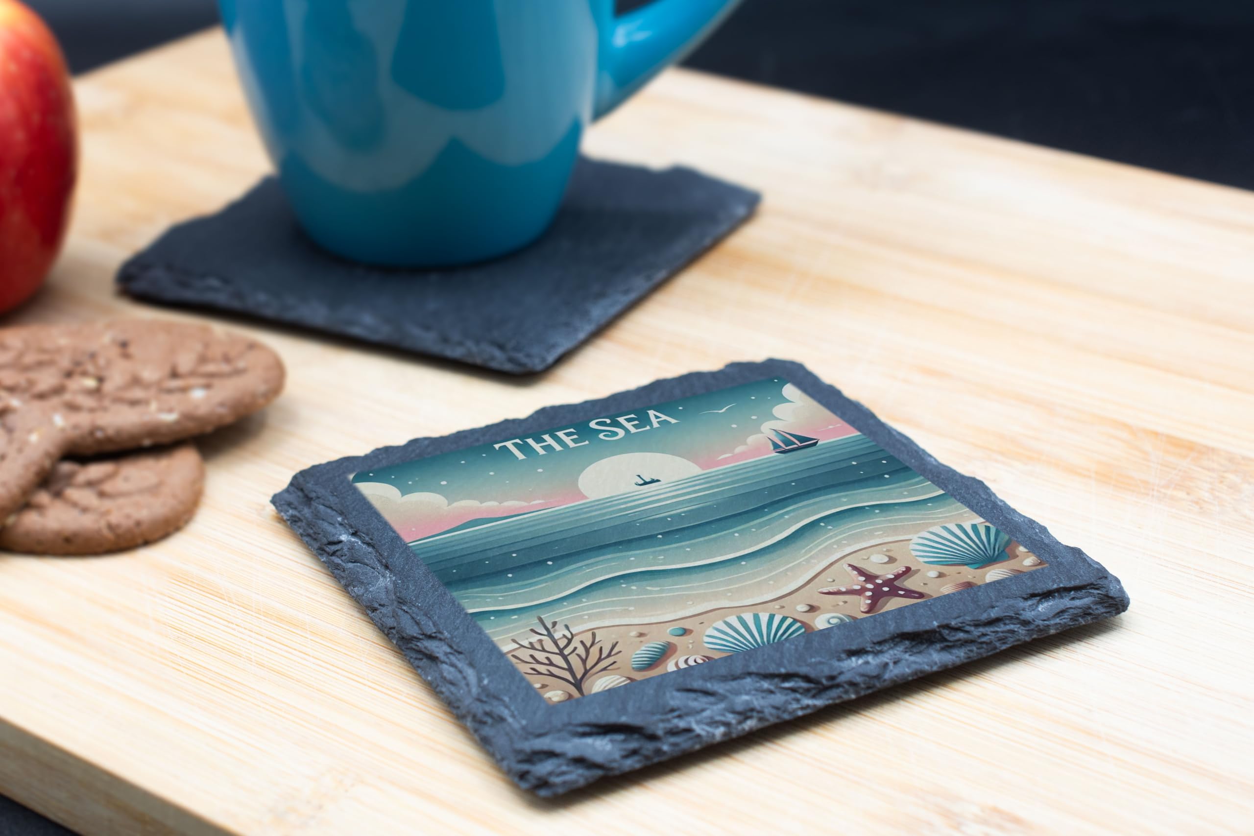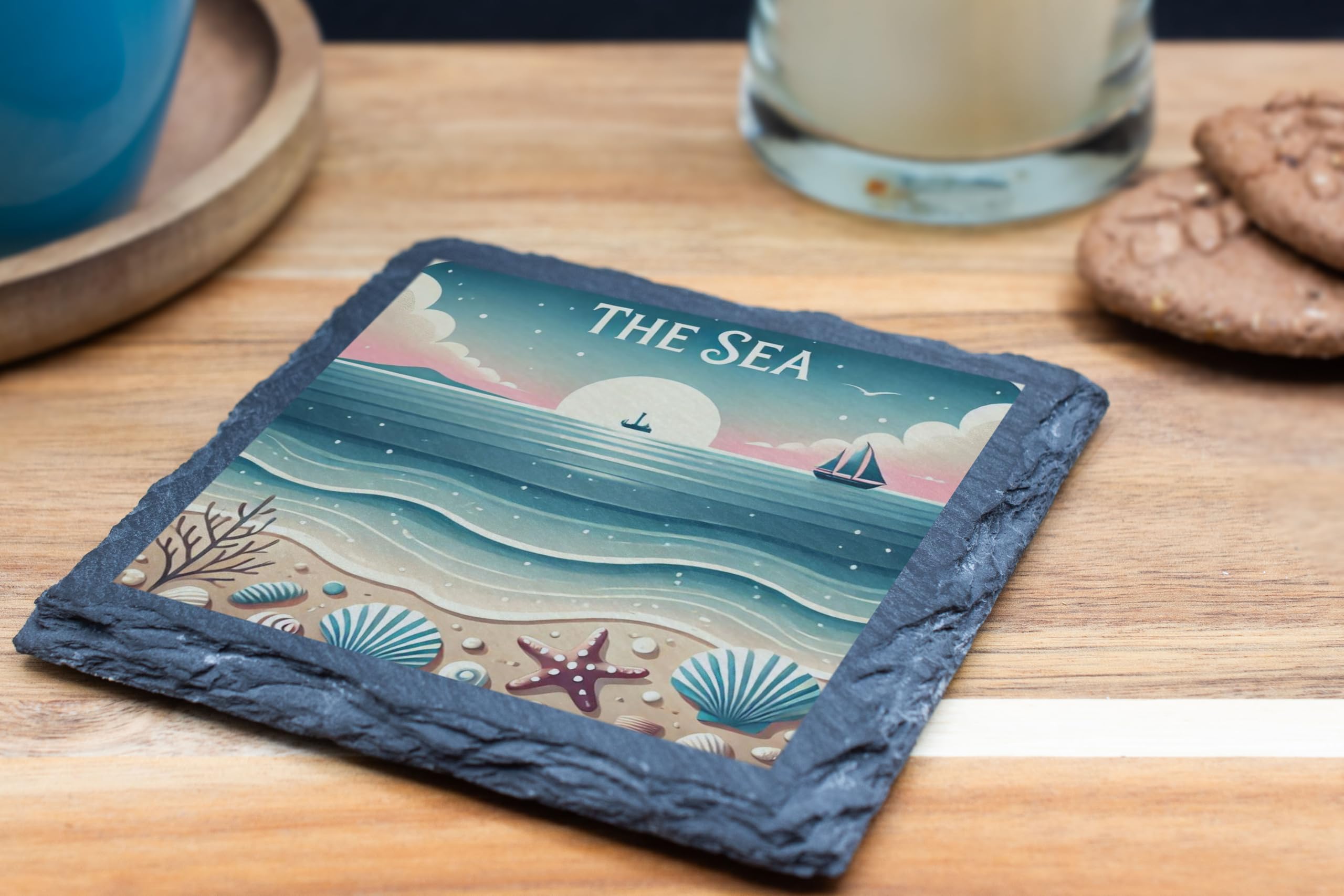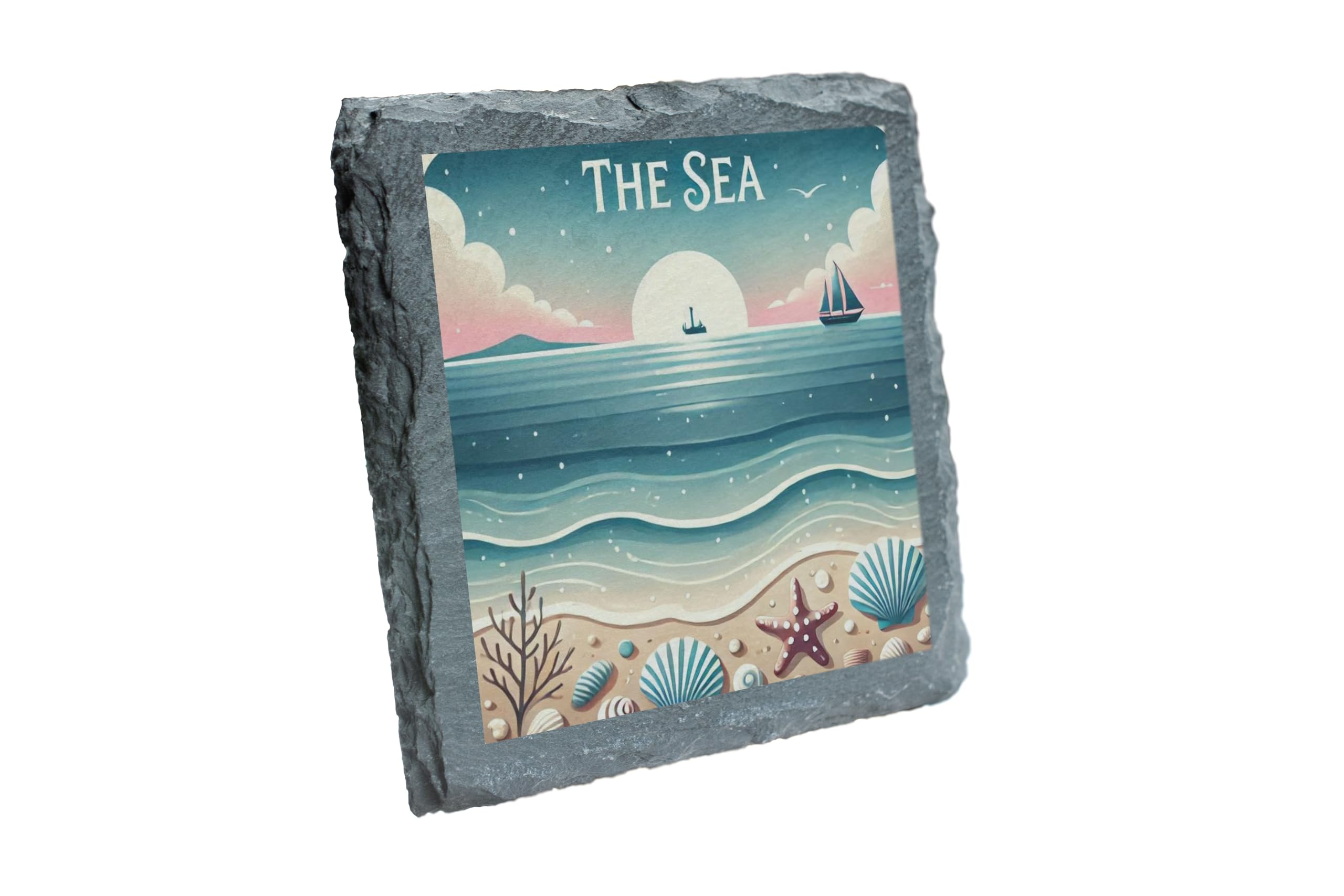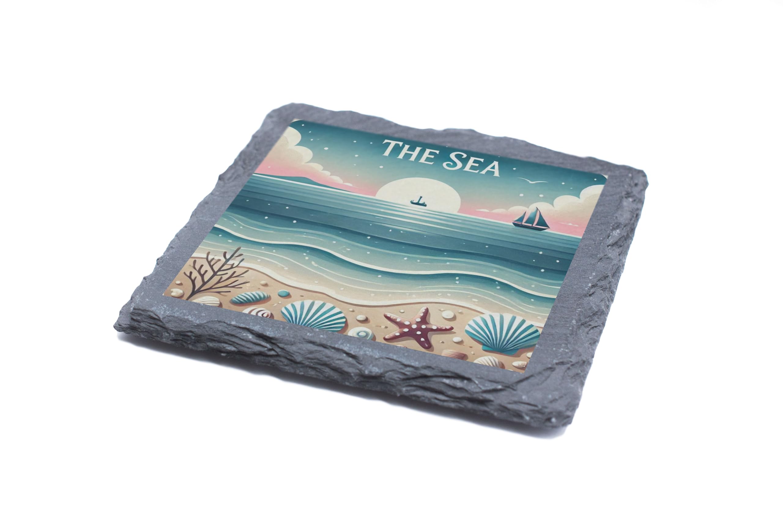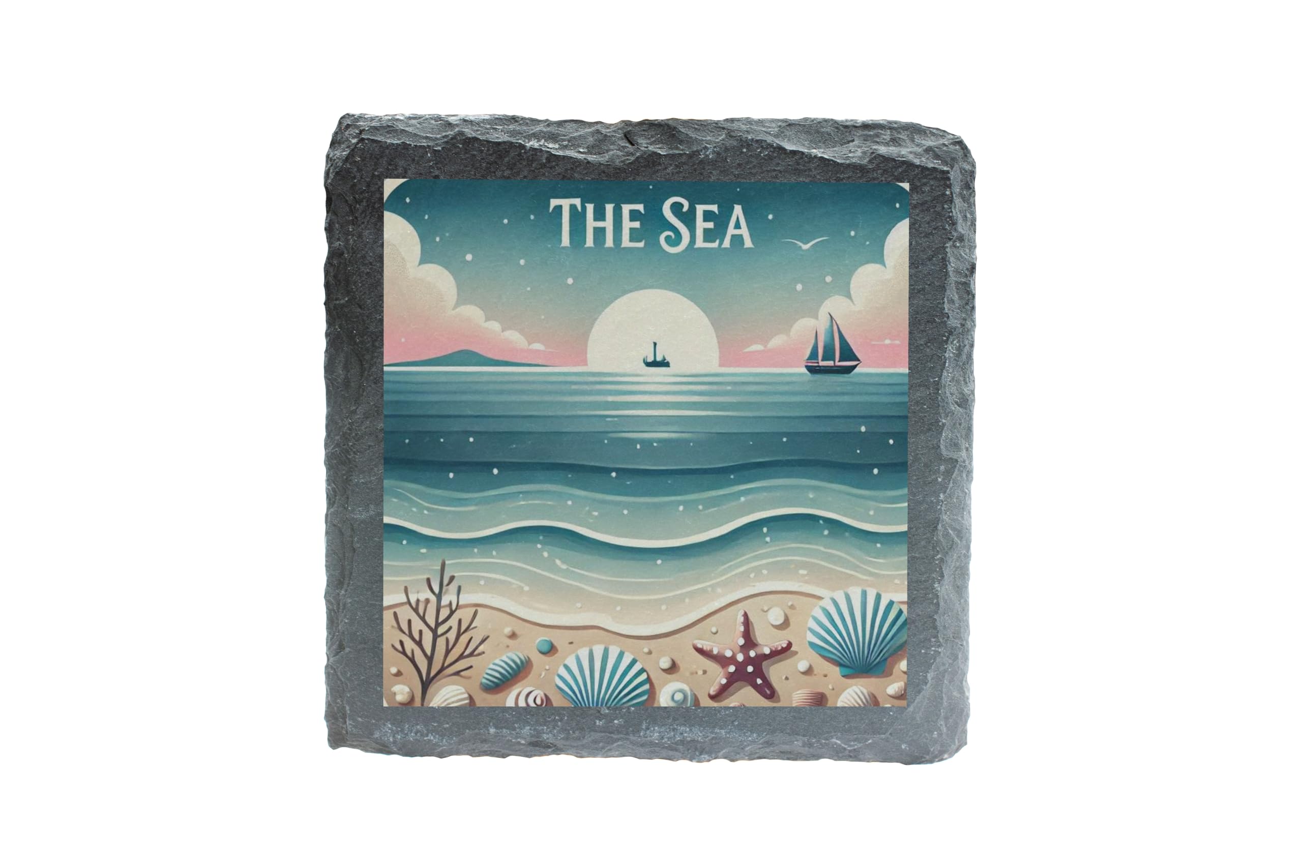 Bring the tranquility of the sea into your home with "The Sea" Coastal Slate Coaster. This elegant coaster showcases a serene coastal scene featuring soft pastel waves, seashells, and a picturesque sunset. Its timeless design evokes the peace and beauty of the beach, making it a perfect addition to any room. Crafted from durable natural slate, this coaster provides both functionality and style. It protects your surfaces from spills and scratches while its unique artwork adds a coastal flair to your decor. The high-quality print ensures vibrant, fade-resistant colors that will last. Whether you're looking for a charming gift for a loved one or a decorative accent for your home, this slate coaster is an excellent choice for capturing the beauty of the sea.
