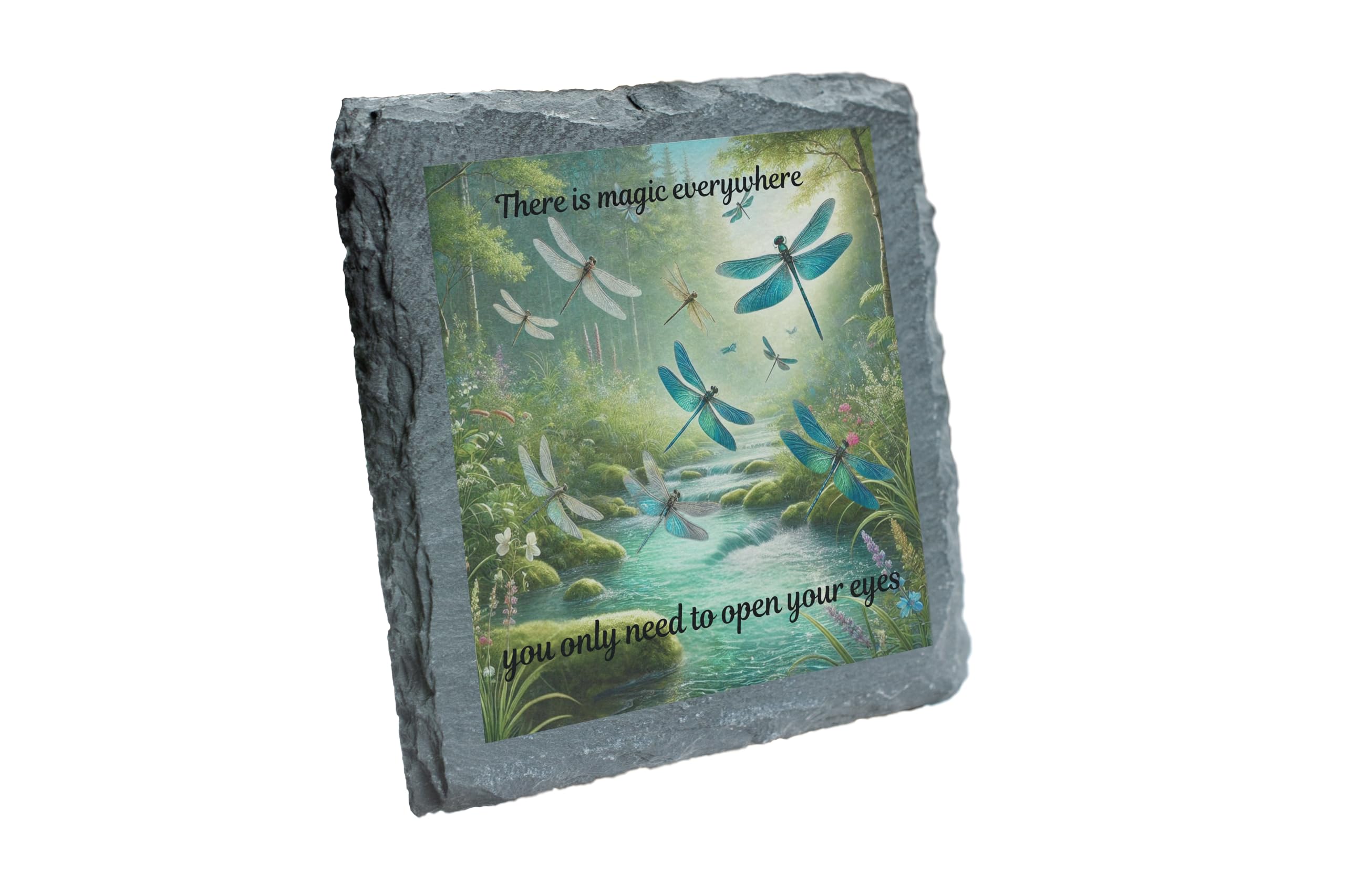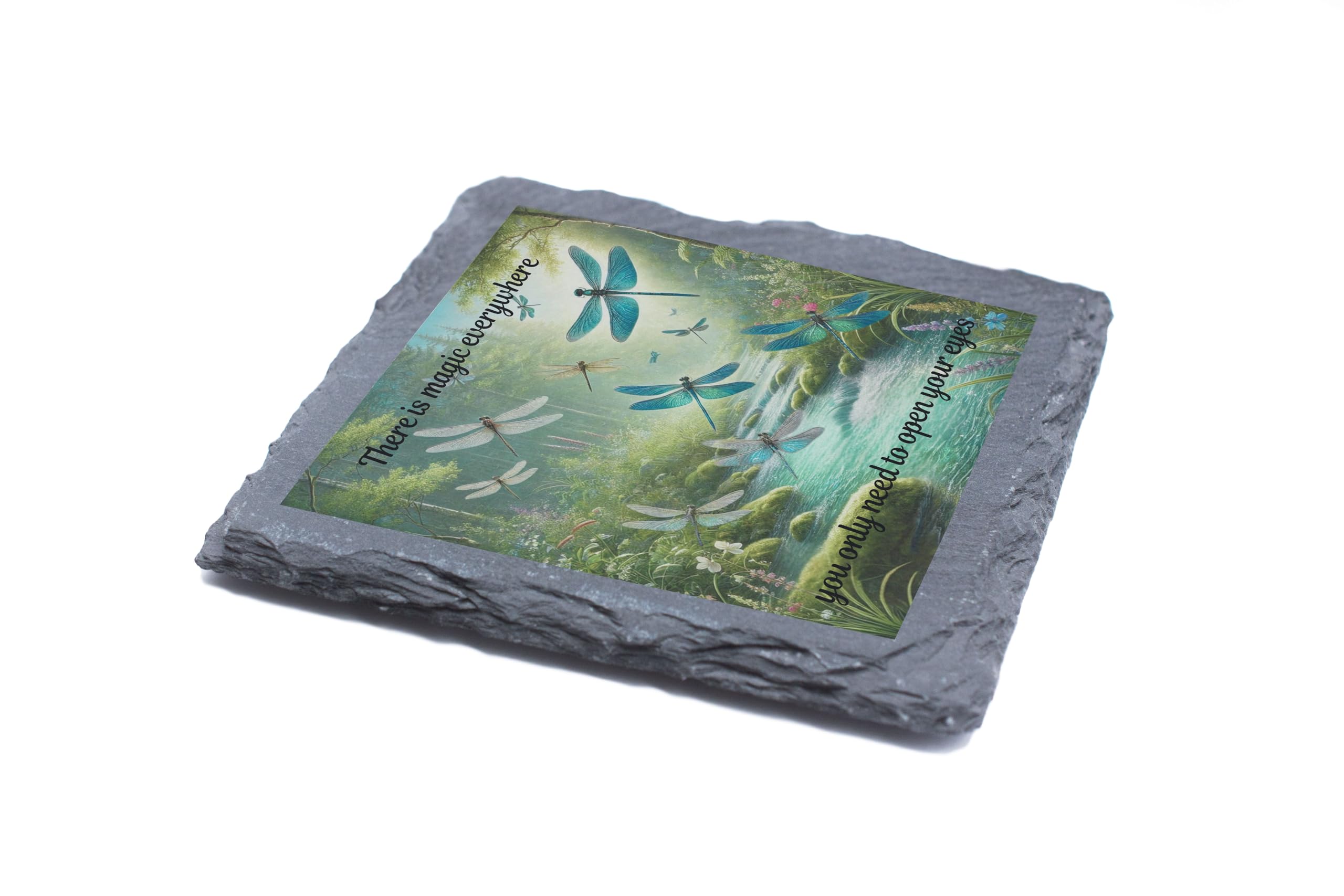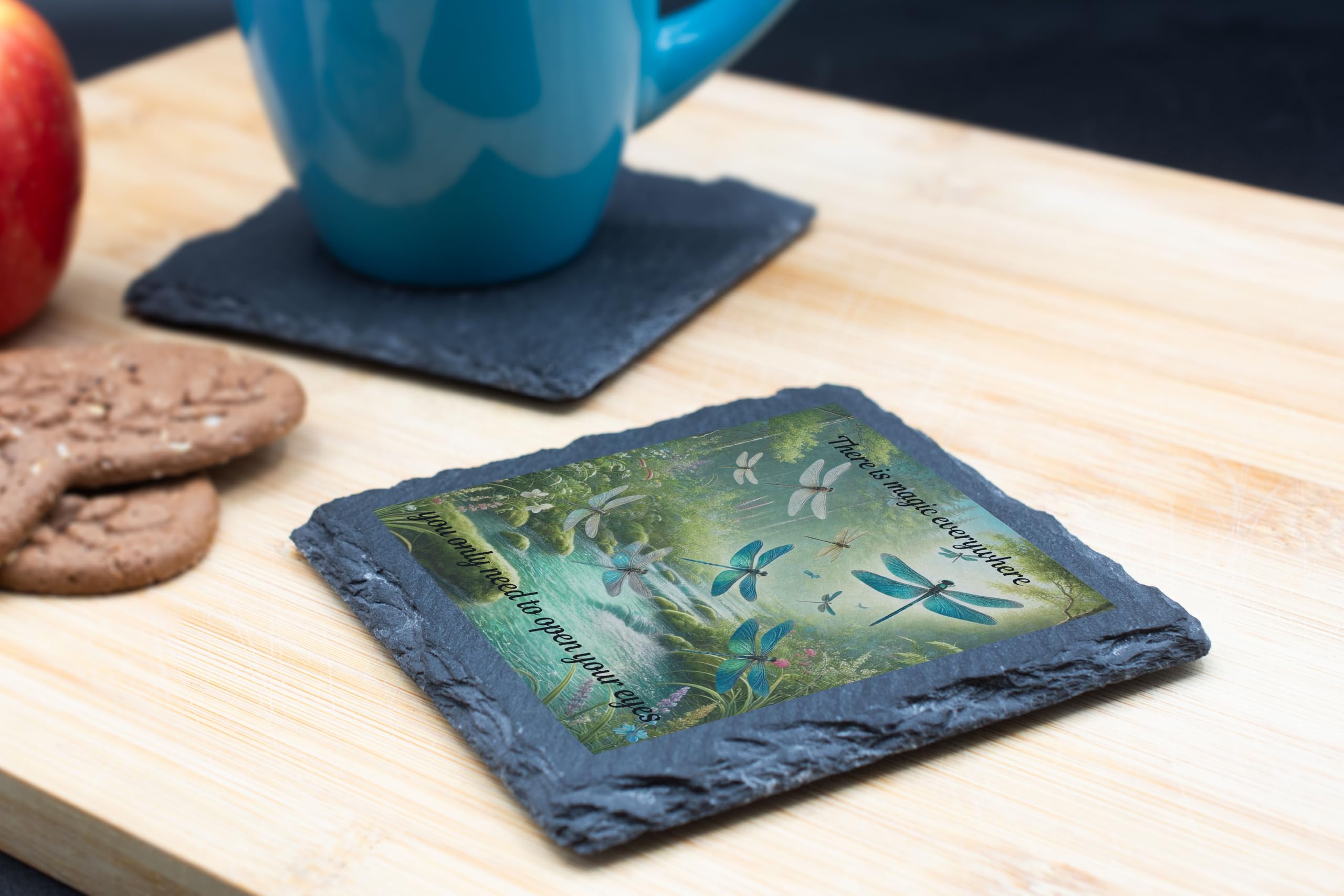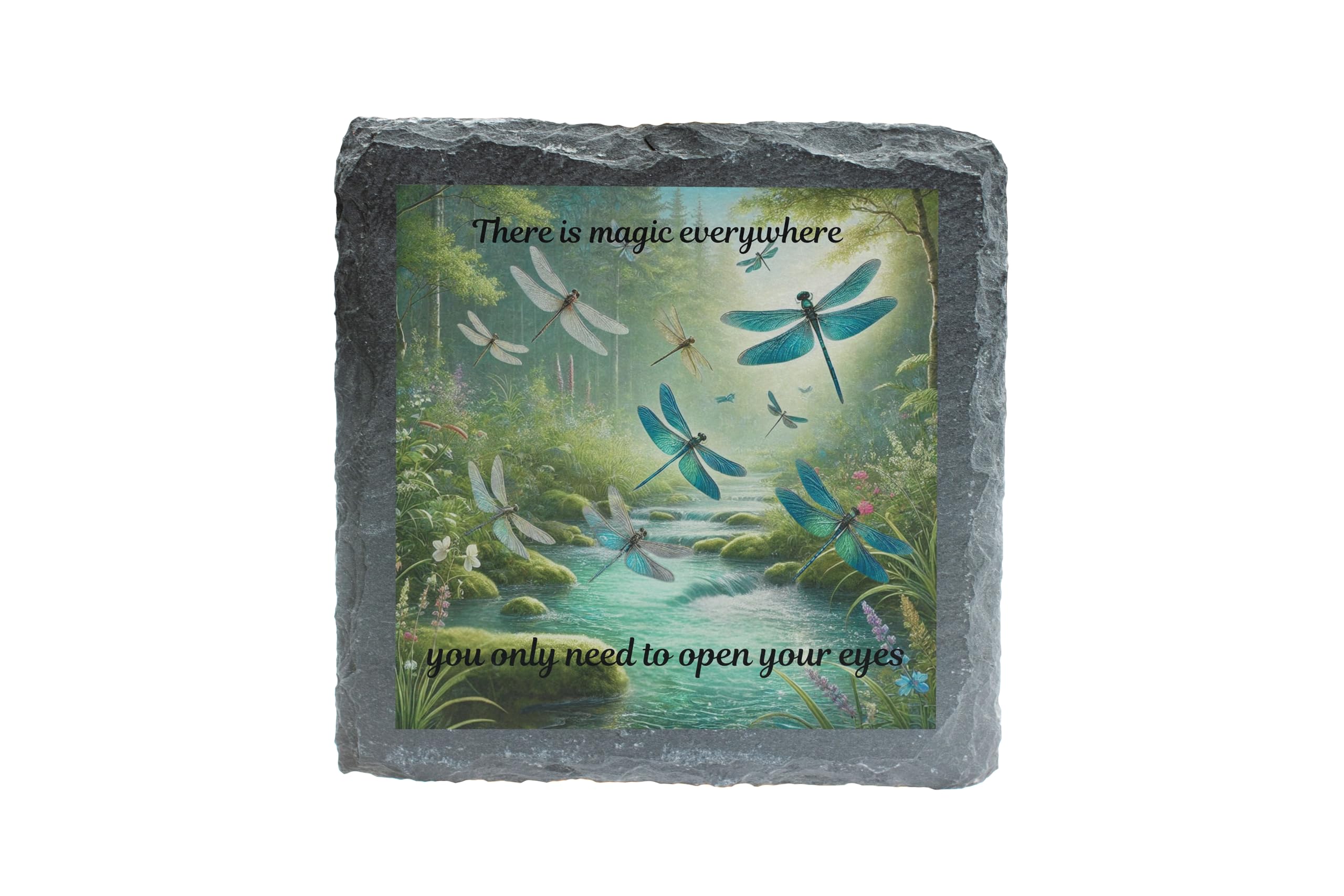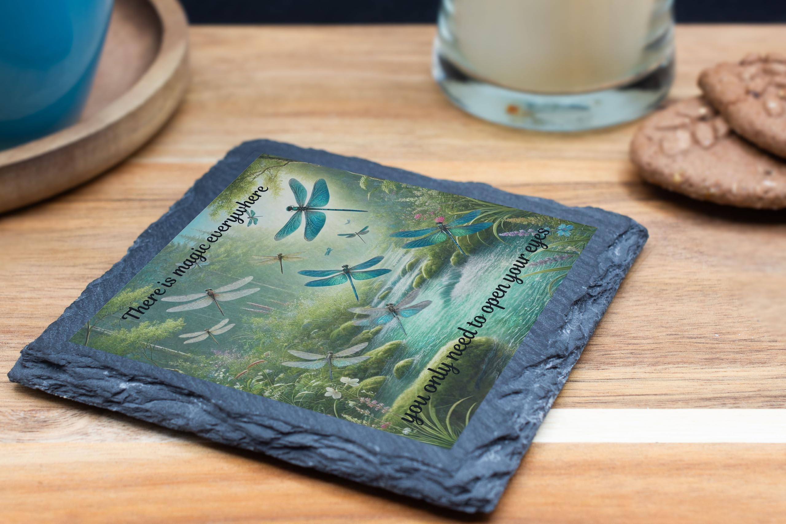 Add a touch of enchantment to your home with the "There is Magic Everywhere" slate coaster. This beautifully crafted coaster showcases a captivating dragonfly design set against a lush, serene background, paired with the uplifting quote, "There is magic everywhere; you only need to open your eyes." Made from high-quality natural slate, this coaster not only protects your surfaces but also serves as a stunning decorative piece. Its intricate design and inspiring message make it perfect for creating a cozy, positive atmosphere in any space. Whether for personal use or as a thoughtful gift, this coaster is an excellent choice for those who love nature and appreciate life?s little magical moments.