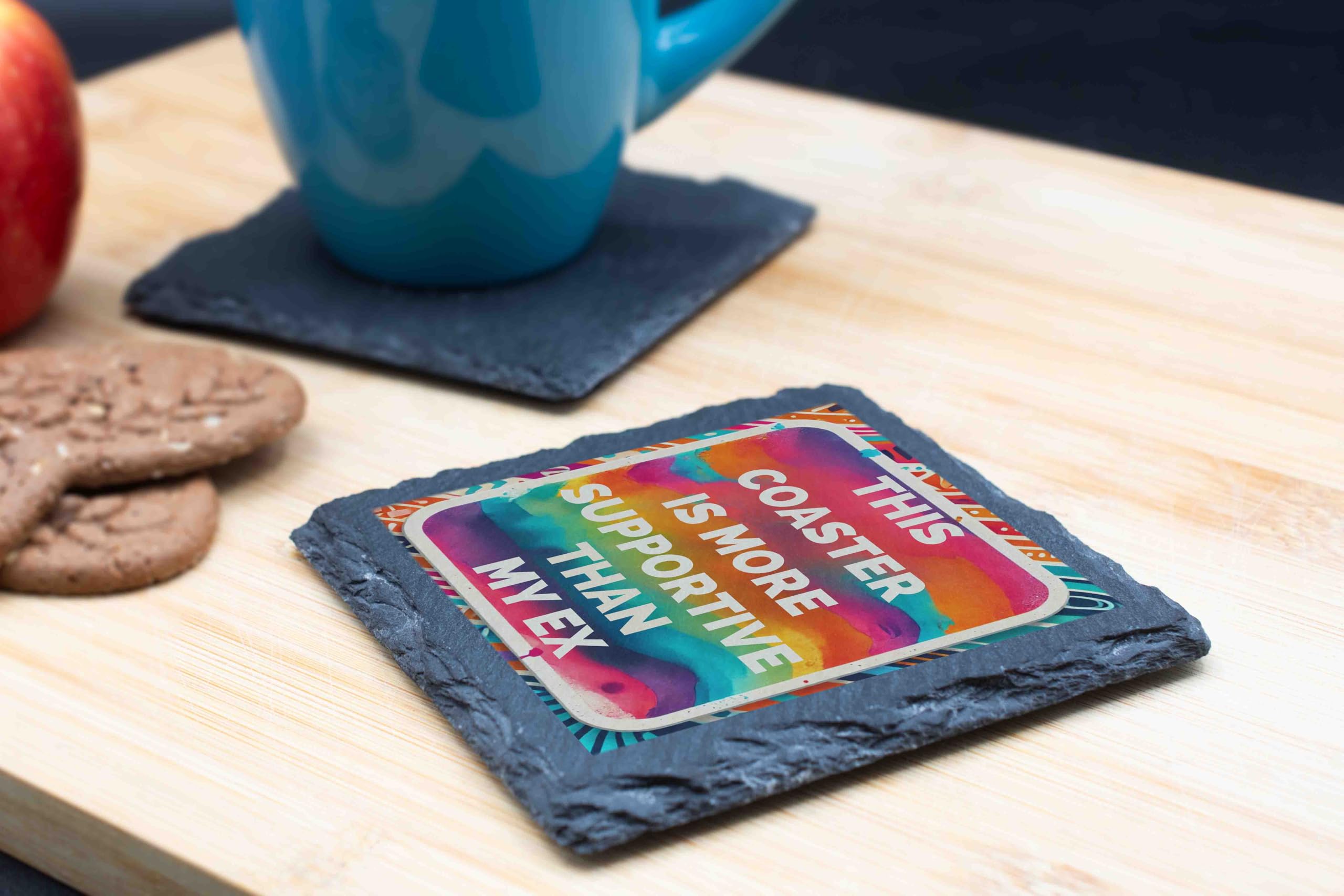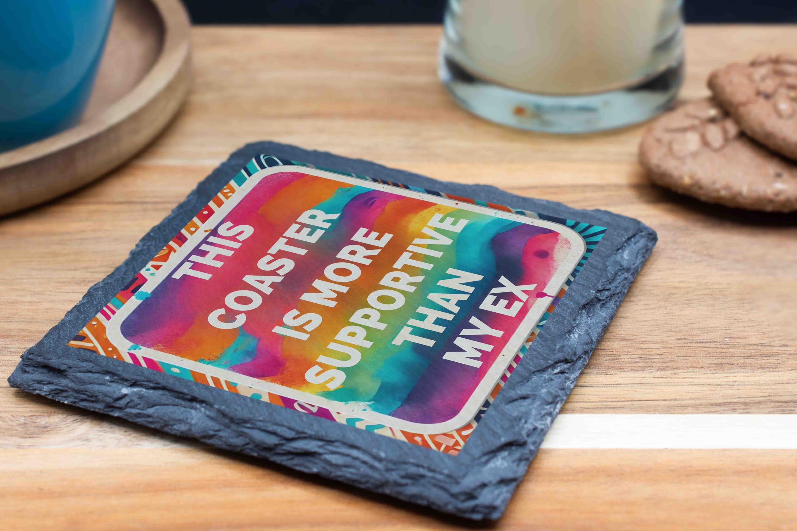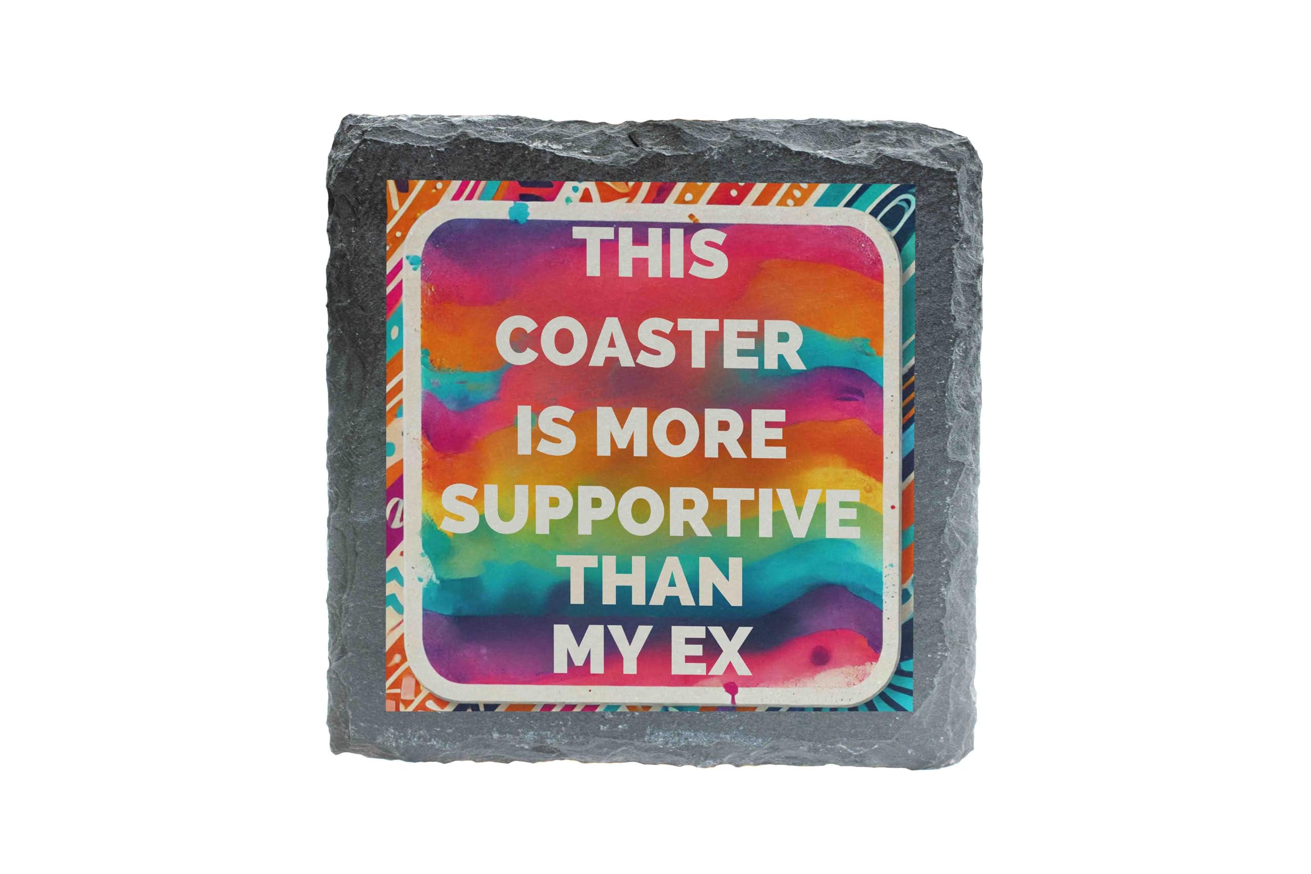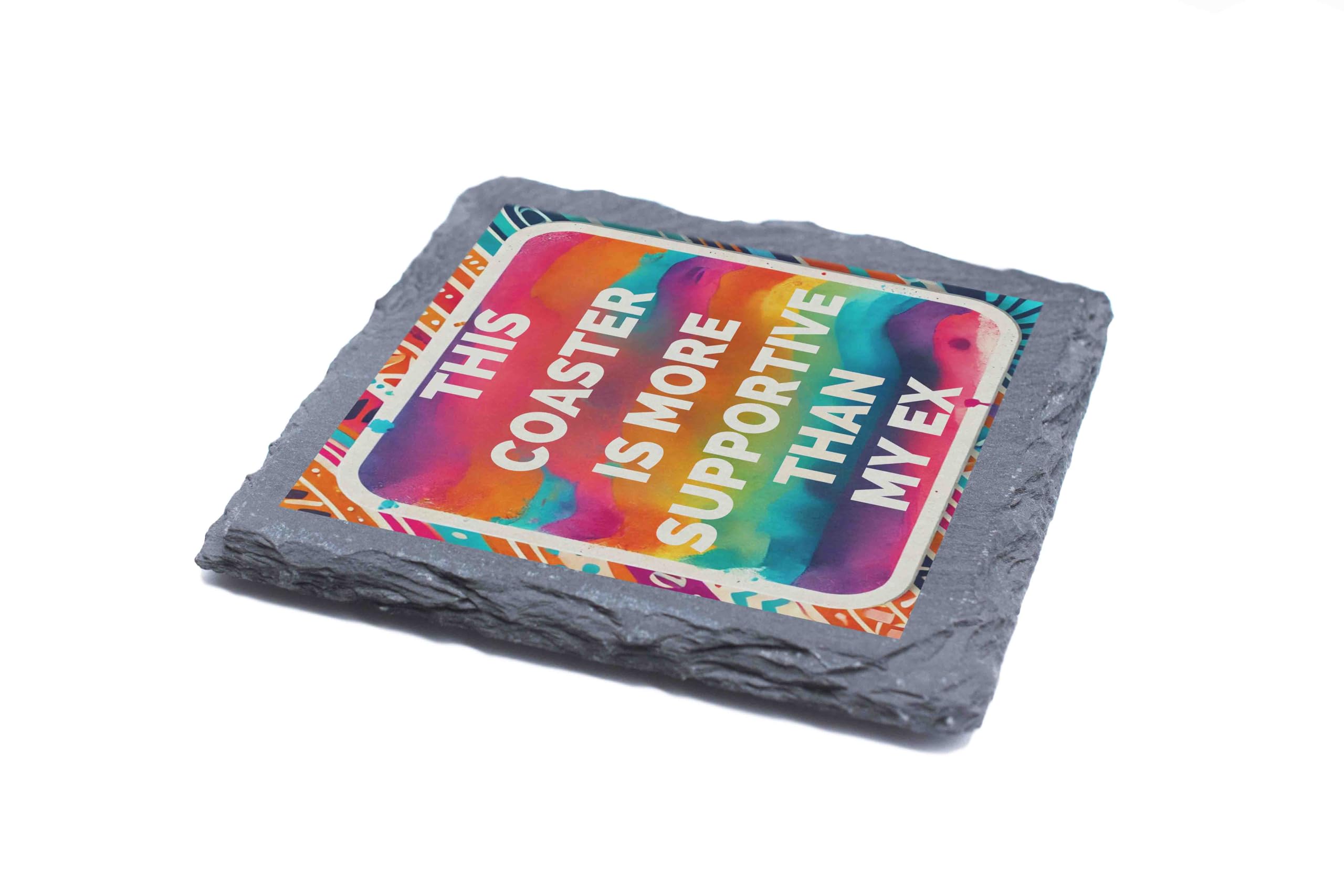 Bring a smile to your table with the "This Coaster Is More Supportive Than My Ex" Slate Coaster. Featuring a colorful, watercolor-inspired background and a cheeky phrase, this coaster is the perfect blend of humor and style. Ideal for coffee tables, desks, or bars, it?s a practical accessory that?s guaranteed to start conversations. Crafted from high-quality natural slate with rugged edges, this coaster combines durability with a playful aesthetic. It protects your surfaces from heat, moisture, and scratches while adding a pop of color to your d?cor. Whether as a lighthearted gift or a personal addition to your space, this coaster is sure to deliver both laughs and practicality!