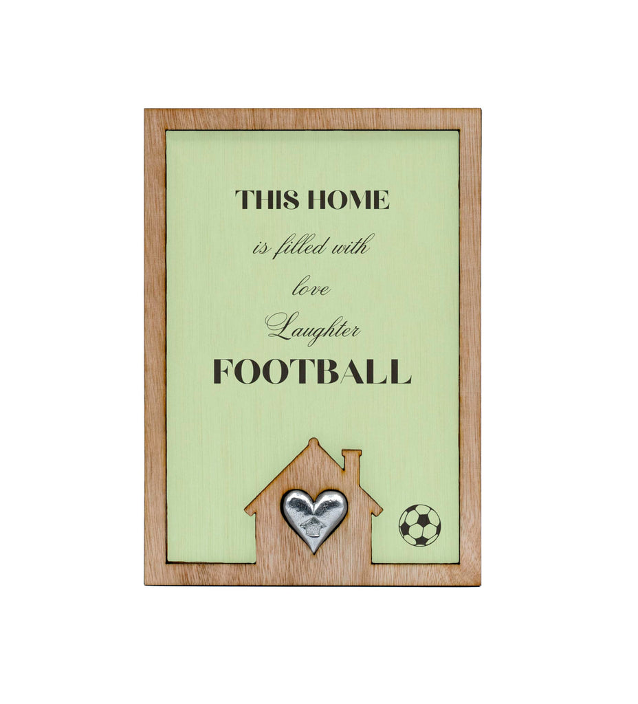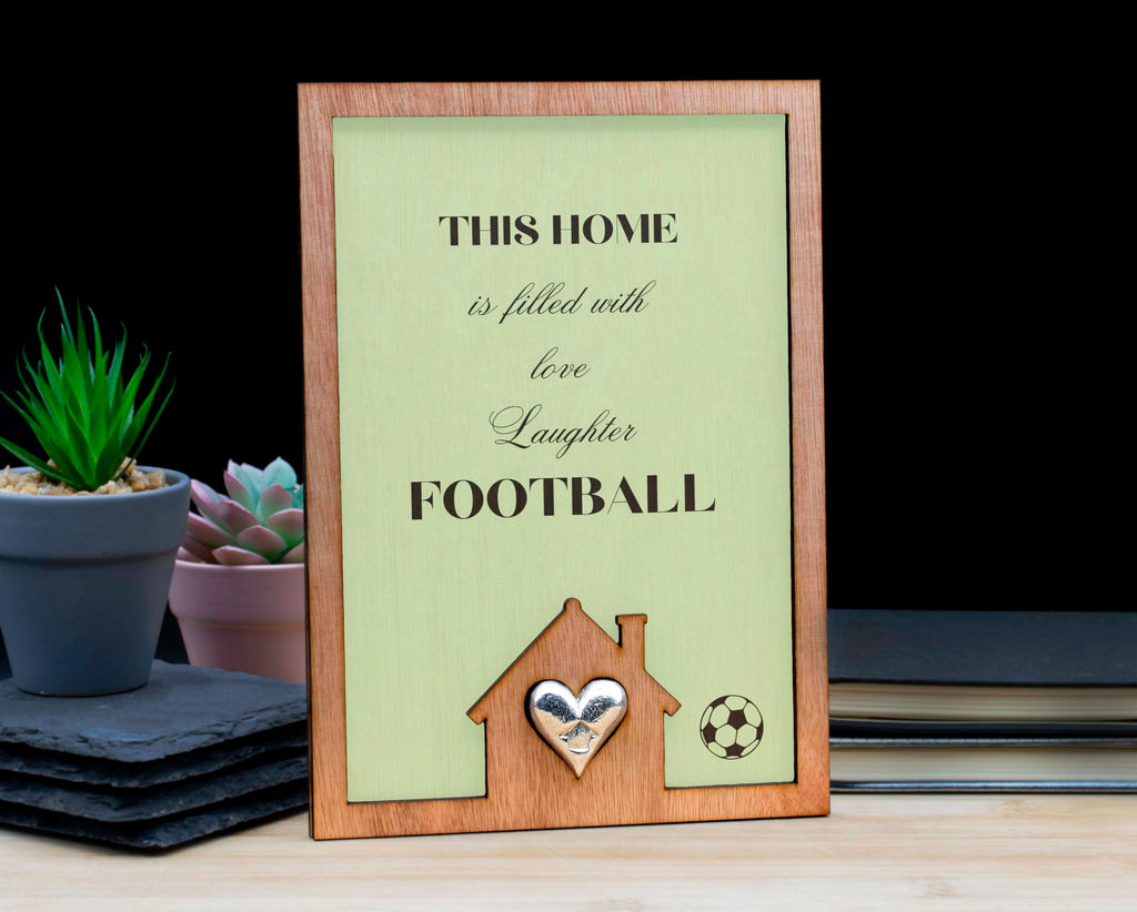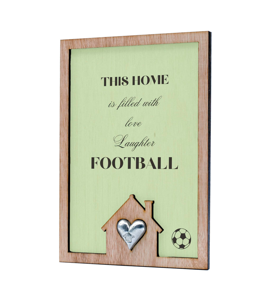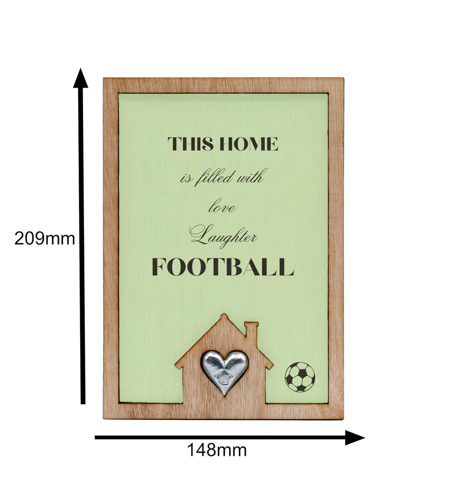 Celebrate your love for football and your family with this charming This Home is Filled with Love Laughter Football - Tin Heart in Plywood Ornament. This unique and eye-catching ornament is the perfect addition to any football fan's home decor. The ornament features a tin heart that fits perfectly in a plywood frame with house detail. The ornament is printed in full colour and has a green background with an image of a football and black writing that reads 'This home is filled with love, laughter, and football'. This ornament is not only a beautiful decoration for your home but also a wonderful gift for any football fan family.