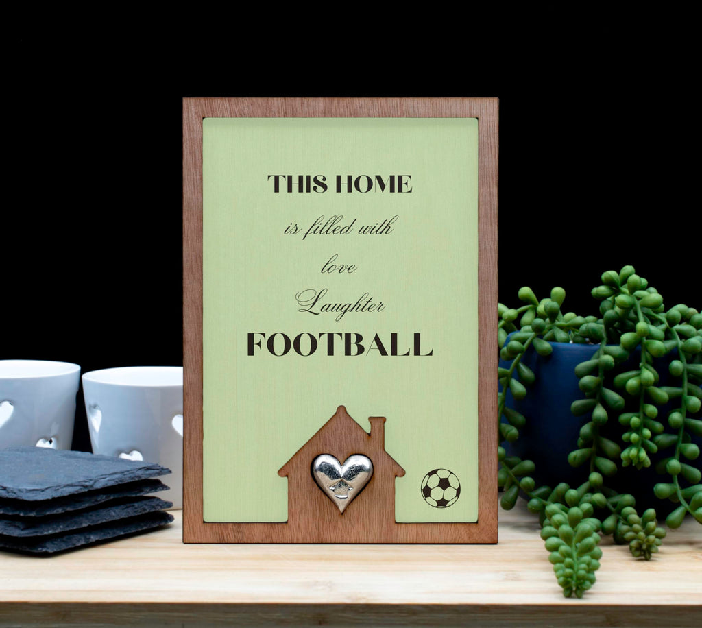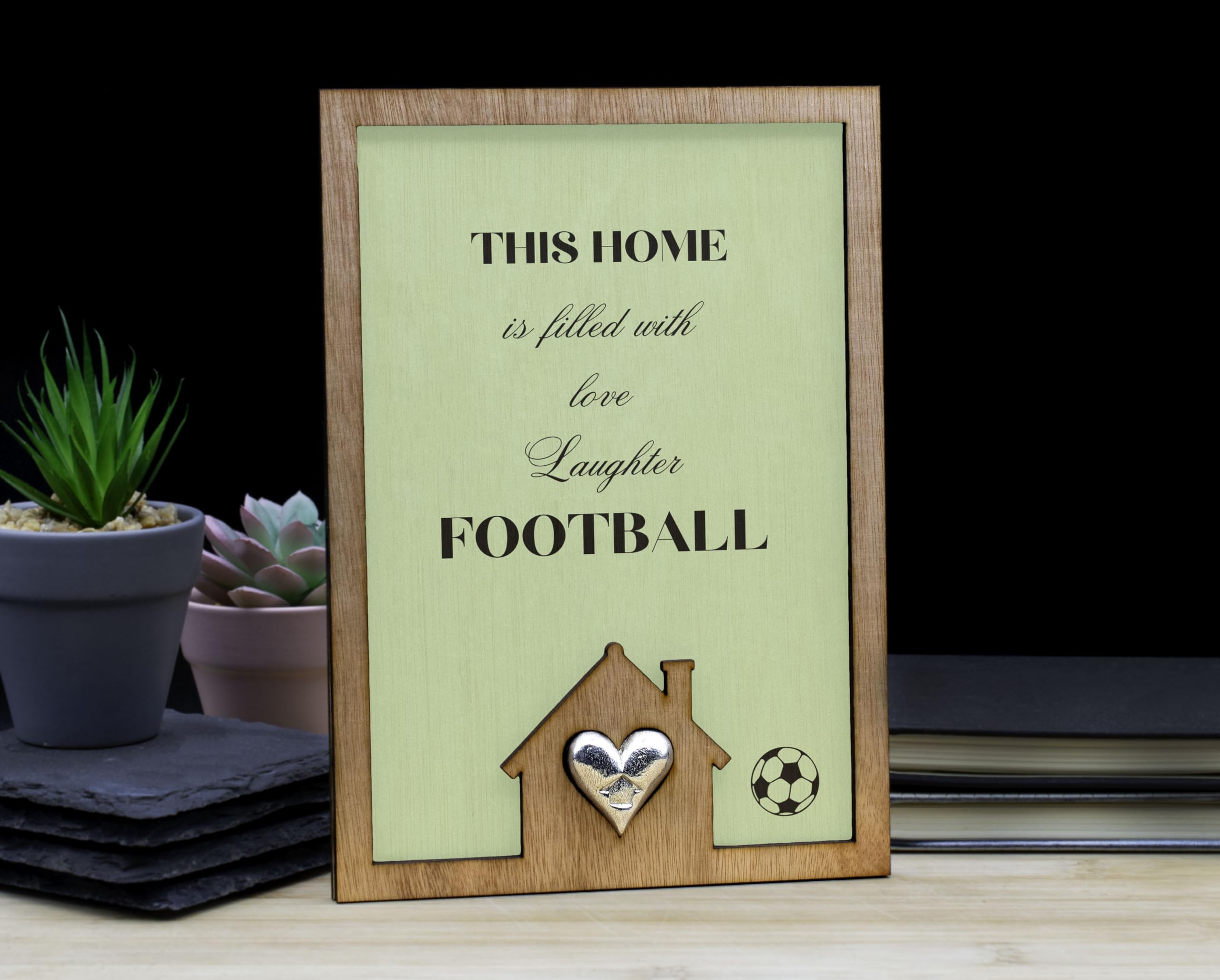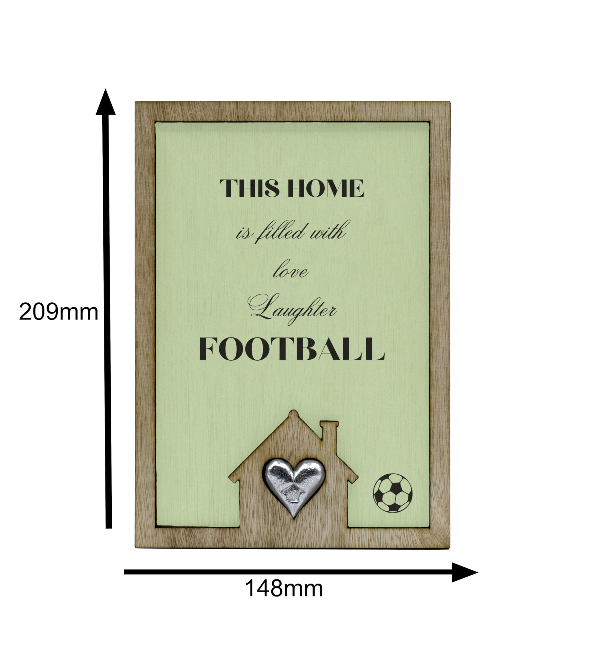 Celebrate your love for football and your family with this charming This Home is Filled with Love Laughter Football - Tin Heart in Plywood Ornament. This unique and eye-catching ornament is the perfect addition to any football fan's home decor. The ornament features a tin heart that fits perfectly in a plywood frame with house detail. The ornament is printed in full colour and has a green background with an image of a football and black writing that reads 'This home is filled with love, laughter, and football'. This ornament is not only a beautiful decoration for your home but also a wonderful gift for any football fan family.