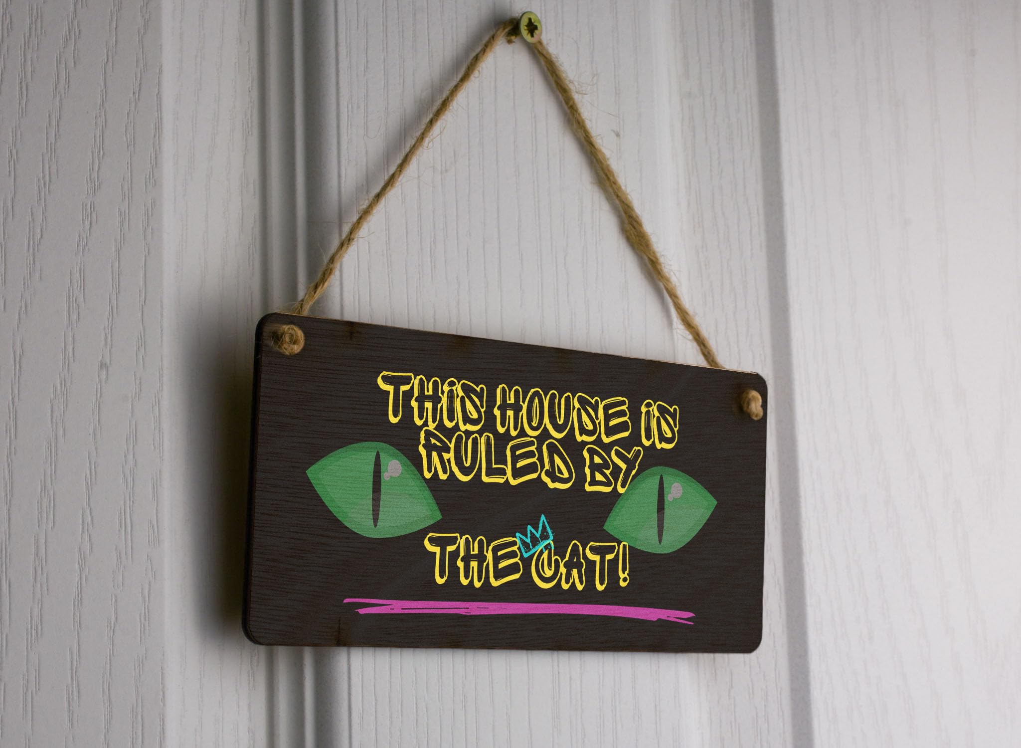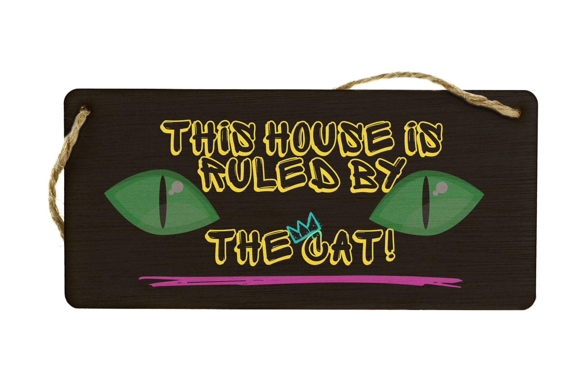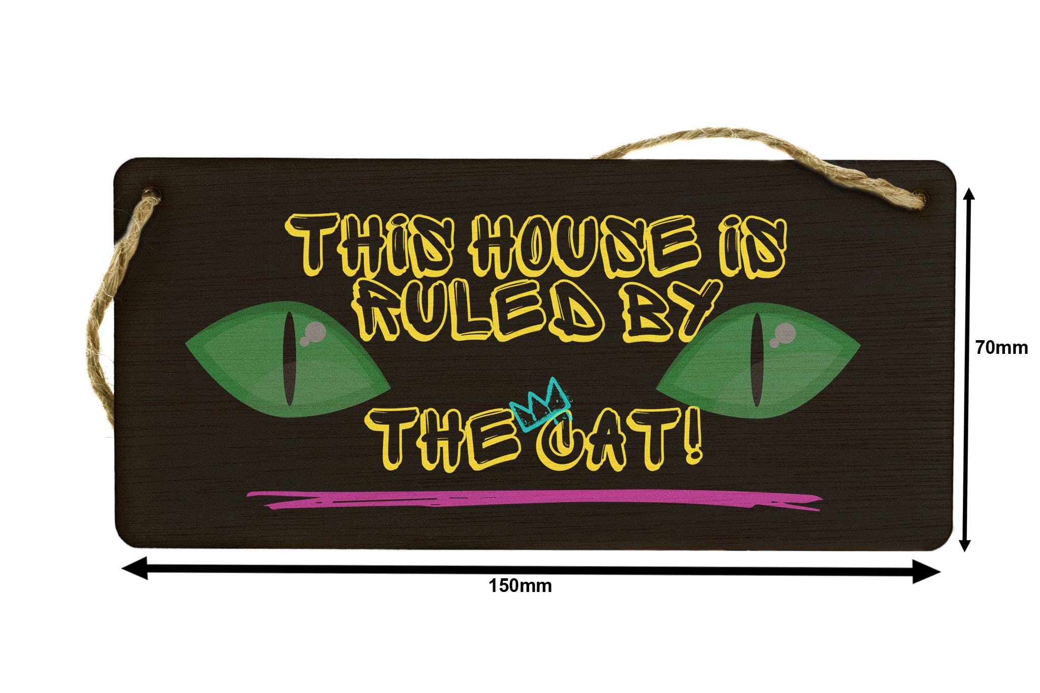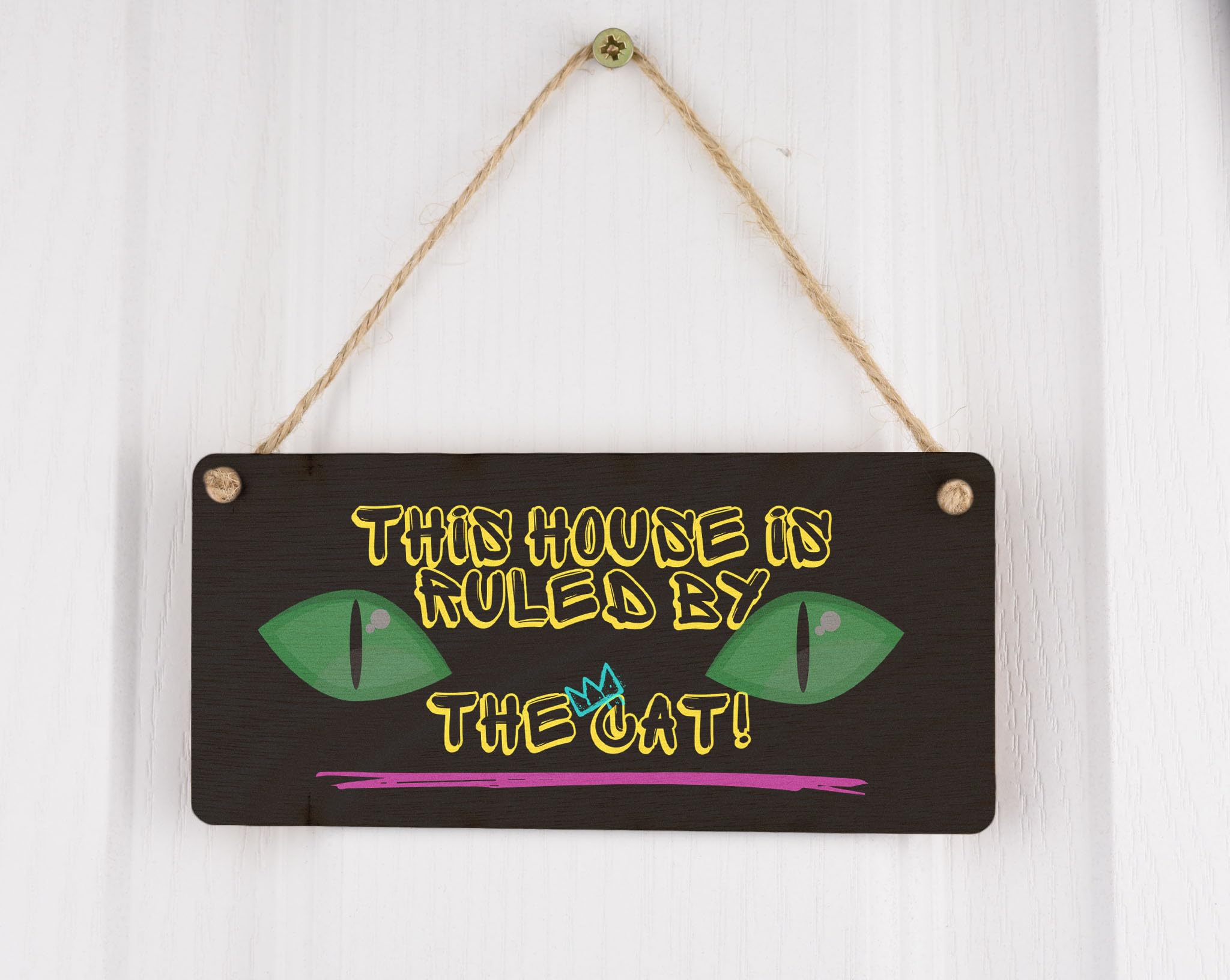 Enhance your home decor with this beautifully crafted This House is Ruled By the Cat - Plywood Hanging Sign. This hilarious and witty sign is the perfect gift for cat owners, family, and friends who adore their furry feline friends. Made from quality plywood, this durable sign is designed to last. With its eye-catching neon design, yellow writing, and cat eyes on a black background, this sign is sure to add a touch of fun to any room. Let everyone know that your house is ruled by the cat with this charming home sign.