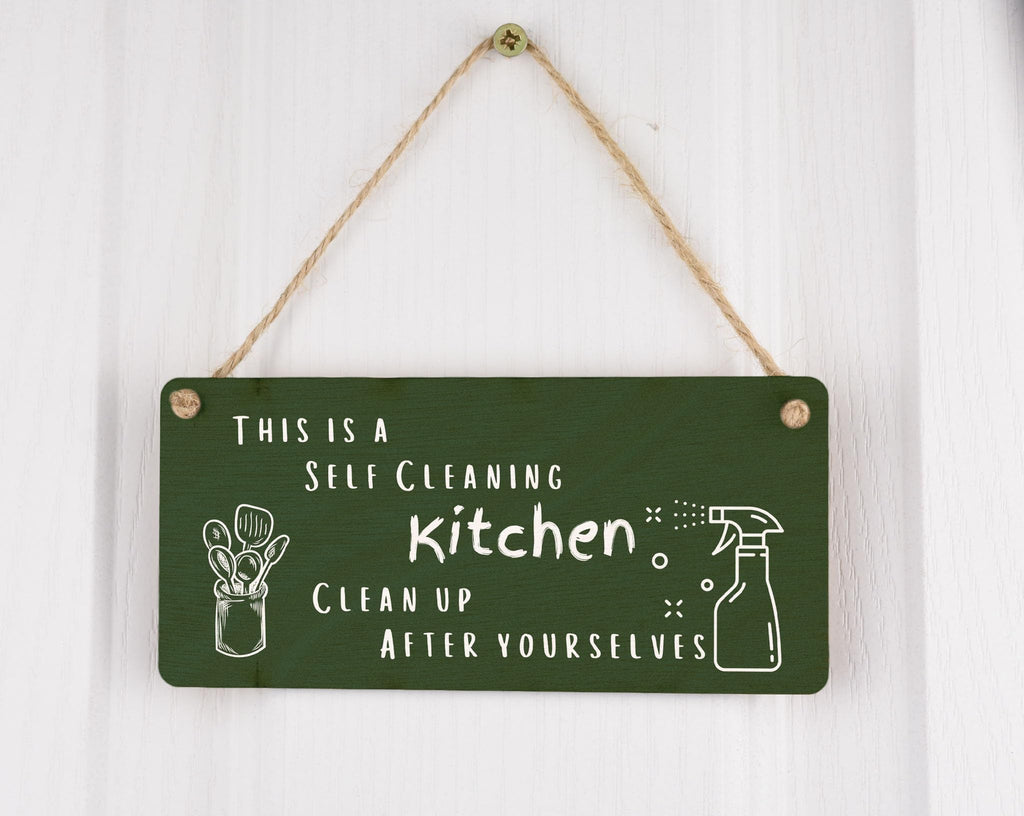Introducing our This is a Self-Cleaning Kitchen, Clean Up After Yourselves - Novelty Hanging Plywood Sign, the perfect addition to your home kitchen decor! This eye-catching sign features a vibrant green background with crisp white writing, providing a stylish and fun element to any room. The sign reads 'This is a Self-Cleaning Kitchen, Clean Up After Yourselves', serving as a gentle reminder for everyone to tidy up after preparing delicious meals. Crafted from quality plywood, this sign is durable and long-lasting, ensuring it will bring joy to your home for years to come. The design also includes an image of a spray bottle and kitchen utensils, adding a delightful touch to the overall look. Hang this delightful sign on your kitchen door or wall, and impress your guests with your impeccable taste and sense of humour. Bring a touch of novelty and charm to your home with this unique and functional decor piece!