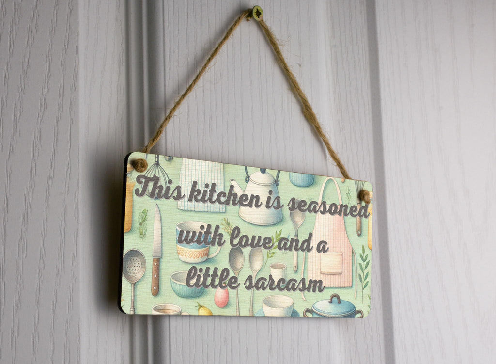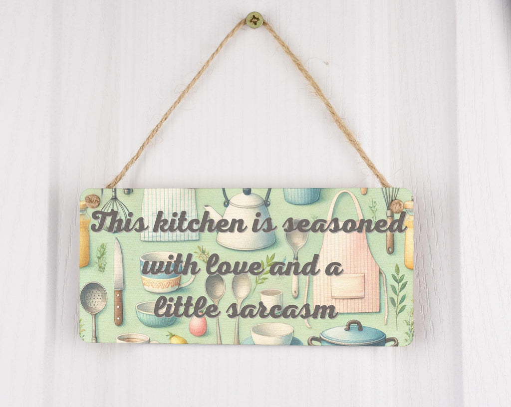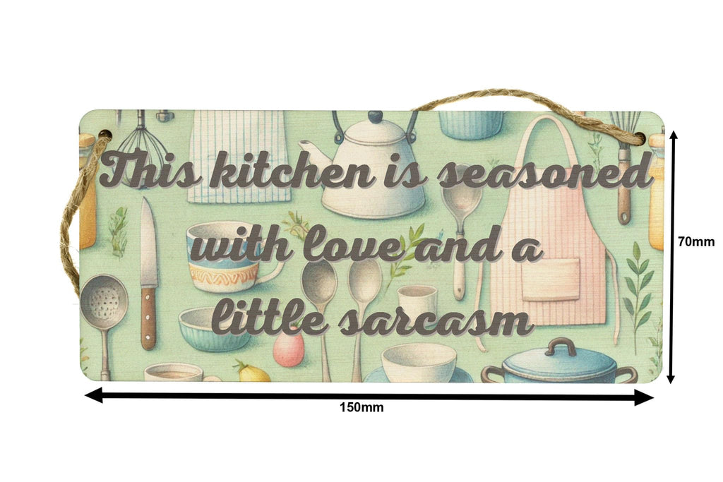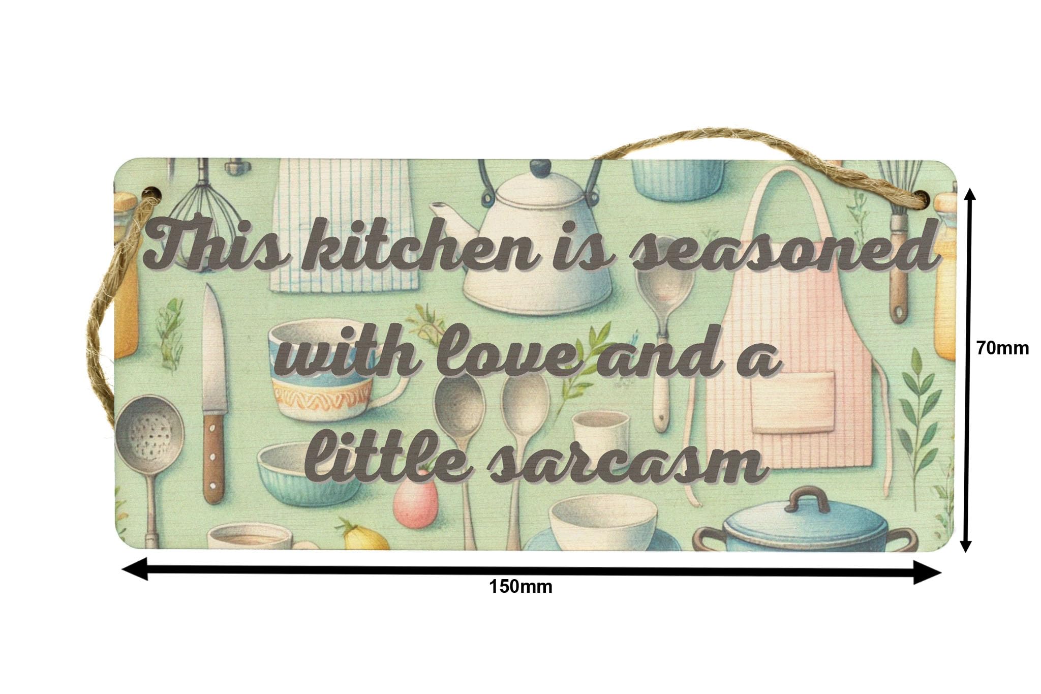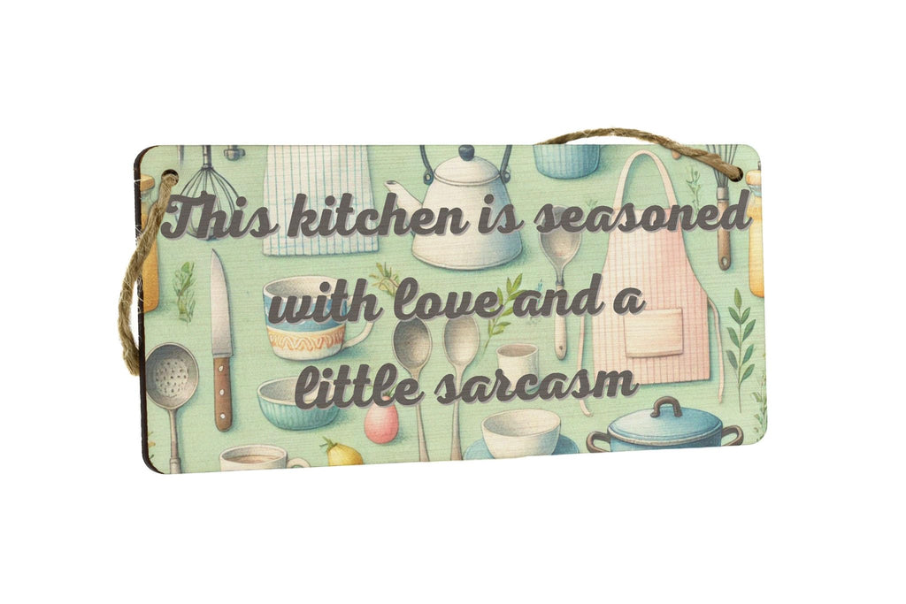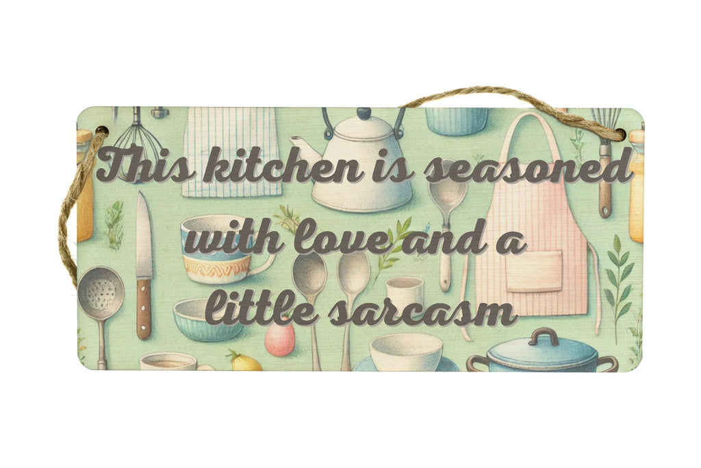 Bring a touch of whimsical charm to your kitchen decor with this delightful hanging sign that reads 'This Kitchen is Seasoned with Love and a Little Sarcasm'. The watercolour design features a pattern of pastel kitchen utensils, adding a playful and cosy vibe to your cooking space. Handcrafted from laser-cut plywood, this rustic sign is perfect for adding a sentimental touch to your home. The UV printed full colour design showcases AI generated art, offering a unique and eye-catching focal point for your kitchen. The sign comes with twine for easy hanging, making it a convenient yet stylish addition to your kitchen decor. Add a dash of humour and love to your cooking space with this charming wall art.