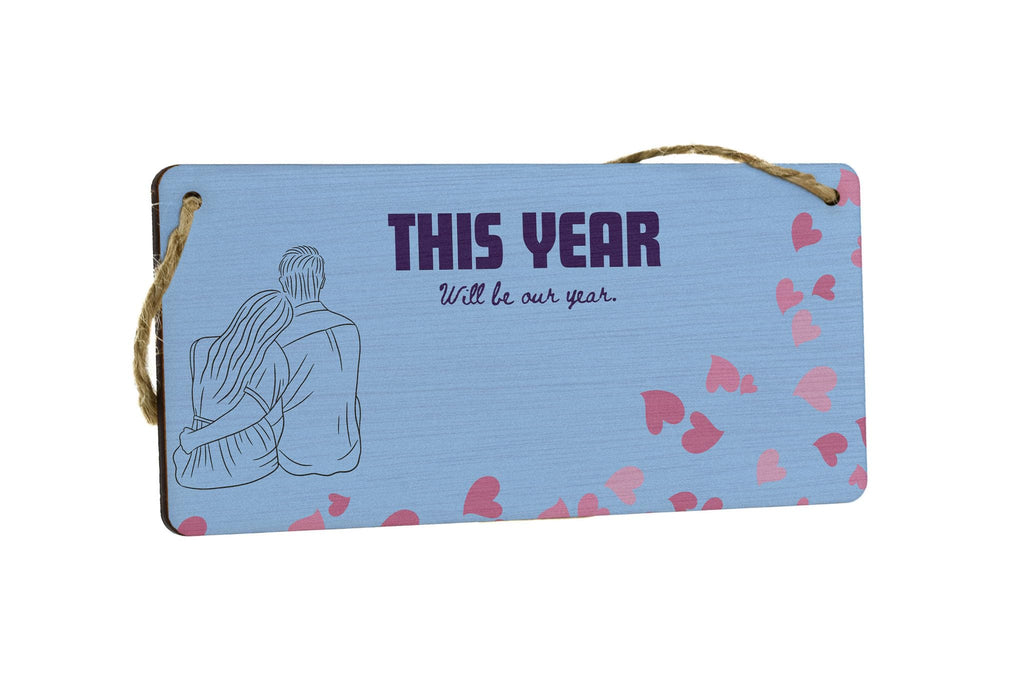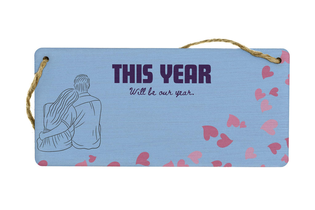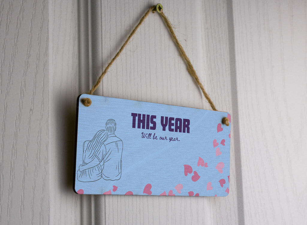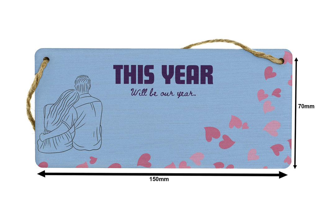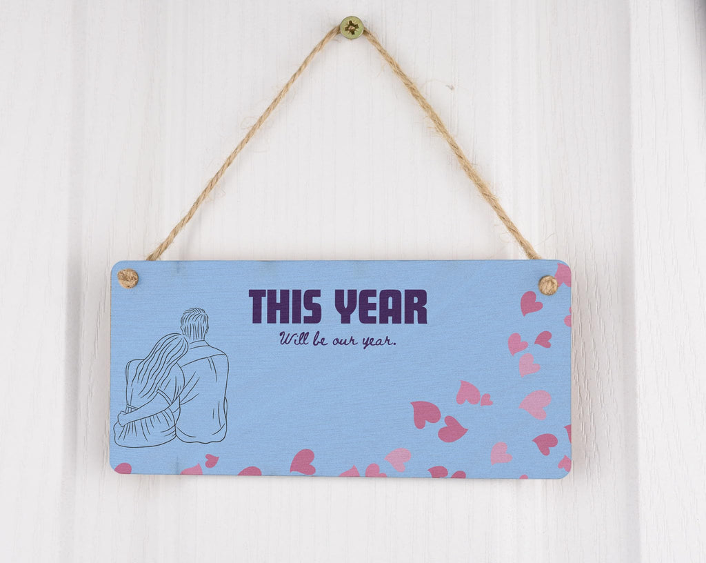 Add a touch of romance to your home with this beautiful This Year Will Be Our Year - Romantic Plywood Hanging Sign. Crafted from quality plywood, this sign is not only durable but also a great addition to your home decor. The sign features a full colour design with blue writing on a blue background, showcasing a cute couple cuddling and love hearts. With the phrase 'This Year Will Be Our Year' written on it, this sign is the perfect anniversary or wedding present for your loved ones. Hang it in your bedroom, living room, or any other place in your home to create a romantic atmosphere. Get ready to celebrate the new year with this charming sign and bring the warmth of love into your home.