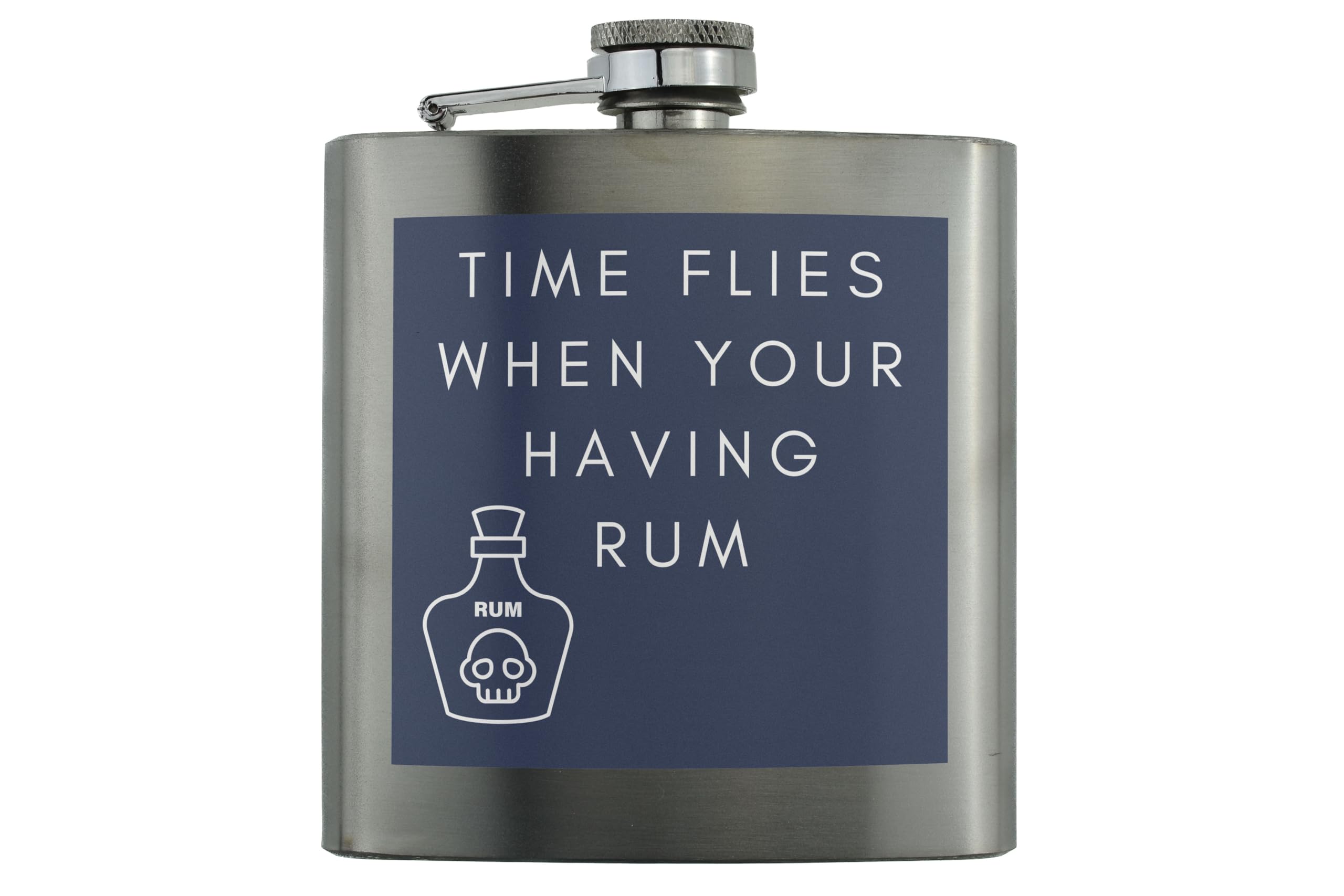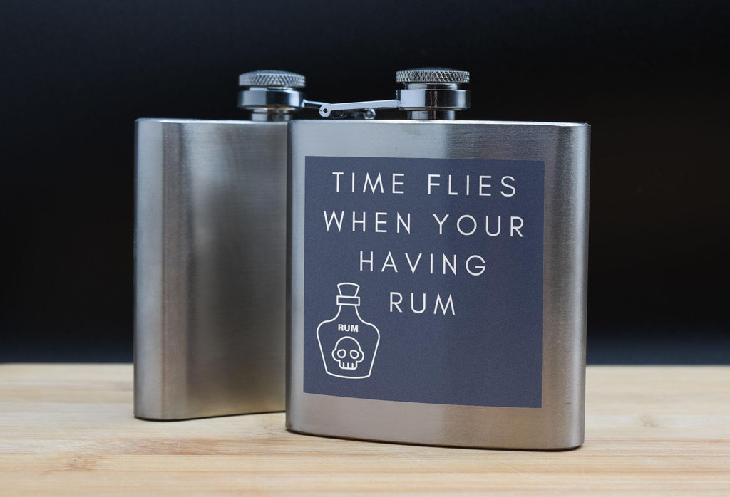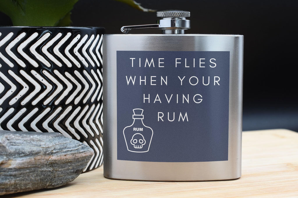 Introducing our Time Flies When You're Having Rum - Novelty Stainless Steel Hip Flask - the perfect funny gift for your family and friends! Made with quality stainless steel, this hip flask is durable and designed to last. Its compact size makes it easy to carry around, allowing you to enjoy your favourite rum anywhere and anytime. Featuring a blue square background with an outline image of an alcohol bottle, this flask adds a touch of fun to your drinking experience. The white writing on the flask reads 'Time Flies When You're Having Rum', making it a hilarious conversation starter at parties. Surprise your loved ones with this unique and entertaining gift! Whether it's your wife, husband, girlfriend, boyfriend, son, daughter, or siblings, this novelty hip flask is an ideal present for all occasions. Get yours today and get ready to have some rum-filled fun!