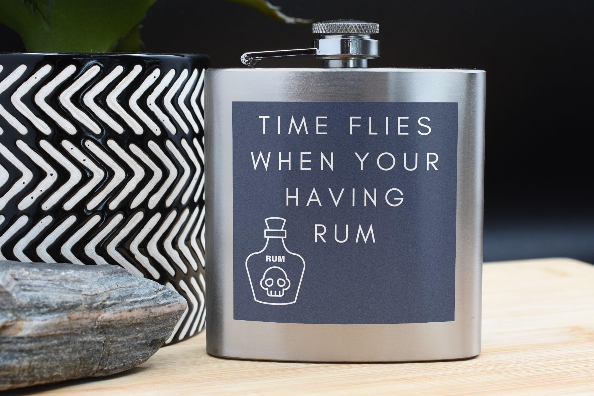 - White writing reads 'Time Flies When You're Having Rum'