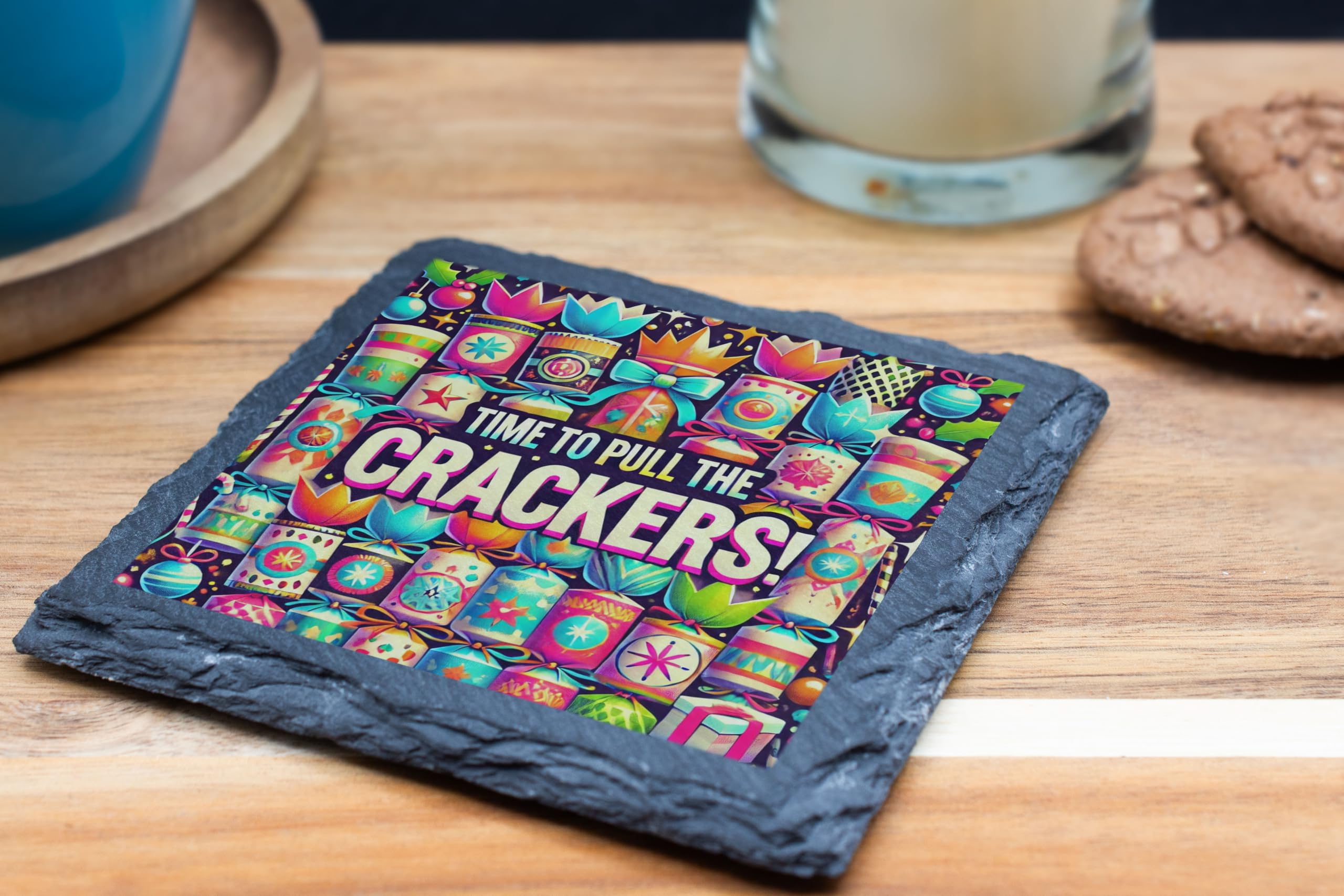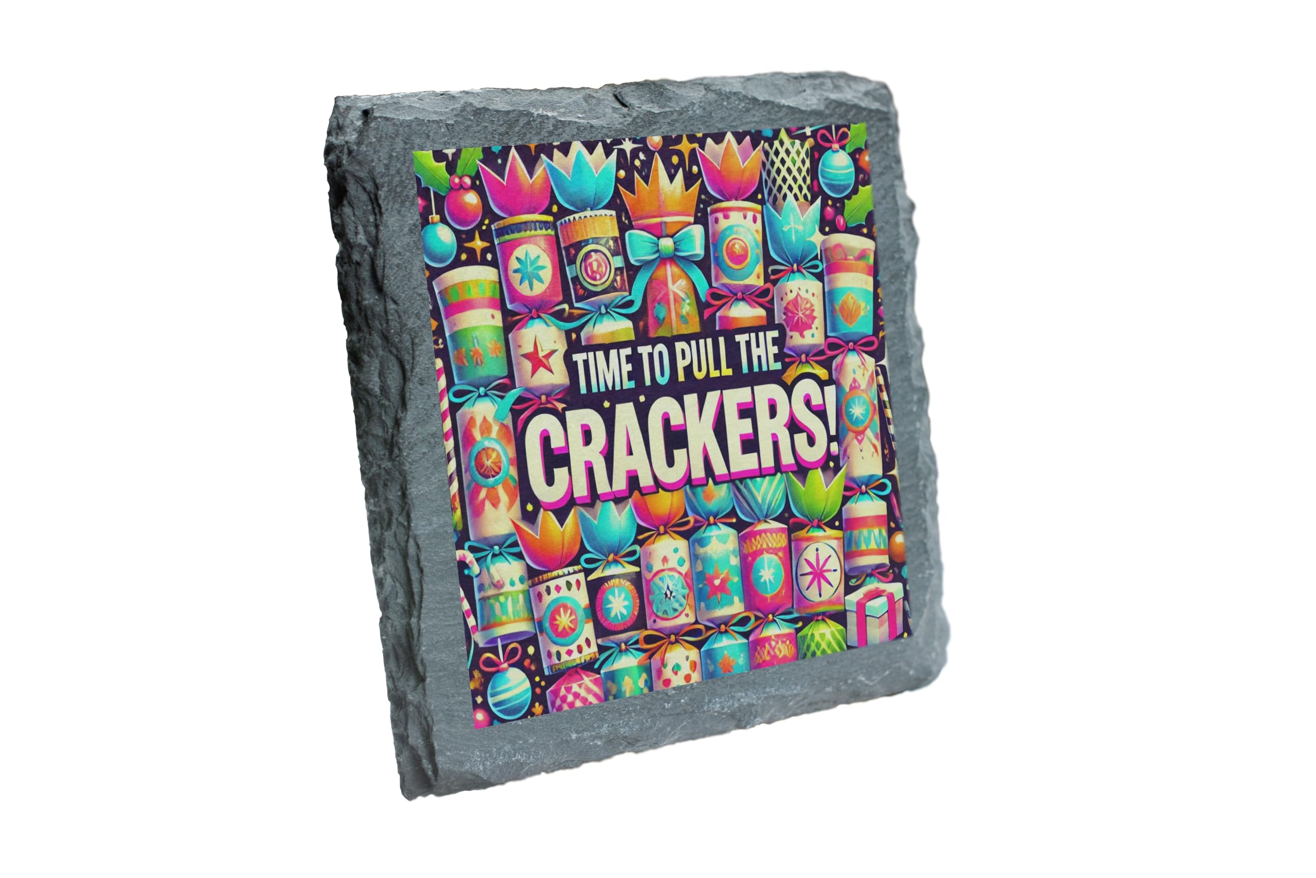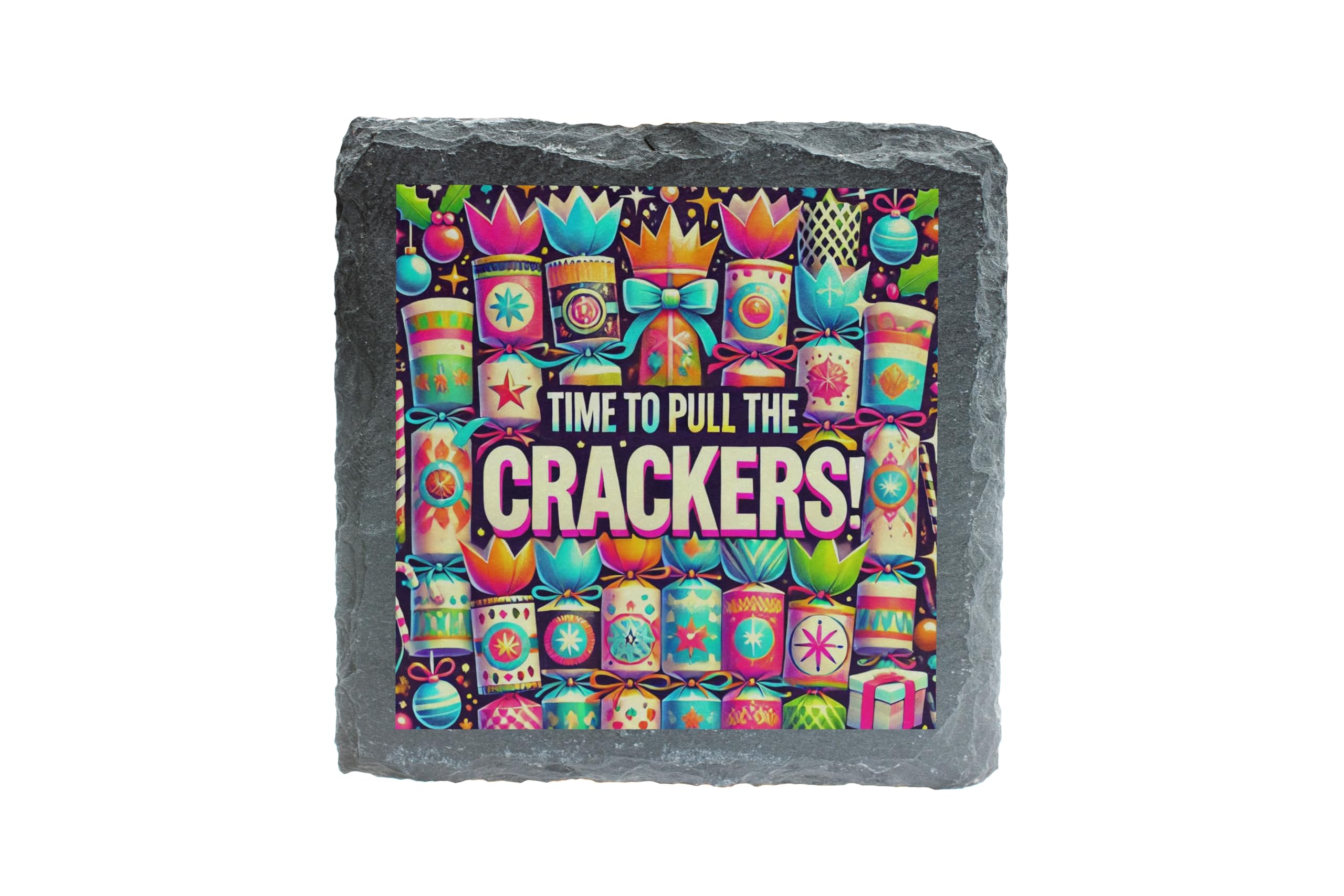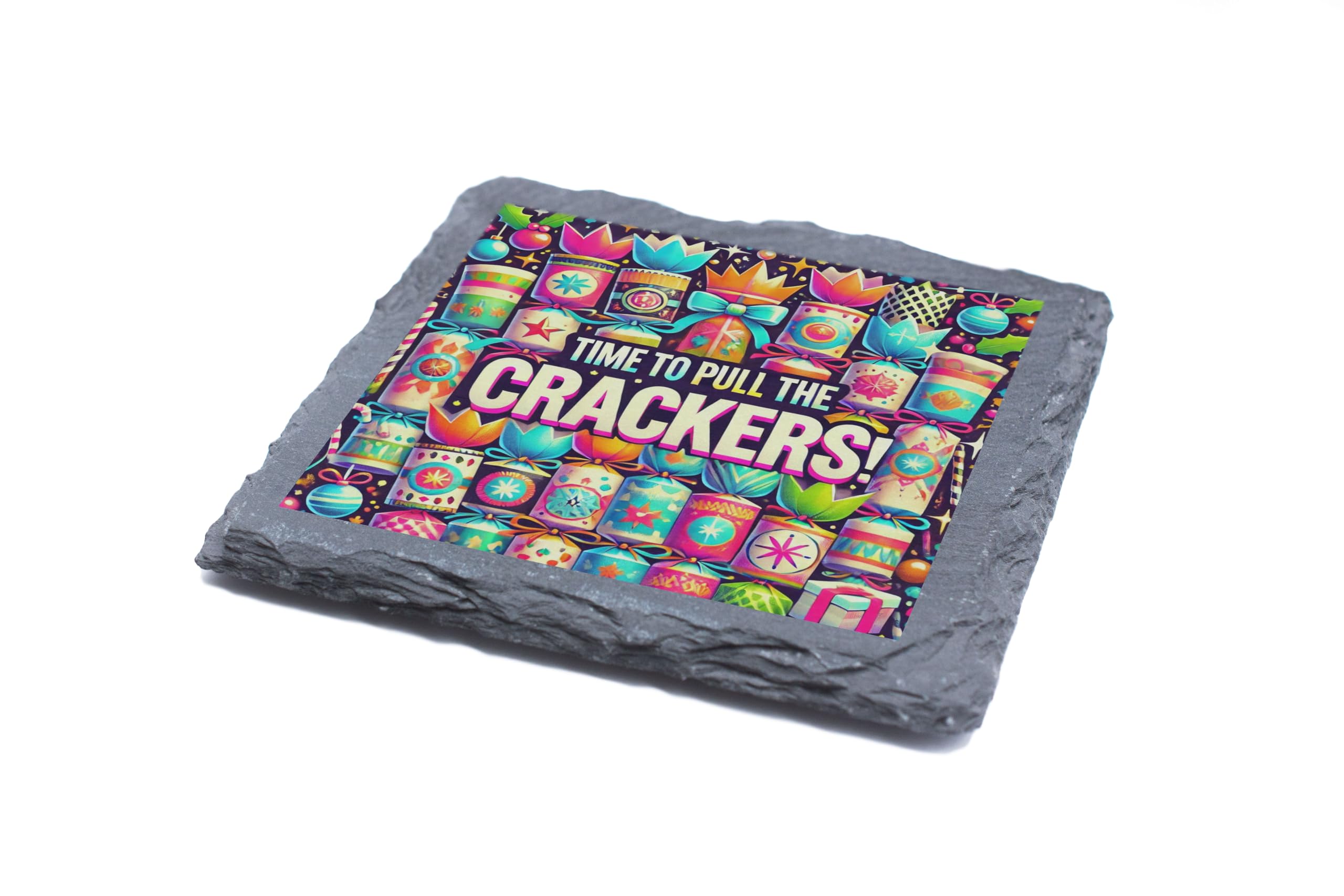 Add a vibrant touch of holiday cheer to your home with this "Time to Pull the Crackers!" Slate Coaster. Designed with a playful and colorful theme, it embodies the festive joy of Christmas gatherings. Whether you're hosting a party or enjoying a cozy holiday evening, this coaster is a perfect accessory for protecting your surfaces while uplifting the atmosphere. Made from durable natural slate, it combines practicality with a bold, festive design, making it a perfect gift for loved ones or a charming addition to your Christmas decor. Celebrate the holidays in style and let the festivities begin with this delightful coaster!