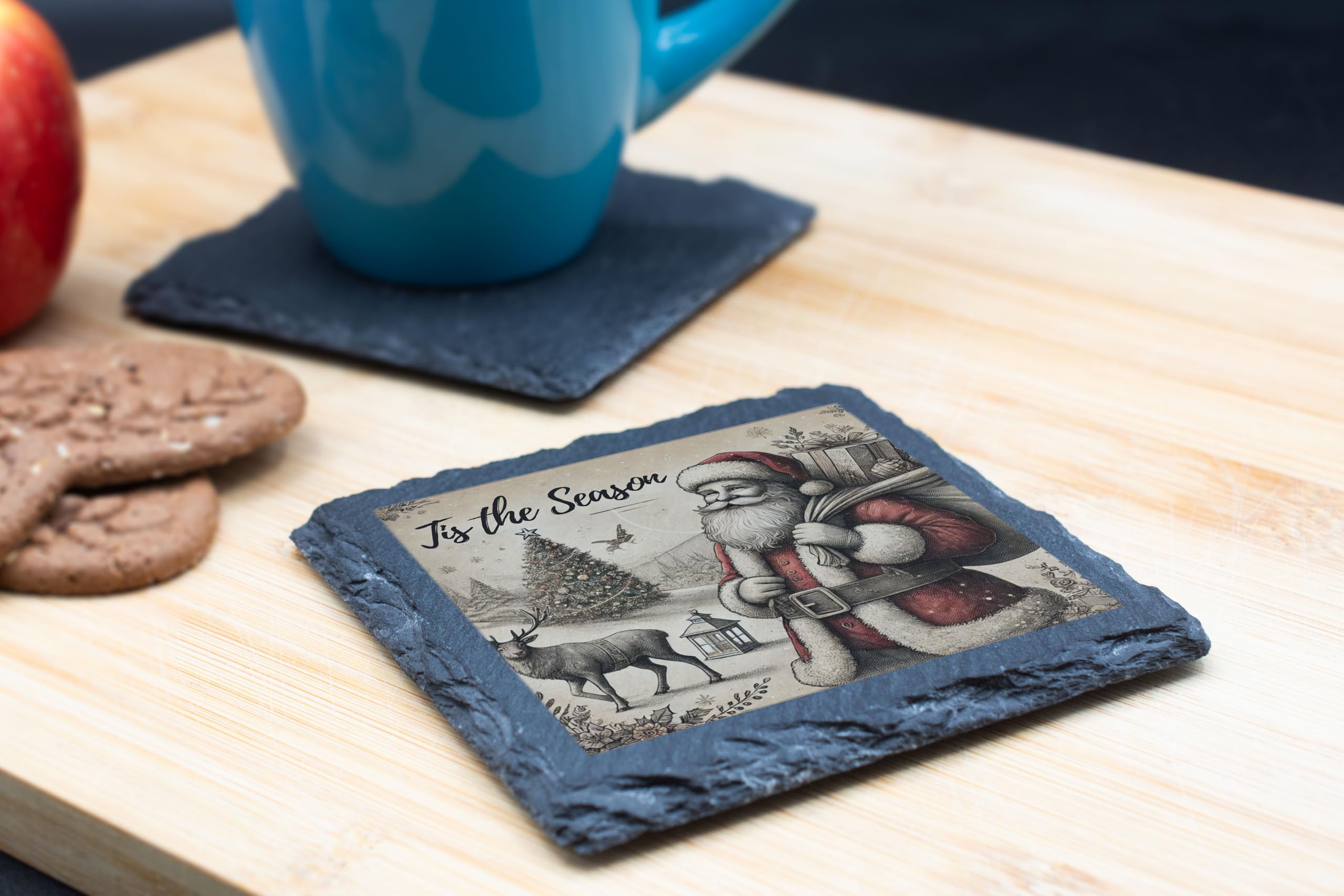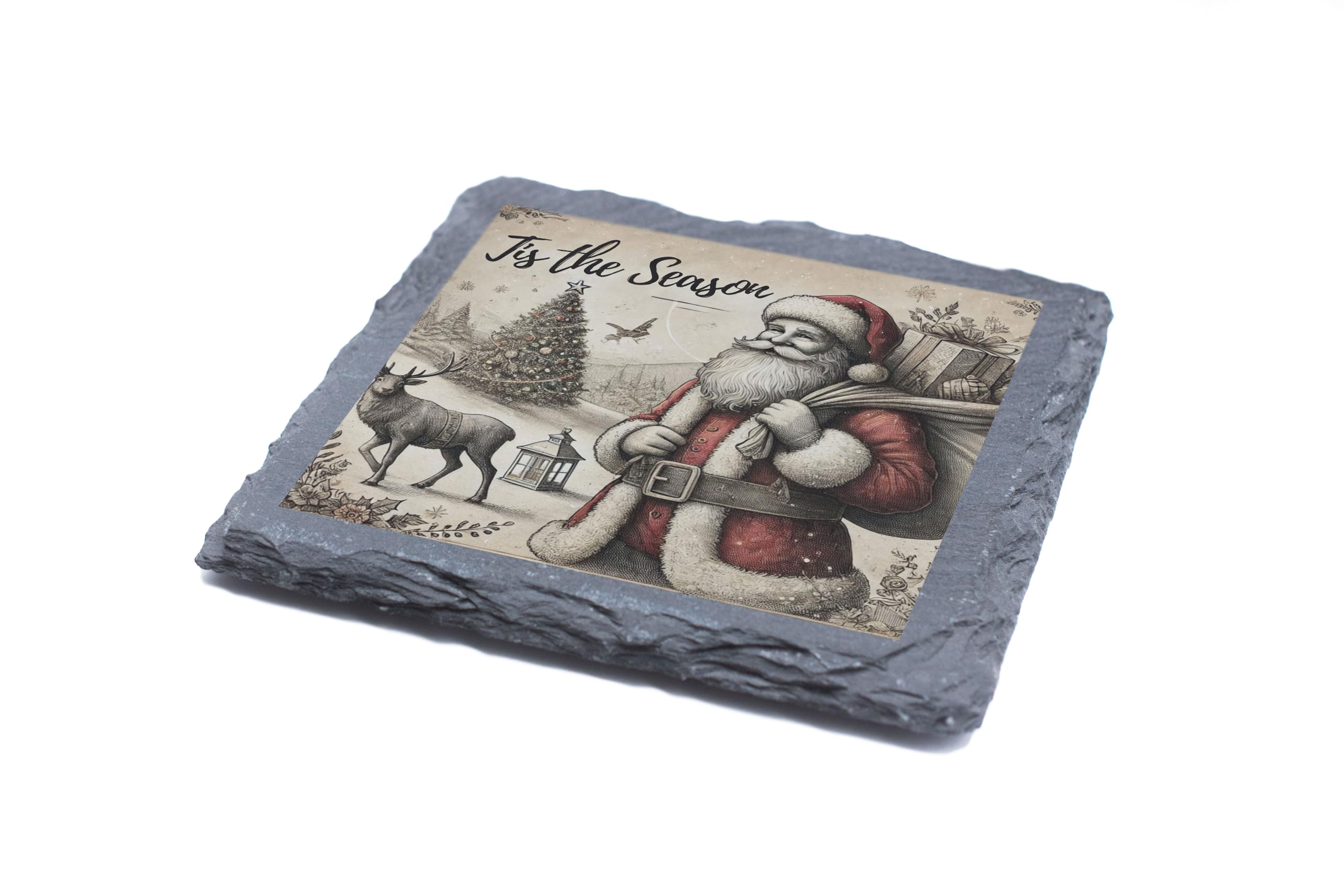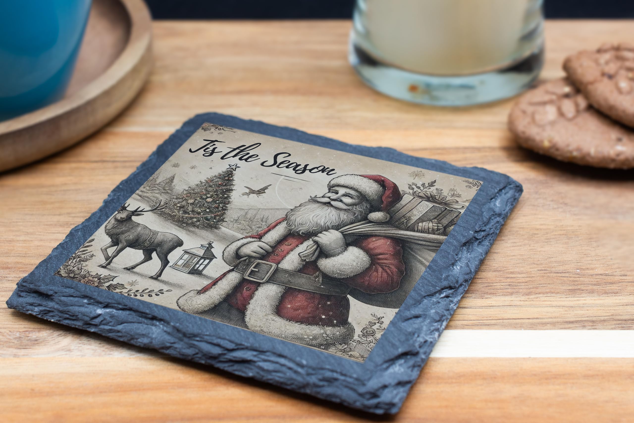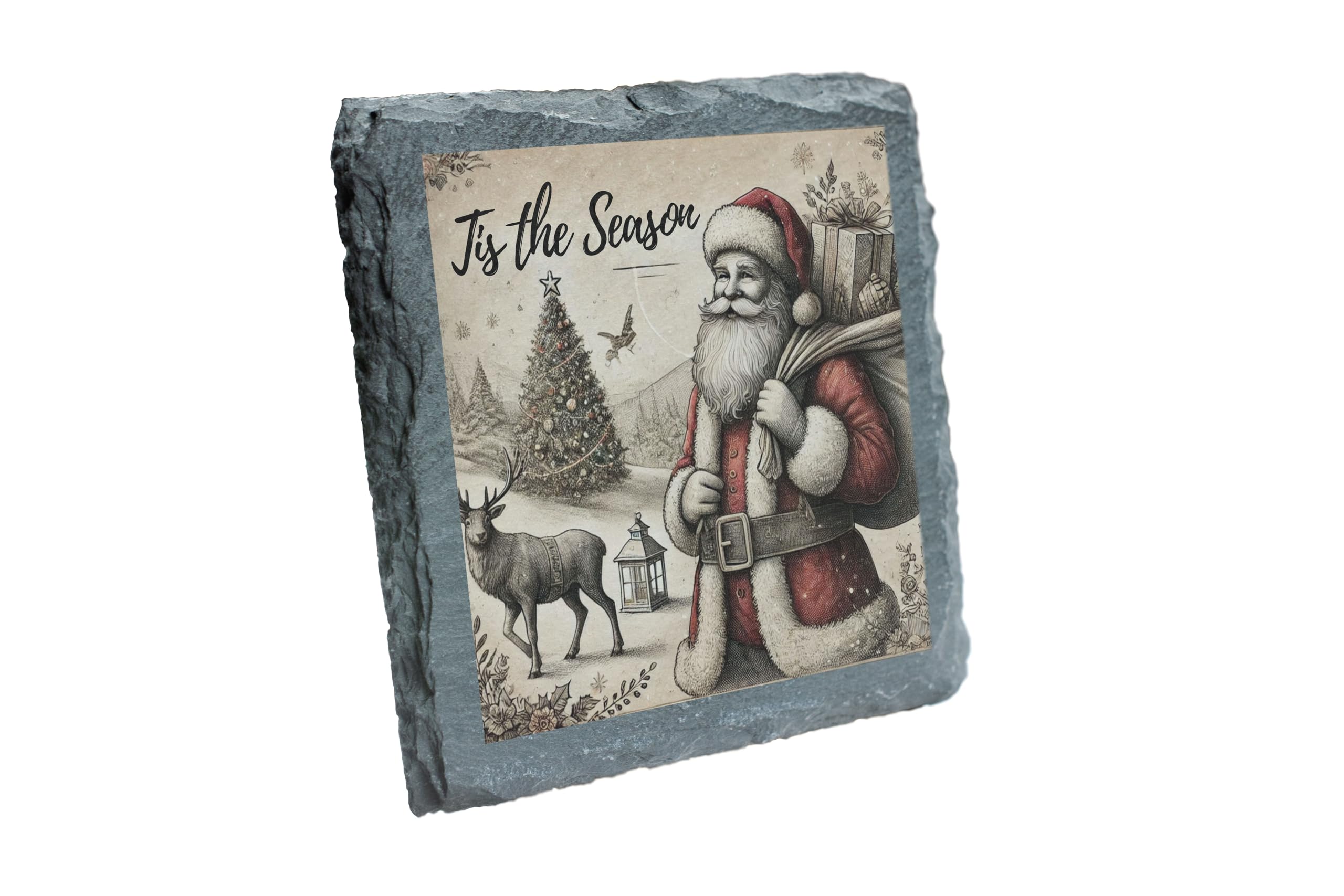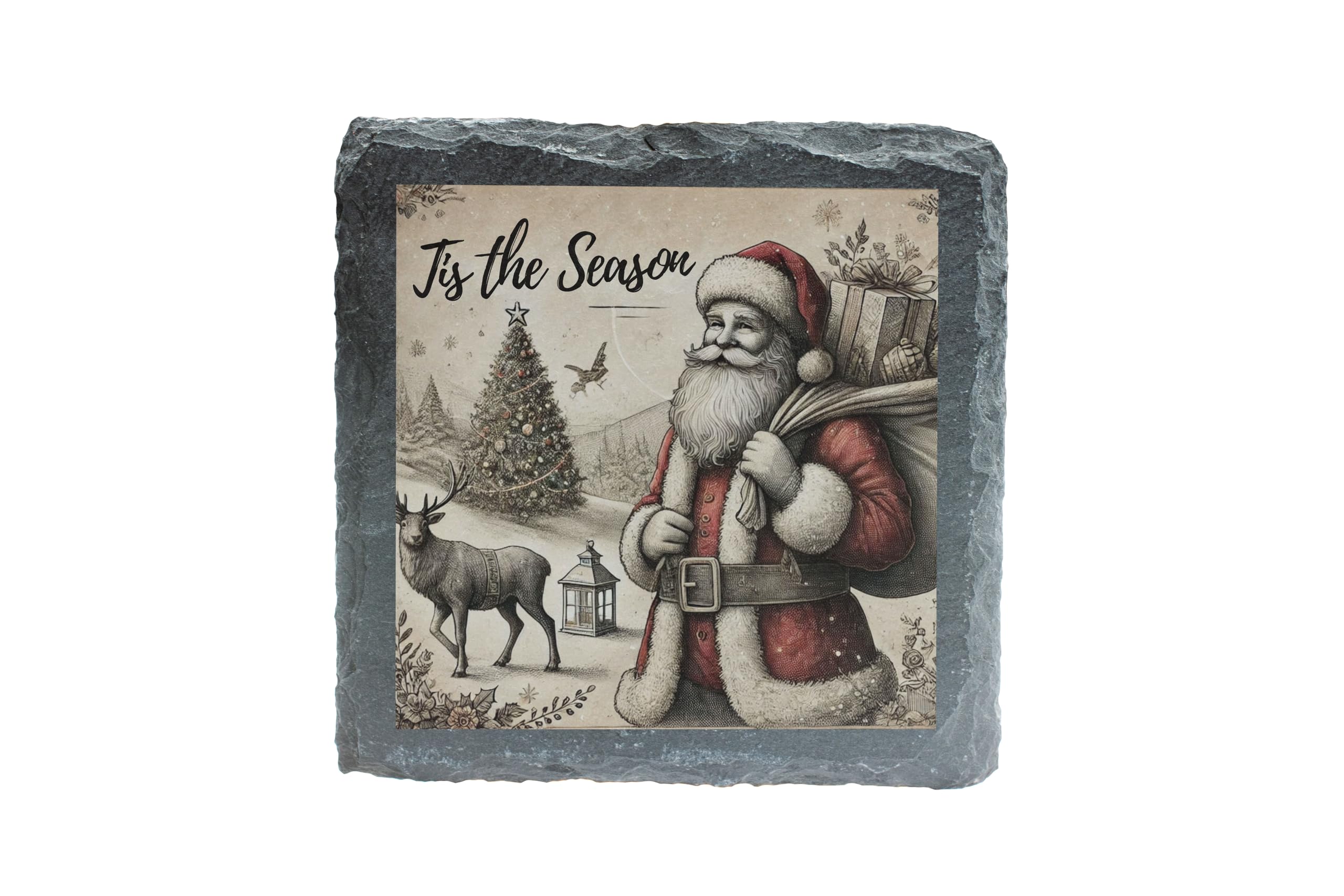 Capture the spirit of the holidays with this "?Tis the Season" Slate Coaster. Featuring a nostalgic vintage illustration of Santa Claus with a sack of gifts, a reindeer, and a beautifully adorned Christmas tree, this coaster exudes classic holiday charm. Crafted from premium slate, it combines functionality with festive decor. Use it to protect surfaces or as a unique holiday decoration for your coffee table or dining area. Whether for yourself or as a gift, this timeless piece will spread joy and cheer throughout the festive season!