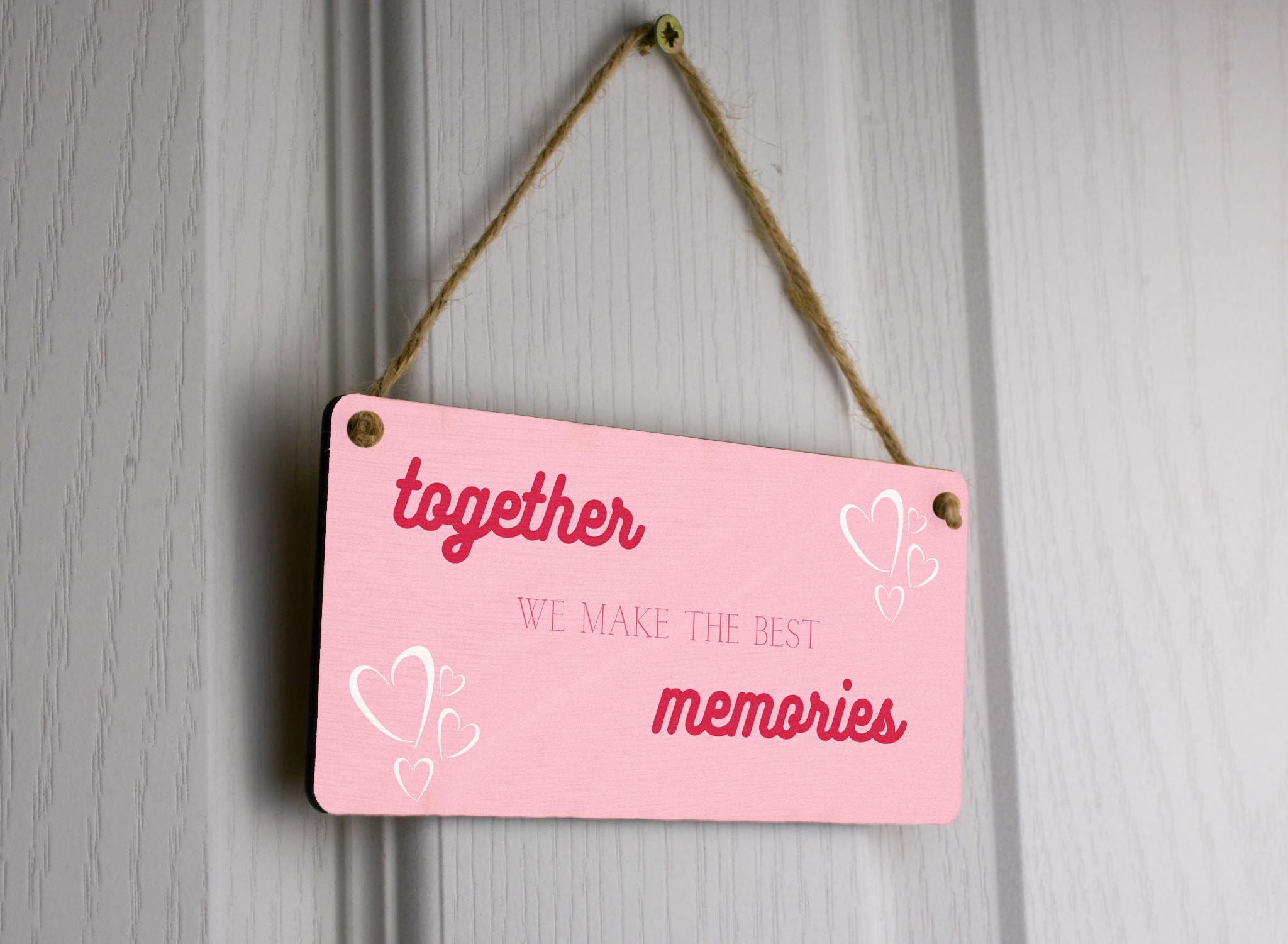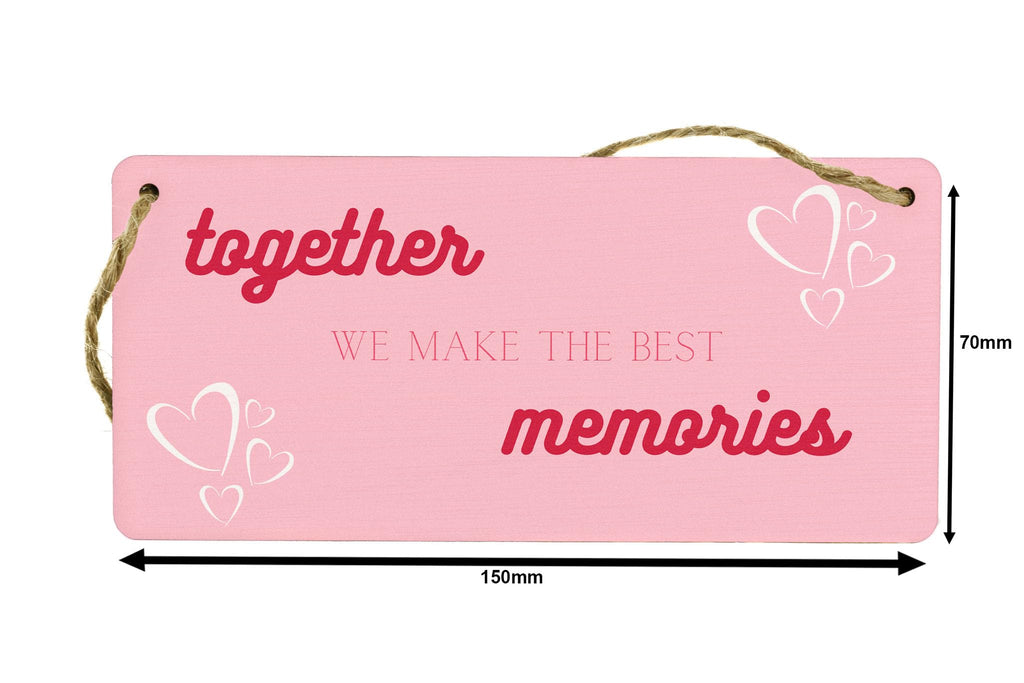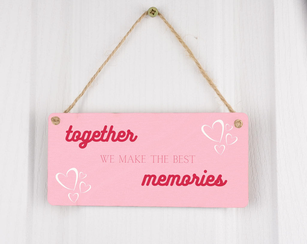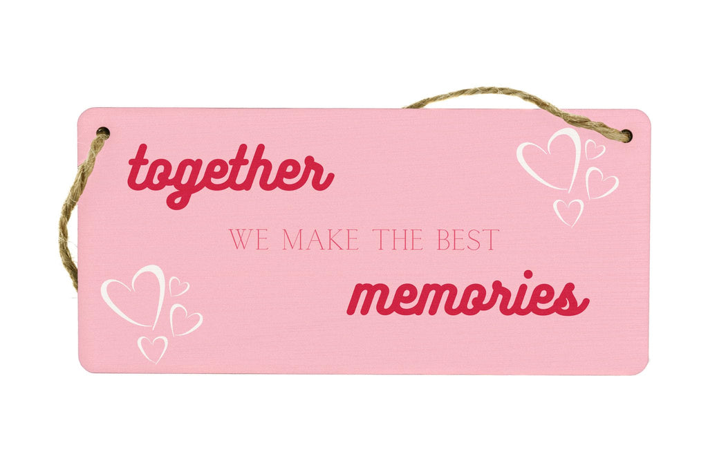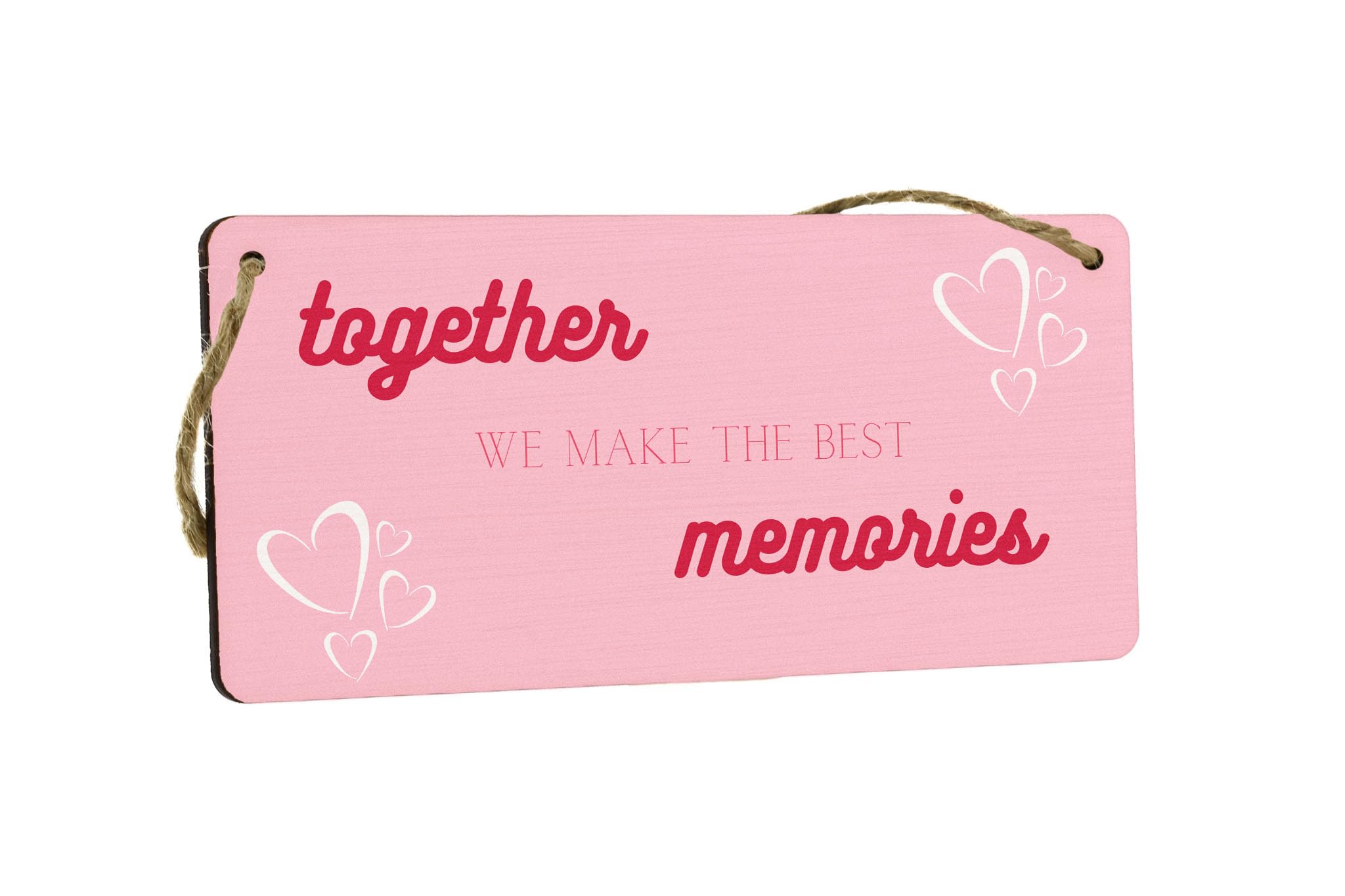 Add a touch of love and friendship to your living room with this beautiful Plywood Hanging Sign. This sign makes a perfect gift for friends, family, husband, wife, girlfriend, boyfriend, son, daughter, and siblings. Made from quality plywood, this sign features a pink colour scheme with white heart doodles on the background. The full-colour design is eye-catching and will brighten up any room. The sign reads 'Together We Make the Best Memories', reminding you of the special moments shared with your loved ones. Hang it in your living room or give it as a thoughtful gift to someone you care about. Spread love and friendship with this charming room sign.