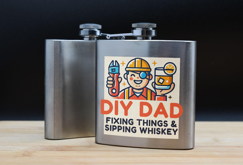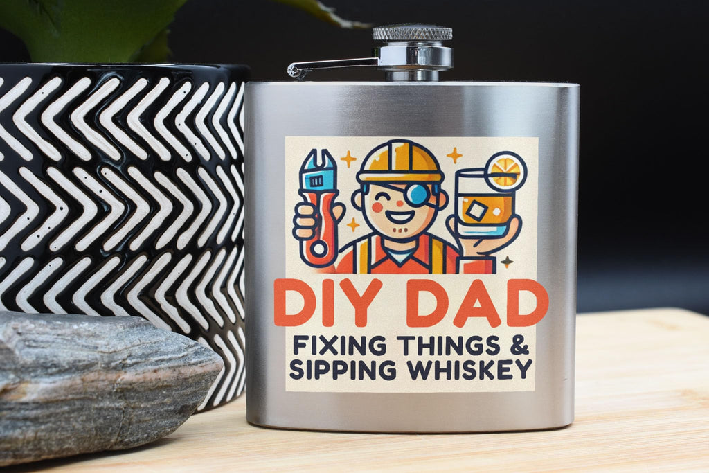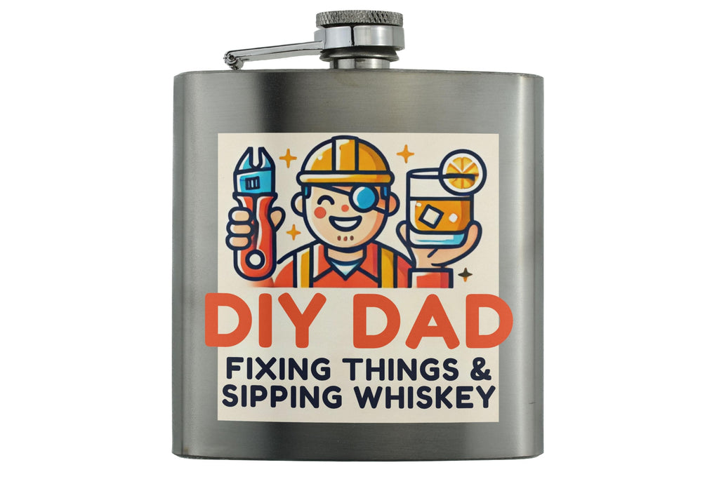 This Tool-Themed Stainless Steel Whiskey Flask is the perfect gift for the DIY dad in your life. Featuring a unique novelty design that combines handy dad humor with a love for whiskey, this flask is sure to be a hit with any construction or handy dad. The full colour printed stainless steel flask reads 'DIY dad - fixing things and sipping whiskey' in a fun cartoon style design that is perfect for dad or grandad. This portable whiskey flask is a fun and quirky drinkware option that is great for any whiskey lover. Surprise your dad this Father's Day with this tool-themed flask that will be his new favourite companion in the workshop or on the go.