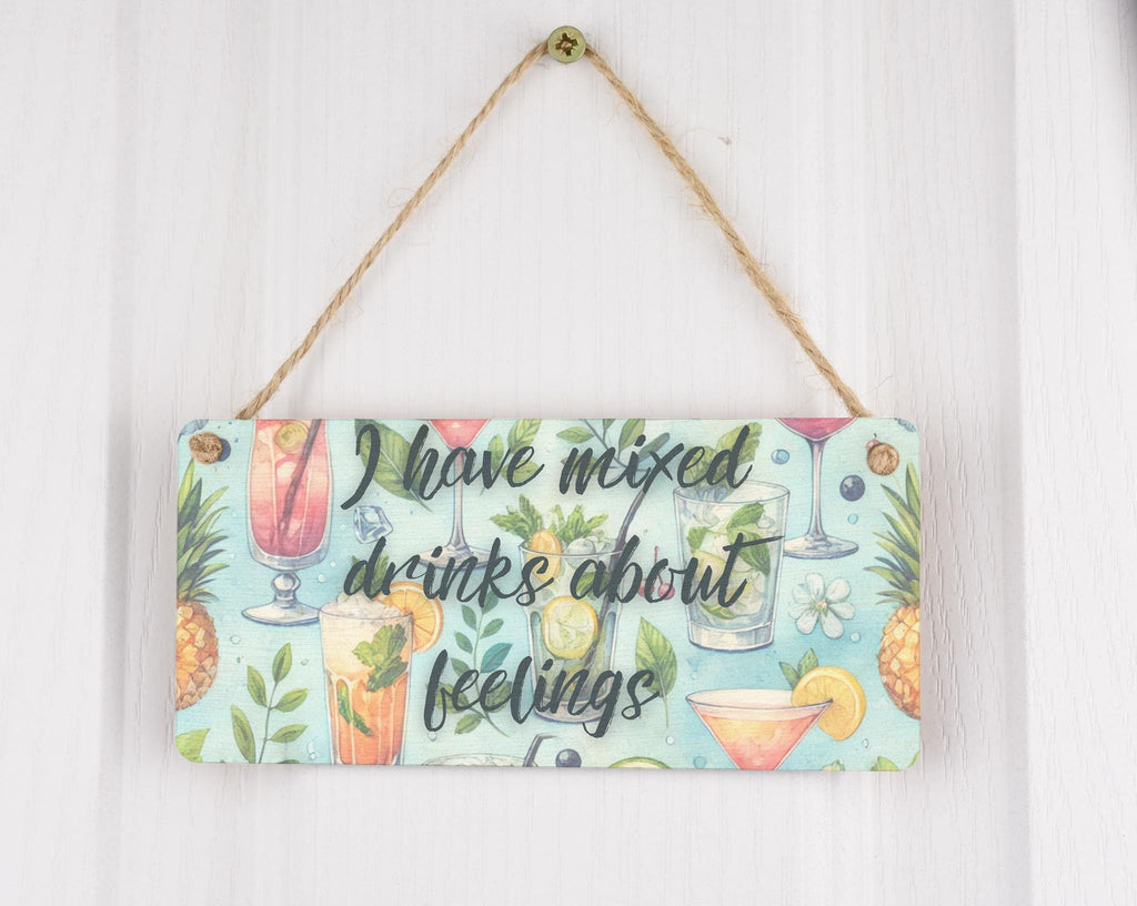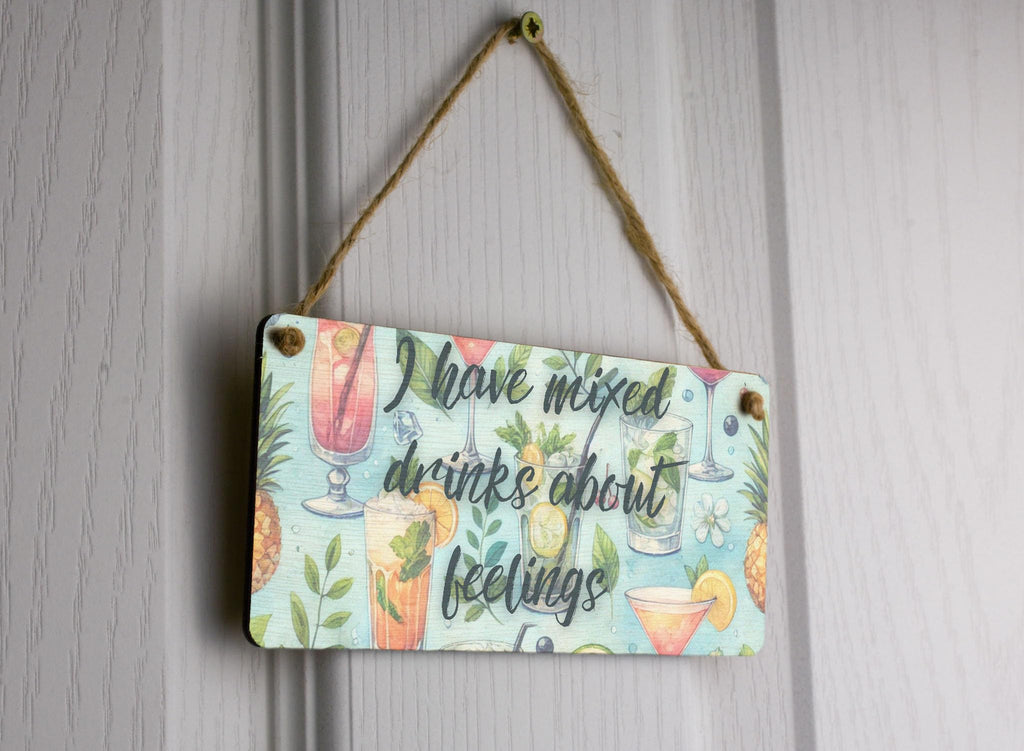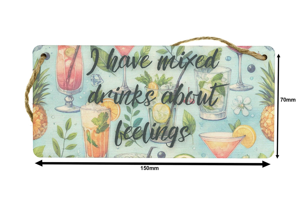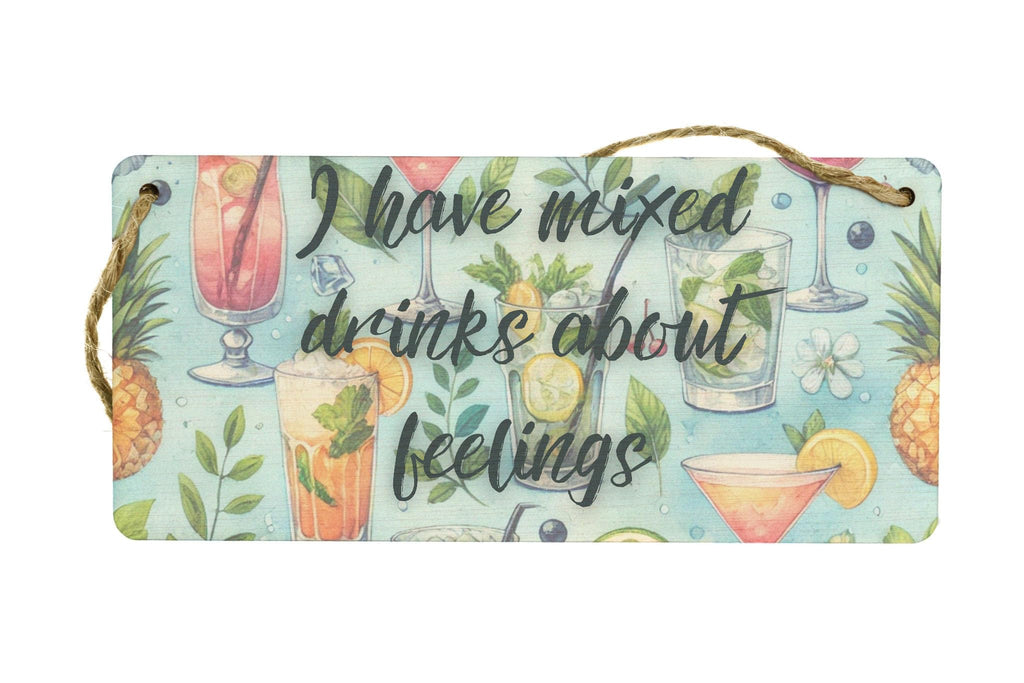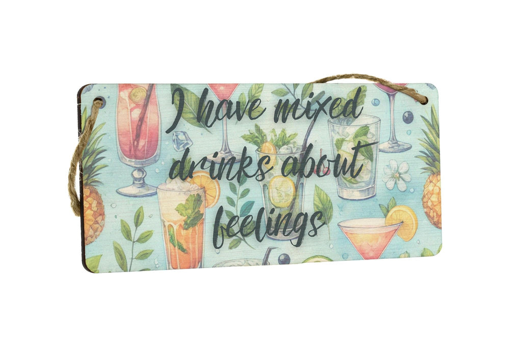 Add a touch of tropical cocktail fun to your living space with this eye-catching Tropical Cocktail Fun Quote Wall Art Sign. This cocktail themed wall art features a vibrant watercolour design showcasing colourful tropical drinks, perfect for adding a playful and lighthearted message to your home decor. The full colour design with watercolour style cocktails is sure to bring summer vibes and relaxation to any room. The humorous quote reads 'I have mixed drinks about feelings', making it ideal for any drink lover or party enthusiast. This handcrafted laser cut plywood sign is UV printed with an AI generated artwork to ensure durability and long-lasting quality. Twine is included for easy hanging, making it a versatile piece of hanging decoration for your bar or beach themed space.