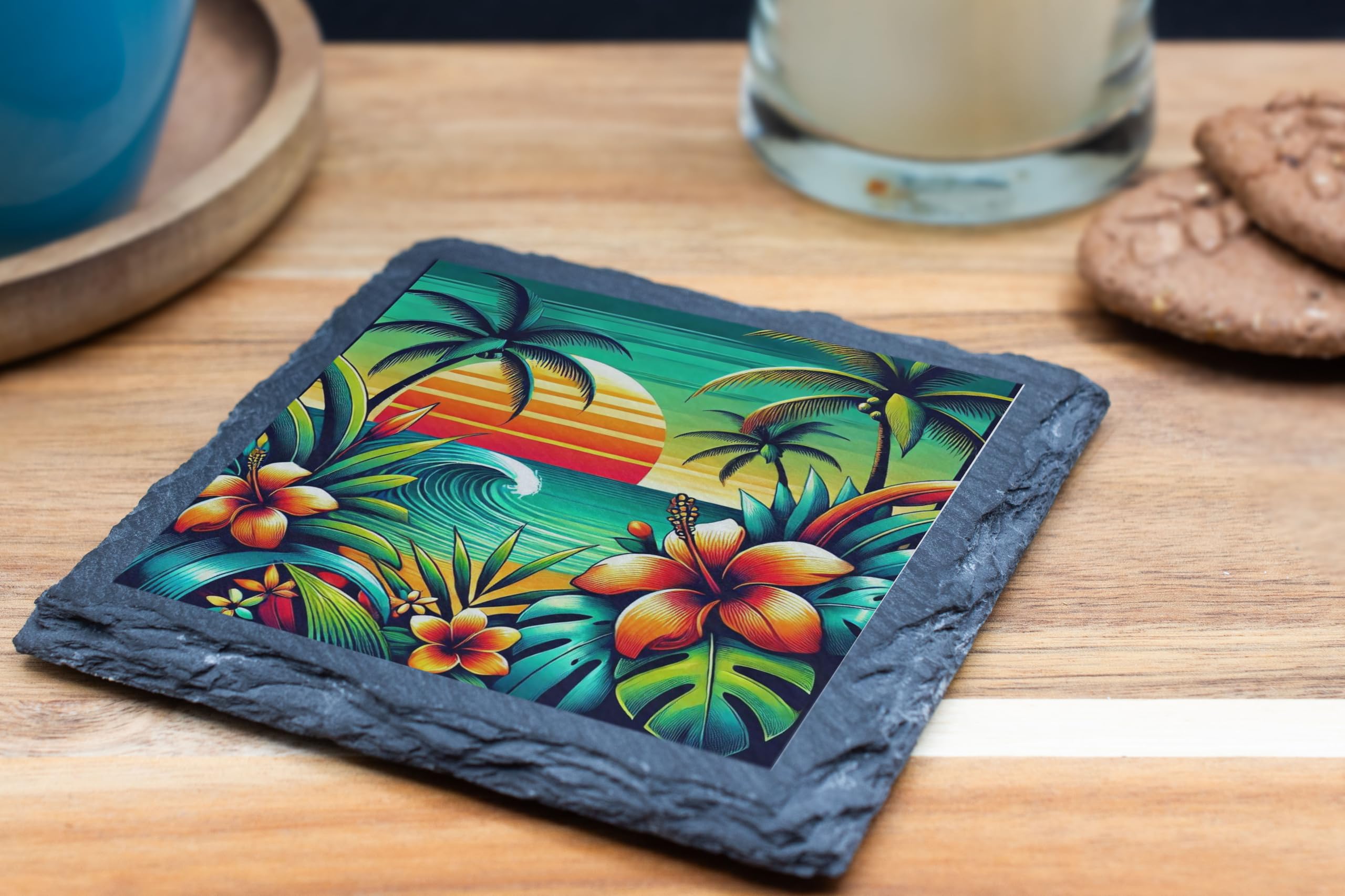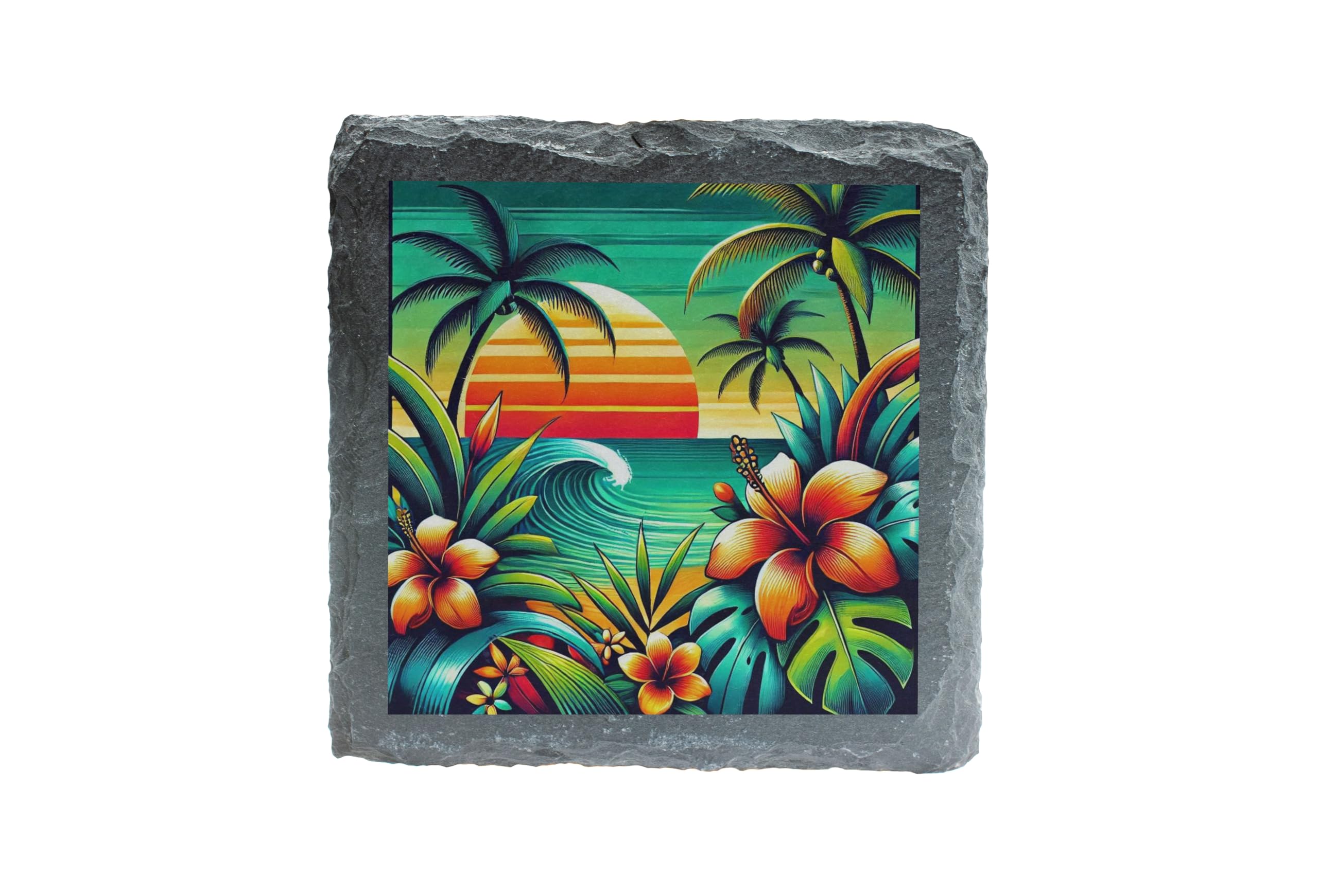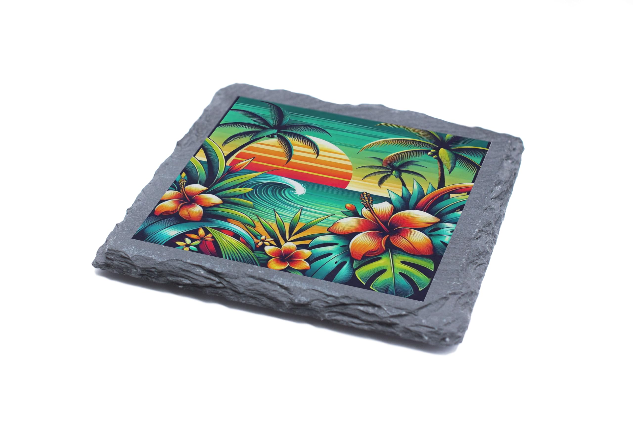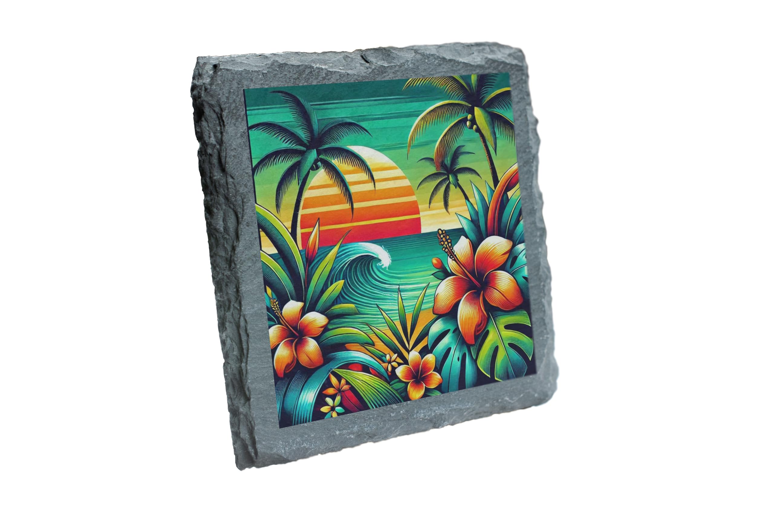 Transform your home into a tropical retreat with this stunning decorative slate coaster. The vivid design captures the essence of a serene sunset surrounded by hibiscus blooms and swaying palm trees, making it a perfect addition to any coastal or nature-inspired decor. Made from durable natural slate, this coaster not only enhances the aesthetics of your space but also provides functional protection for your surfaces. Whether you're enjoying a cool drink or simply looking for a decor piece, this coaster brings a vibrant and refreshing vibe to your home. An excellent gift idea for anyone who loves the tropics!