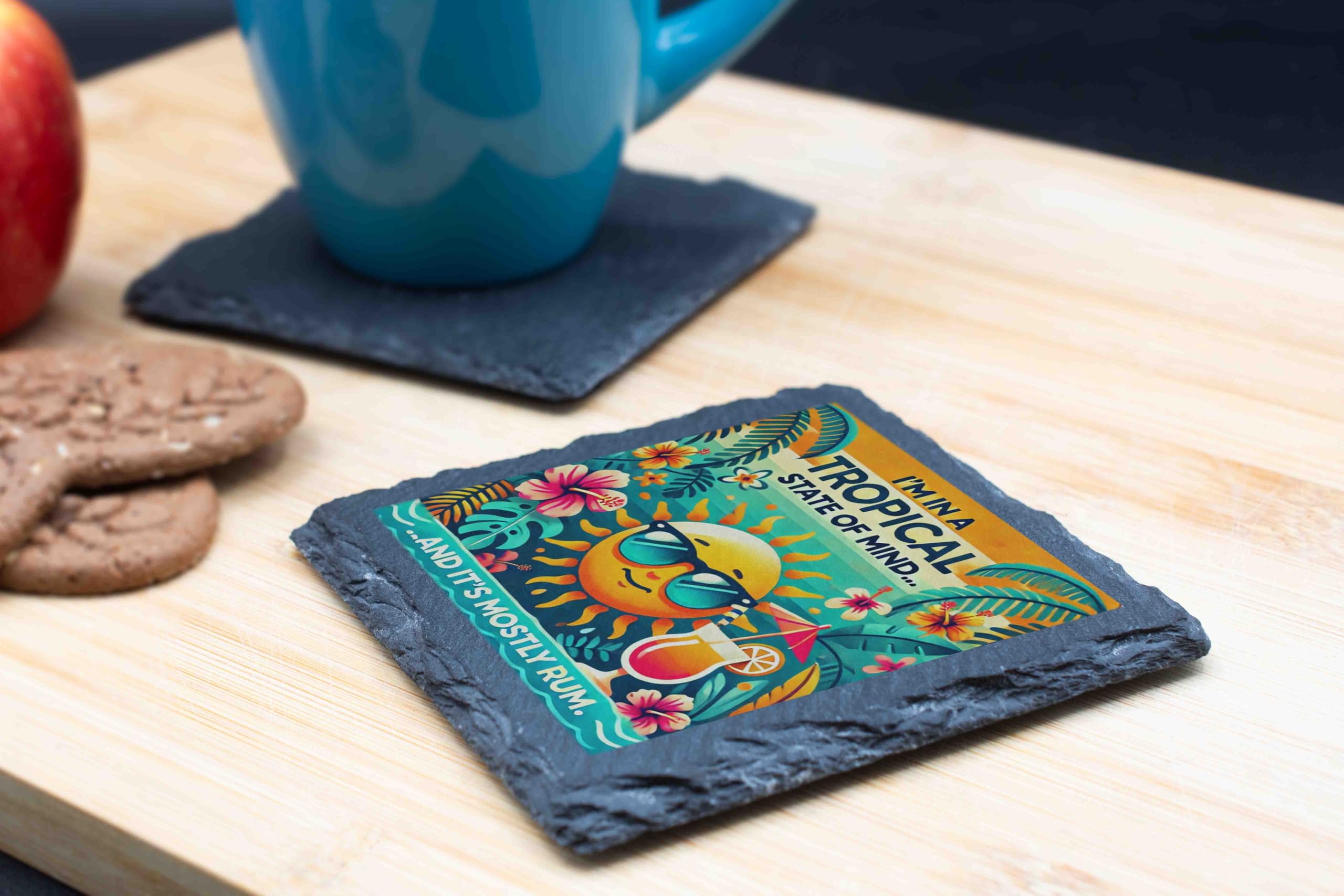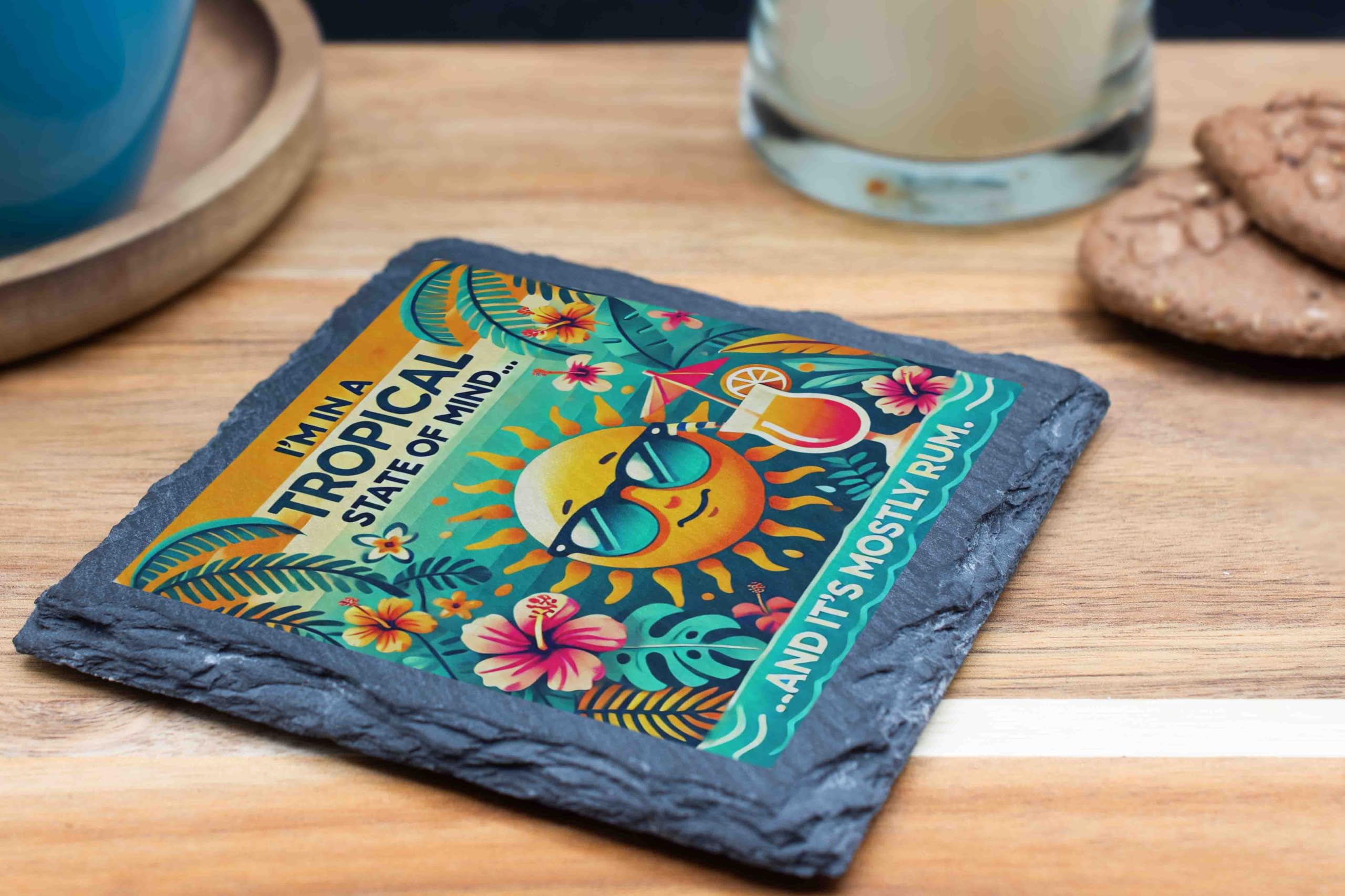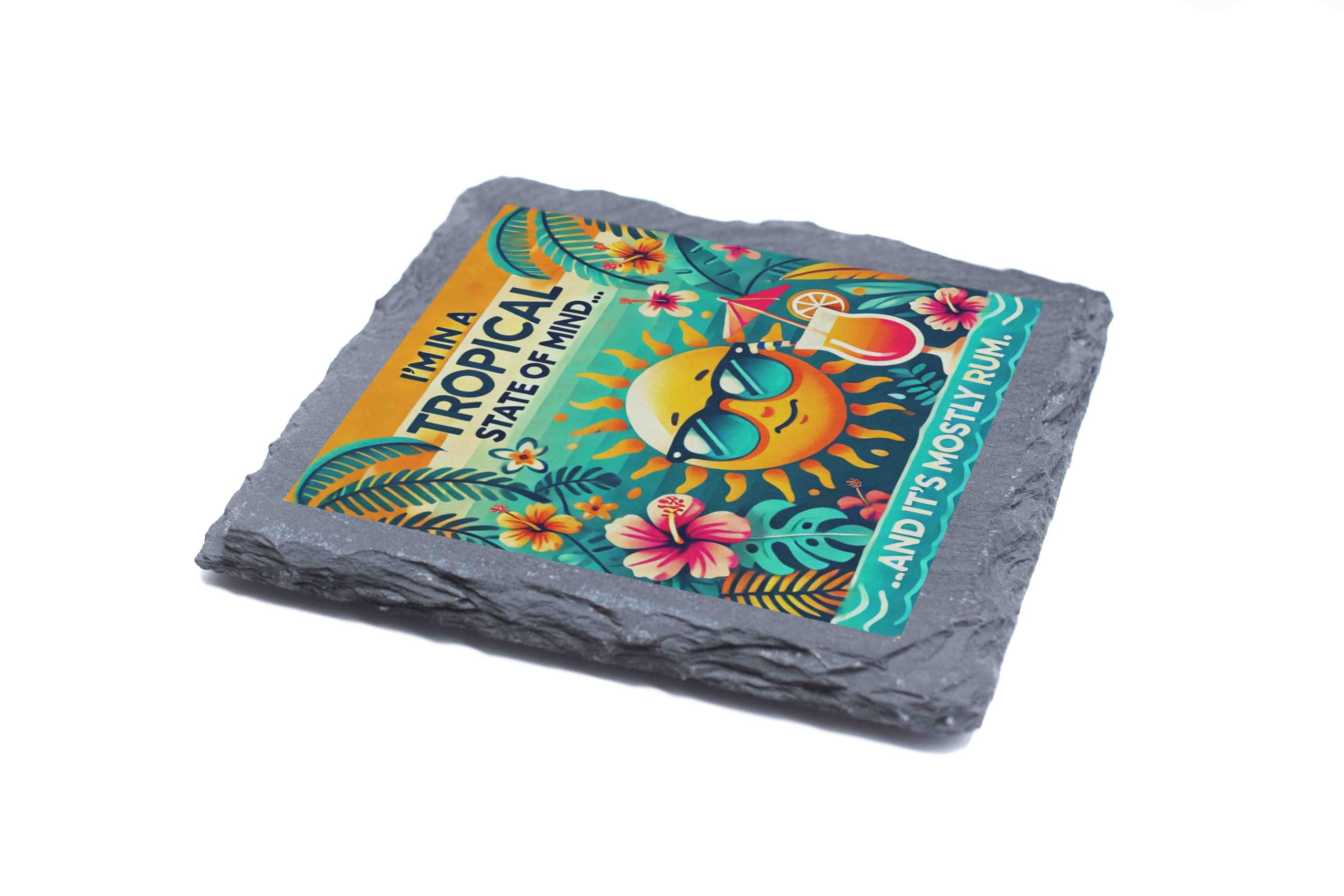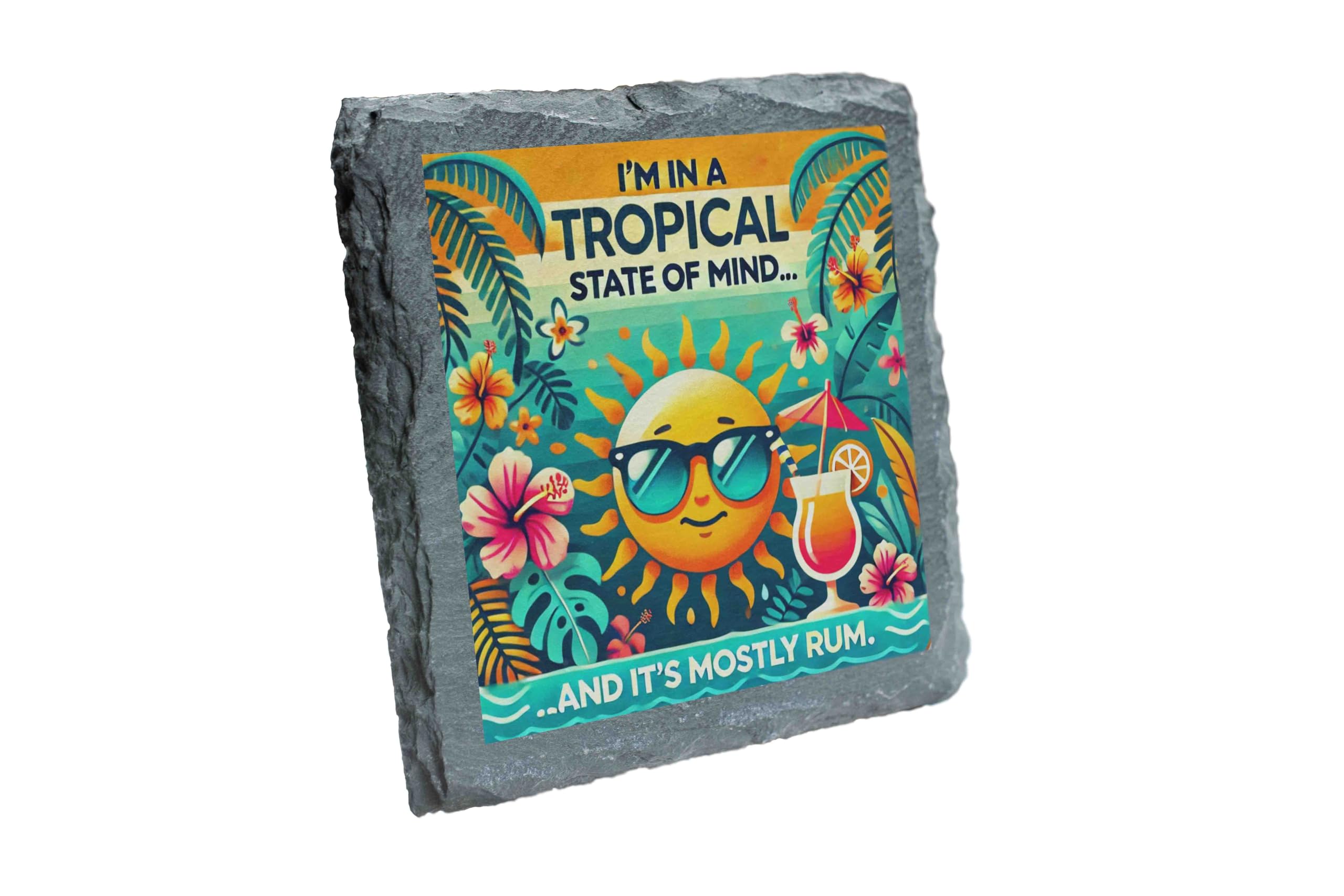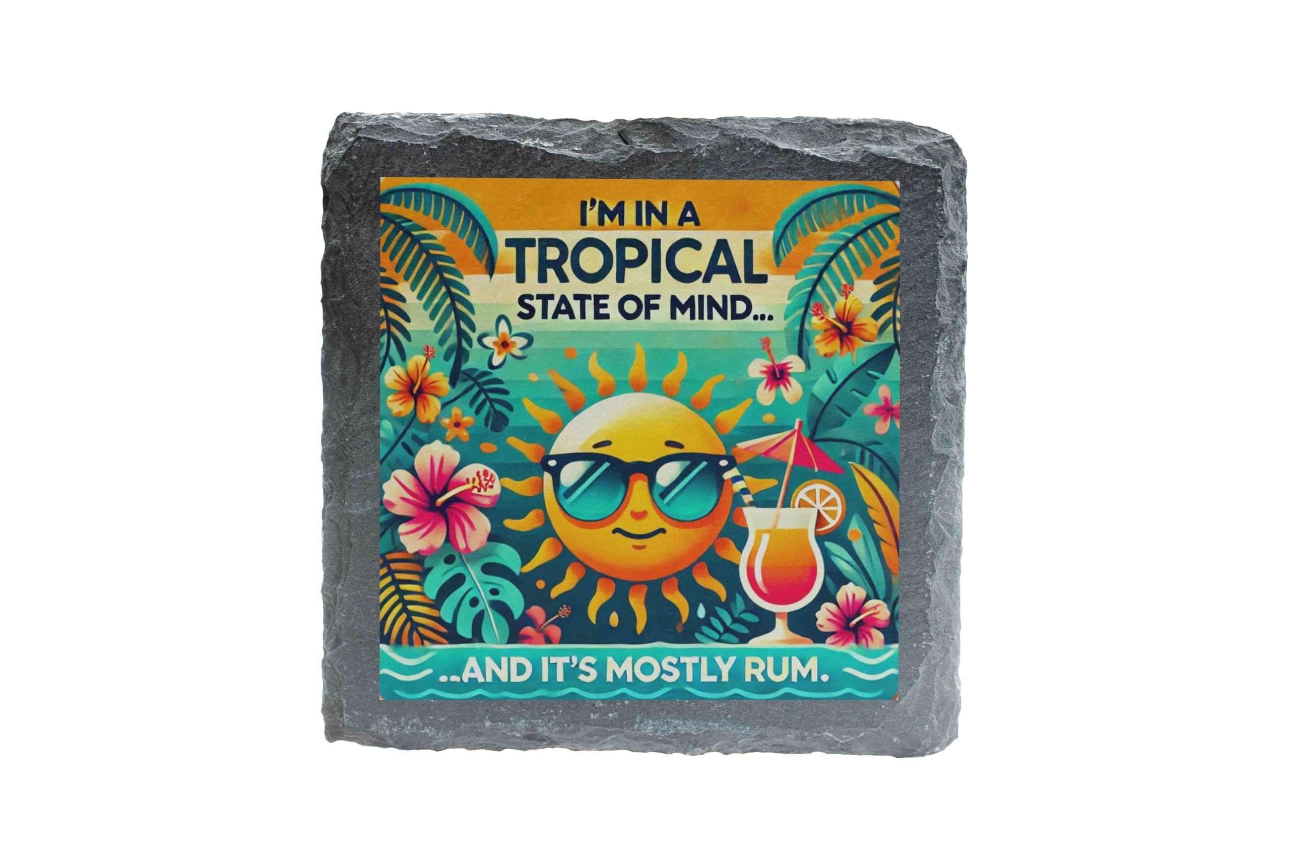 Add a splash of tropical fun to your home with this charming slate coaster featuring a vibrant "Tropical State of Mind" design. Showcasing a cool sun in sunglasses, tropical blooms, and the perfect amount of humor, this coaster is made from high-quality slate with natural edges for a rustic yet stylish look. Whether you?re sipping rum cocktails or morning coffee, this coaster provides sturdy, non-slip protection for your furniture while radiating sunny, vacation vibes. It?s the ideal accessory for beach houses, summer parties, or anyone who dreams of island getaways. Treat yourself or gift it to your favorite rum enthusiast!