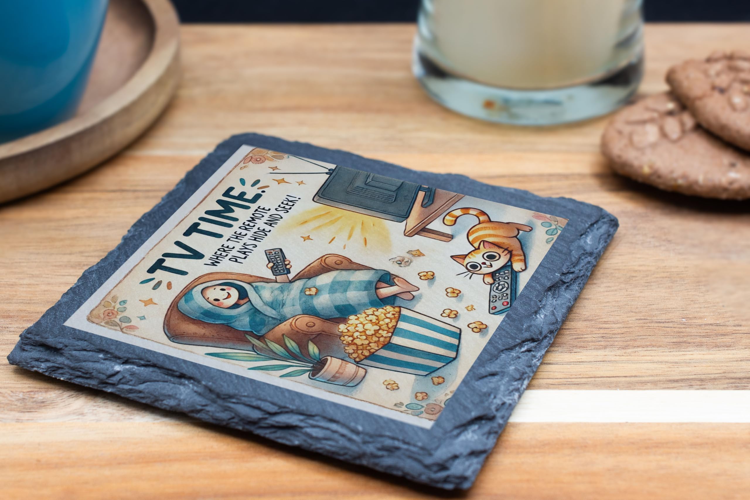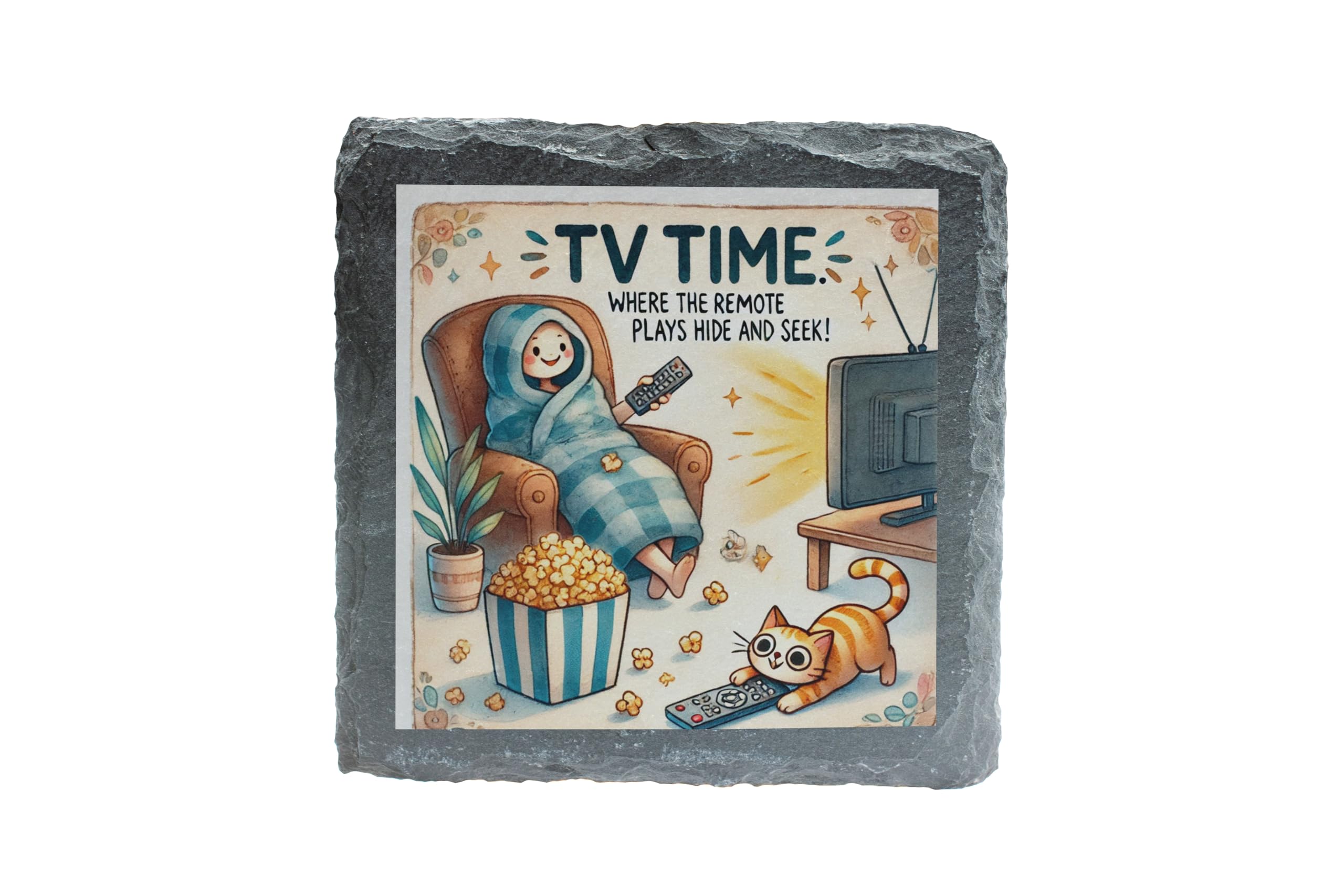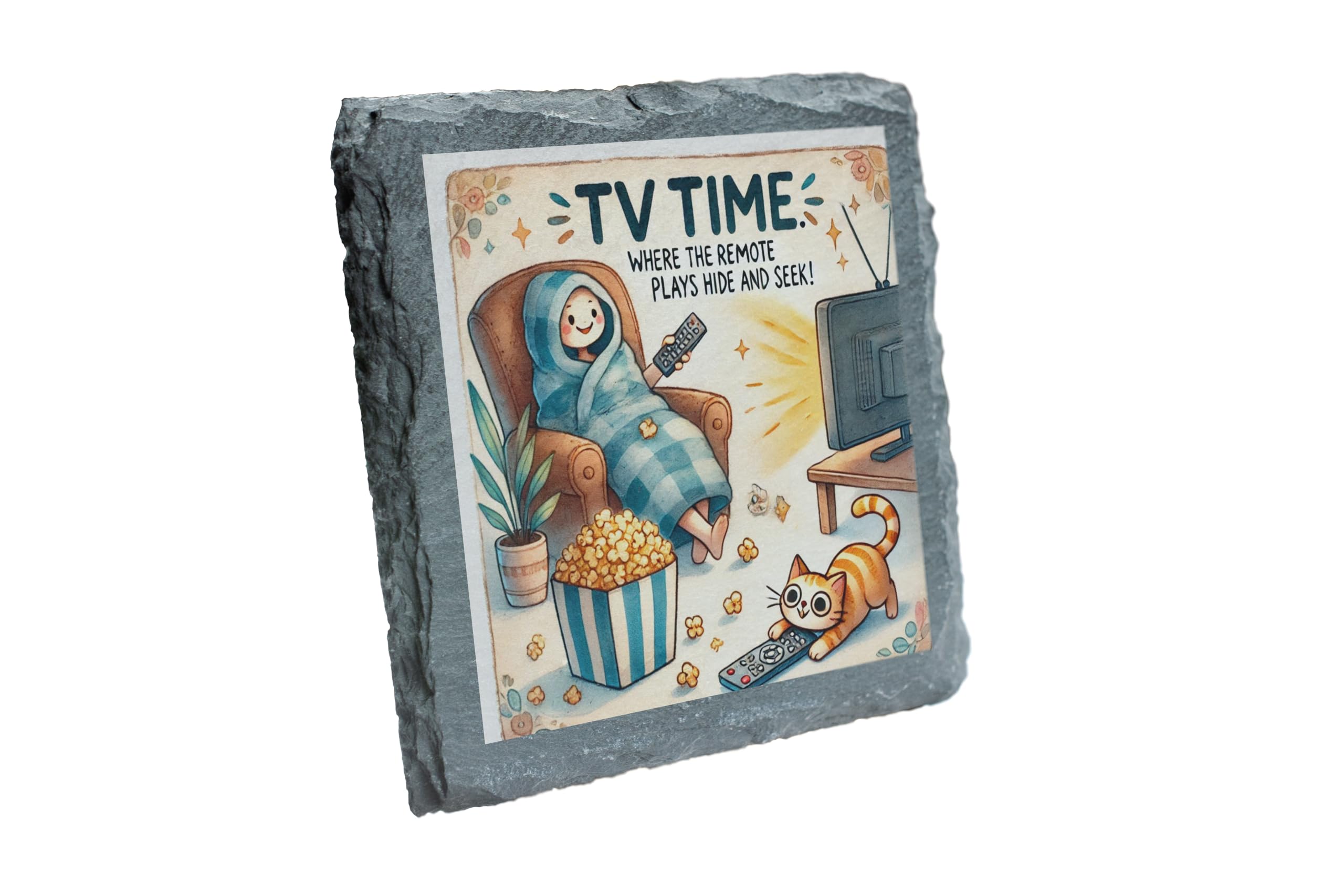 Celebrate cozy evenings with our 'TV Time' slate coaster! This delightful coaster features a whimsical illustration of a playful cat stealing the remote while popcorn spills around, capturing the humorous essence of TV nights. Made from premium natural slate, its rustic elegance enhances any decor. The fade-resistant artwork keeps the vibrant design looking new, while the coaster itself protects your surfaces from scratches and stains. This coaster is the perfect blend of functionality and style, making it an excellent gift for cat lovers or anyone who cherishes relaxed evenings with a good show. Add a touch of humor and charm to your home!
