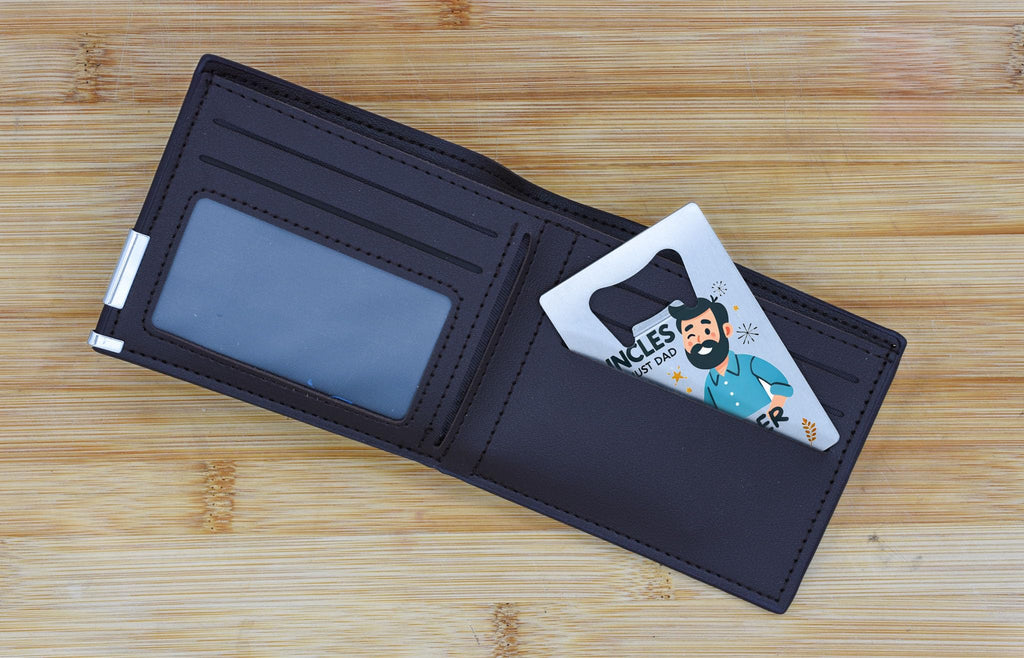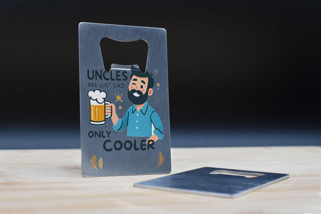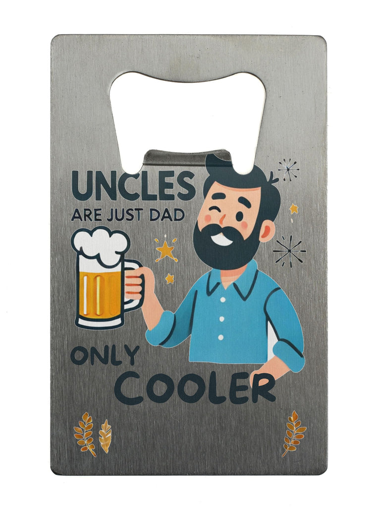 Add a touch of humour and style to your uncle's bar with this 'Uncles Are Just Dad Only Cooler' novelty metal beer bottle opener. Made from quality stainless steel, this compact and portable beer opener tool is the perfect bar accessory for any uncle who loves a cold one. The quirky design features a fun cartoon illustration that reads 'uncles are just dad only cooler', making it a unique and fun gift for your favourite uncle. This uncle-themed bottle opener is UV printed with AI-generated art in full colour, ensuring a vibrant and durable finish that will last for years to come.