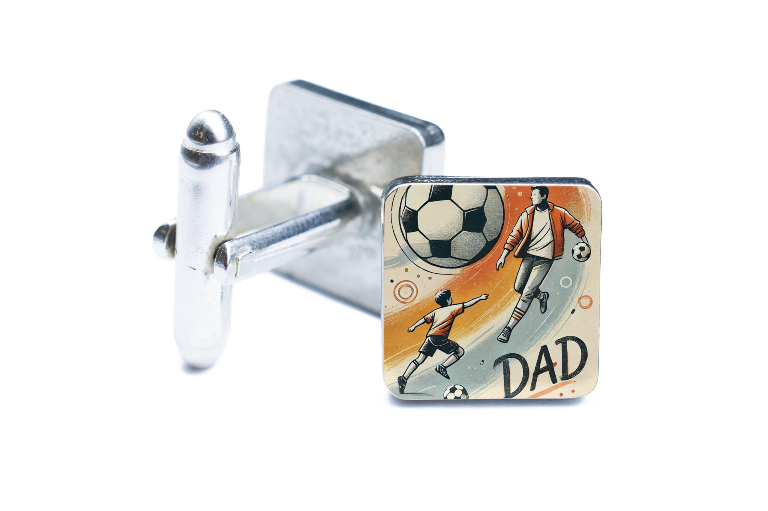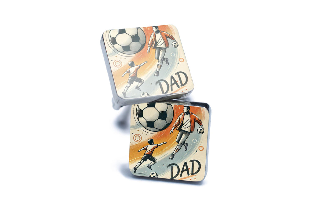 • UV printed cufflinks featuring a father-son soccer theme, perfect for men who love sports