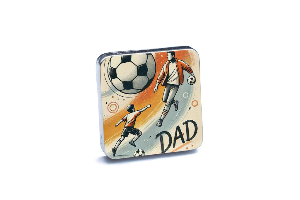 Introducing our UV Printed Soccer Dad Cufflinks - Handcrafted Tin & Pewter Football Design Accessories, the perfect gift for any soccer-loving father. These unique cufflinks feature a full-colour printed design showing a cute father and son football inspired artwork, making them a sentimental and playful accessory for dads. Handcrafted from quality tin and pewter, these novelty dad cufflinks are a must-have for any sports enthusiast. Whether it's for dad's birthday or Father's Day, these football design cufflinks are sure to be a hit. The artistic football cufflinks are a great way for father and son to bond over their love for the sport, and the UV printed design adds a touch of modernity to these classic accessories.