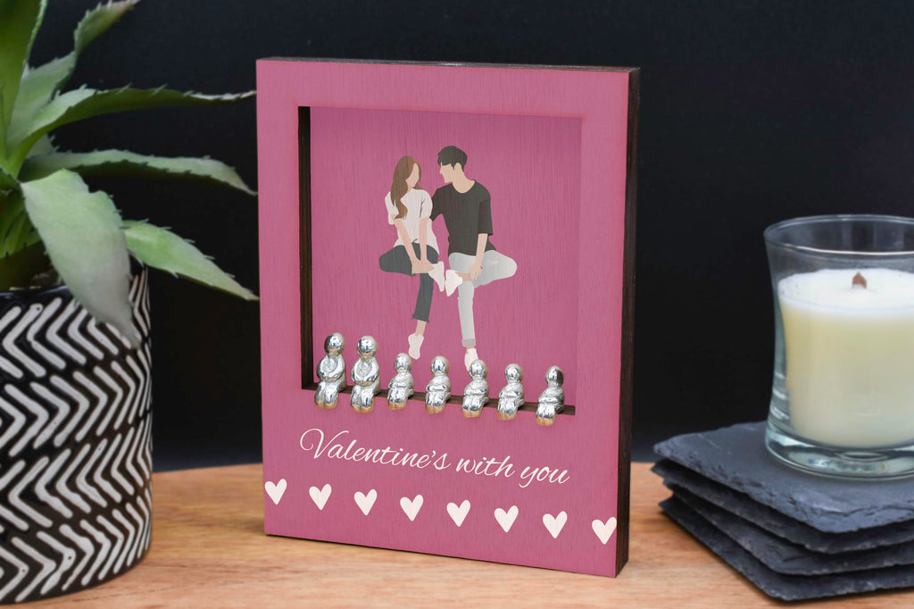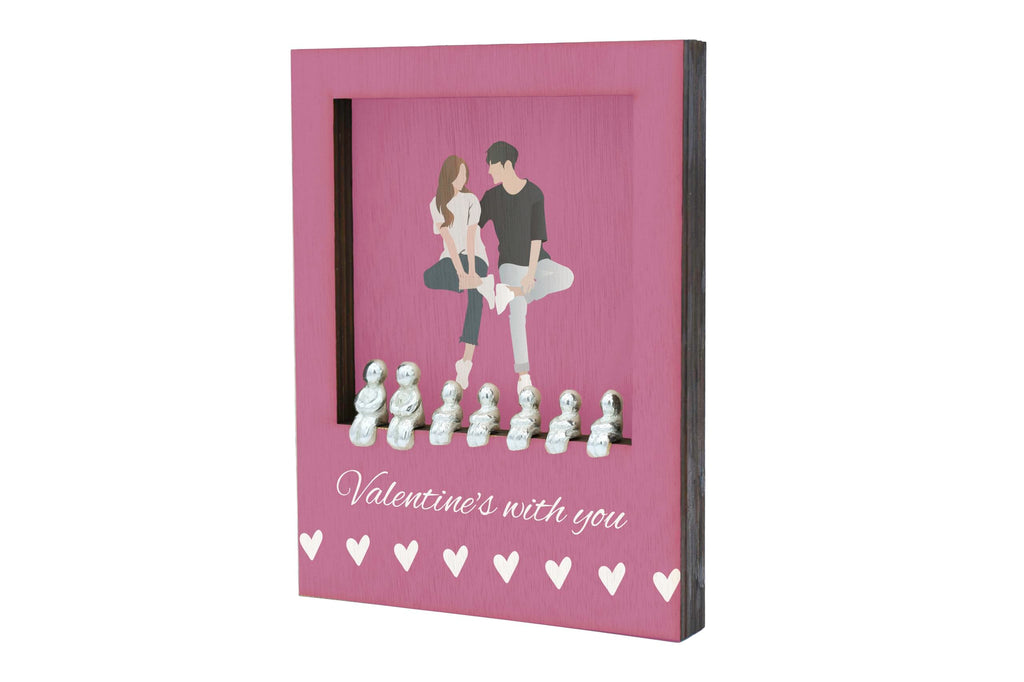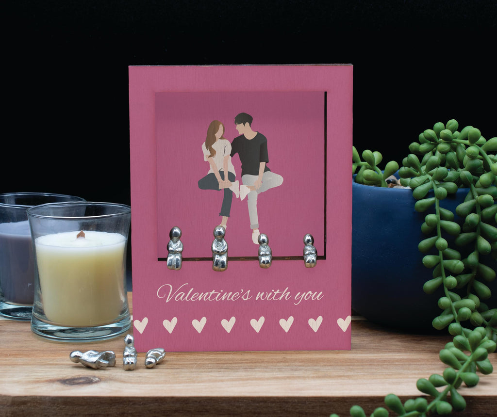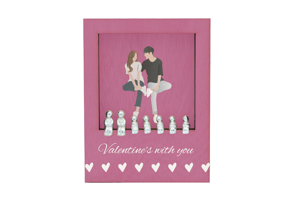 Celebrate love and family with our Valentines with You - Romantic Family Plywood Ornament. This beautiful ornament features a pink background with white writing that reads 'Valentines with You'. It is the perfect addition to your home decor, adding a touch of romance to any space. The ornament is made of quality plywood and comes with a set of 7 metal figures that fit perfectly into the frame. The figures can be customised to represent your own family combination, allowing you to create a truly unique and personal decoration. The ornament is free standing and printed in full colour, making it a stunning focal point in any room. Show your love and create lasting memories with this romantic home ornament.
