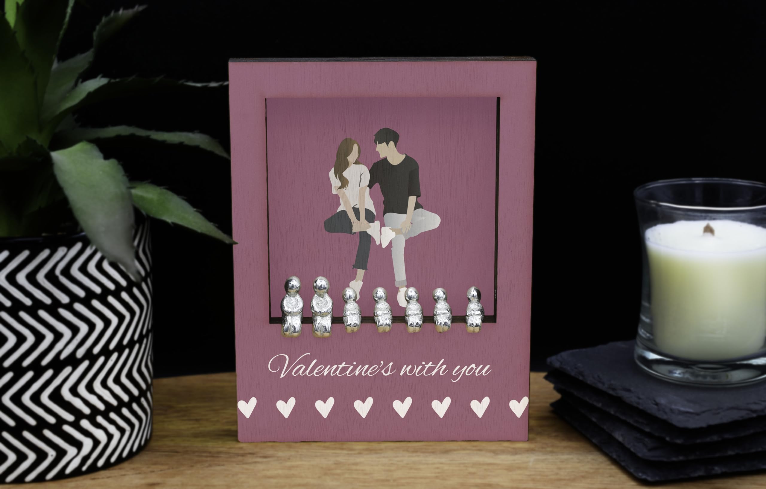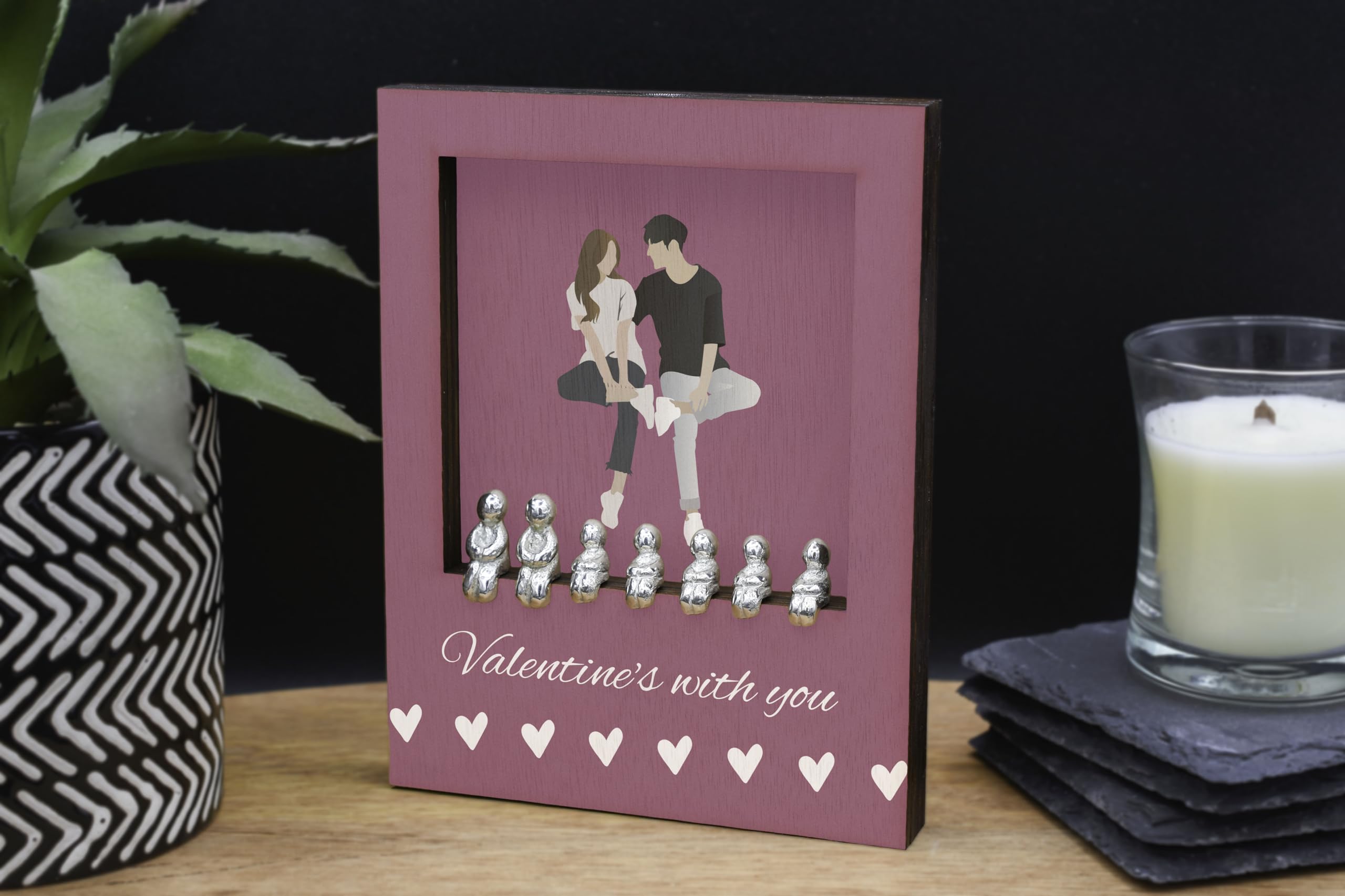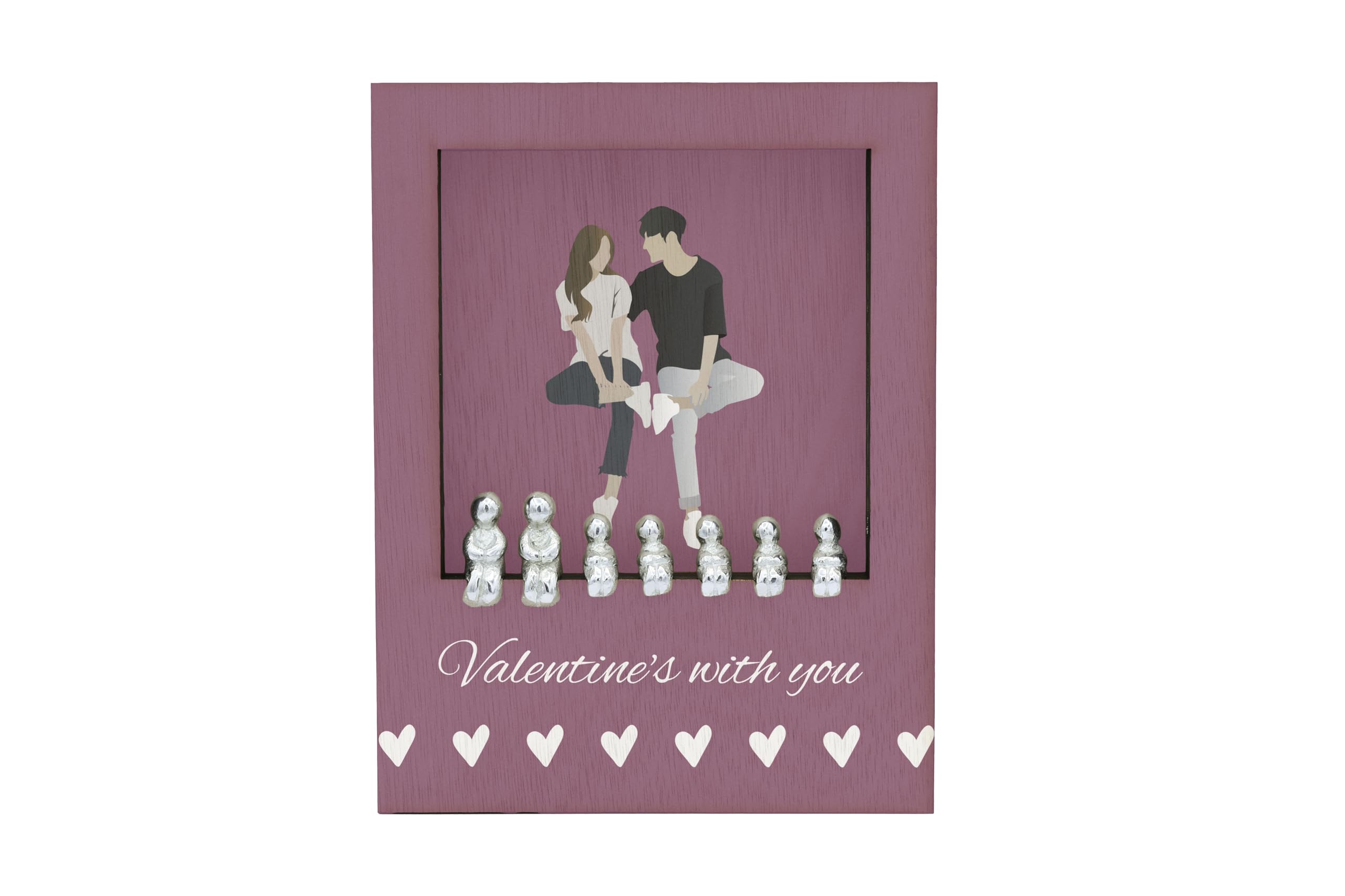 Celebrate love and family with our Valentines with You - Romantic Family Plywood Ornament. This beautiful ornament features a pink background with white writing that reads 'Valentines with You'. It is the perfect addition to your home decor, adding a touch of romance to any space. The ornament is made of quality plywood and comes with a set of 7 metal figures that fit perfectly into the frame. The figures can be customised to represent your own family combination, allowing you to create a truly unique and personal decoration. The ornament is free standing and printed in full colour, making it a stunning focal point in any room. Show your love and create lasting memories with this romantic home ornament.
