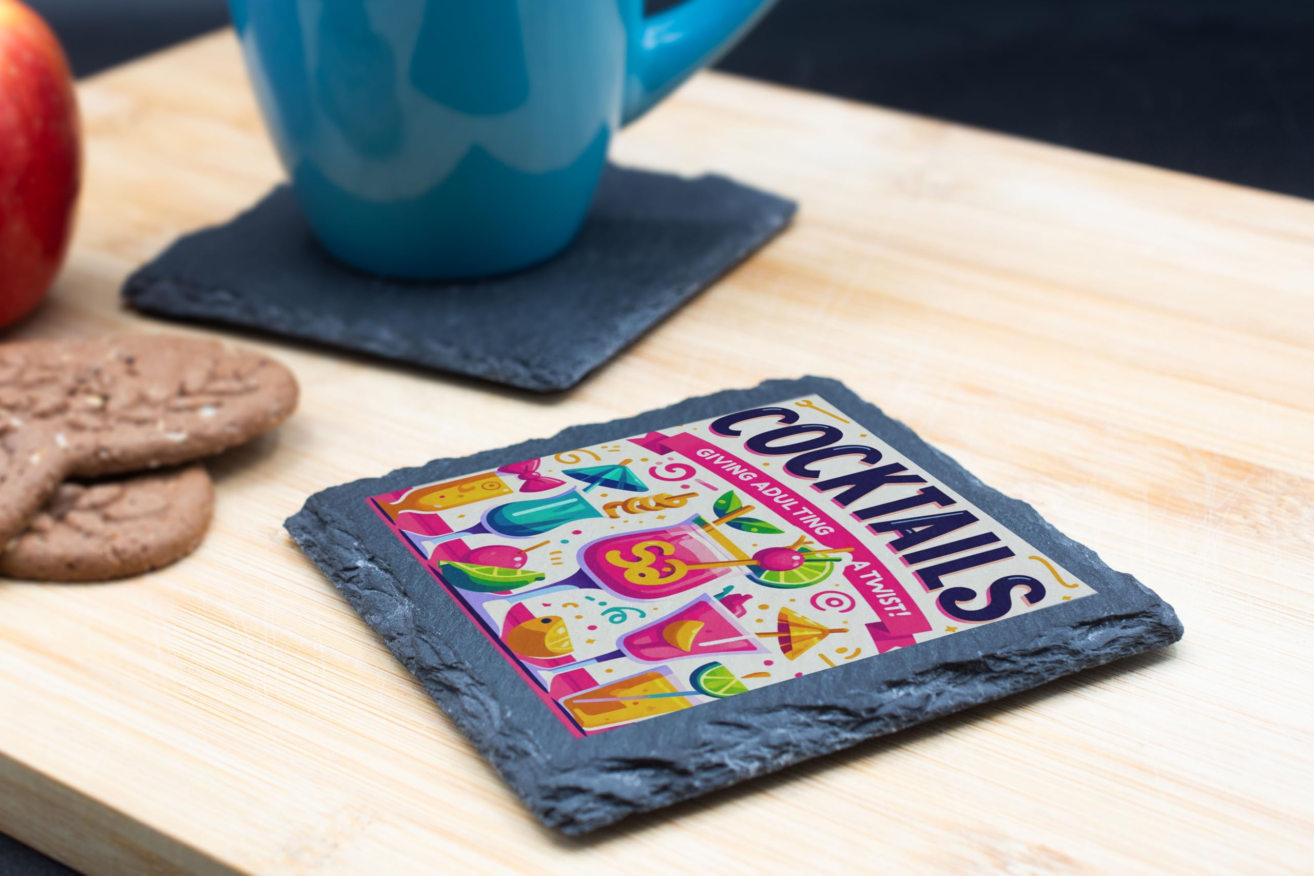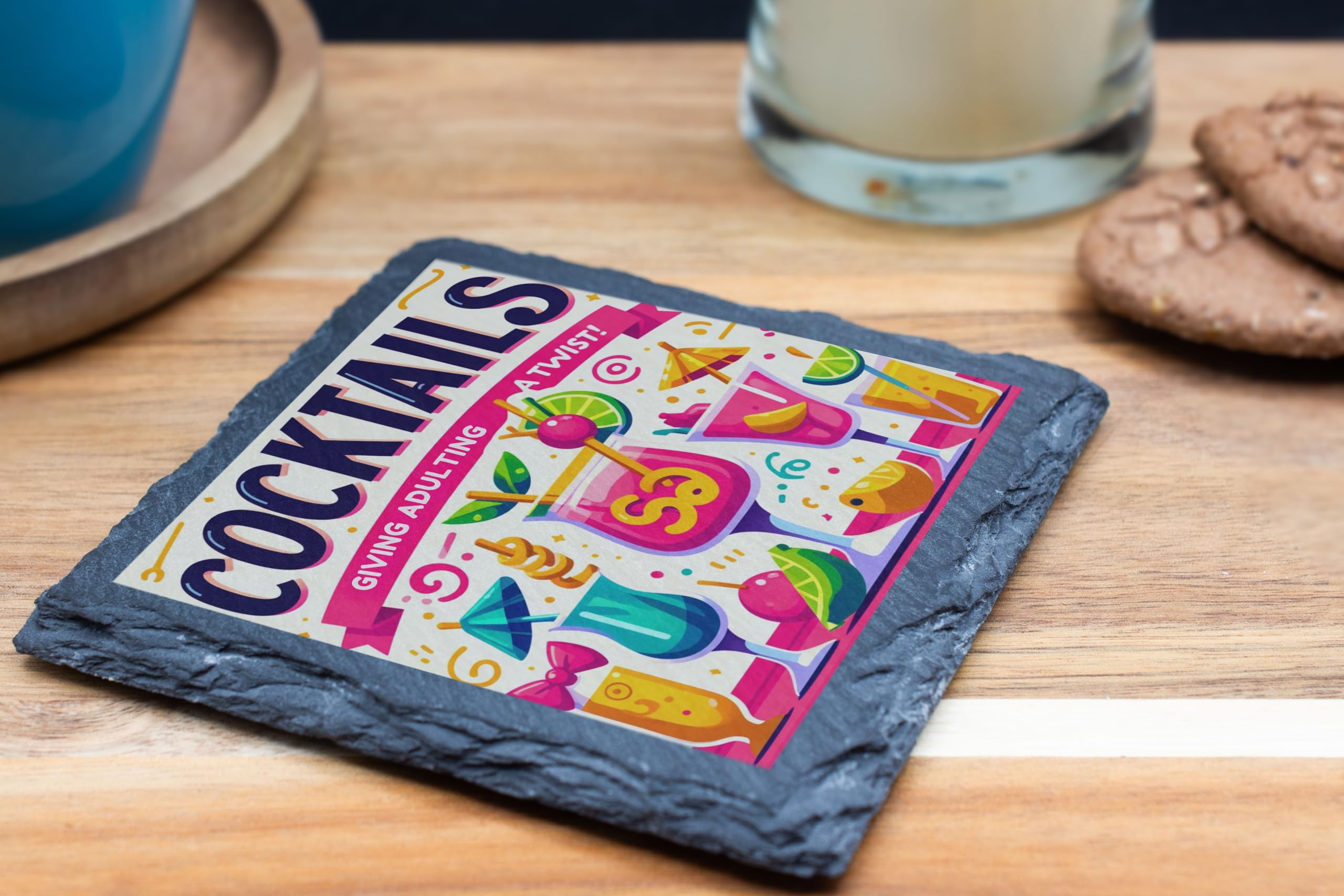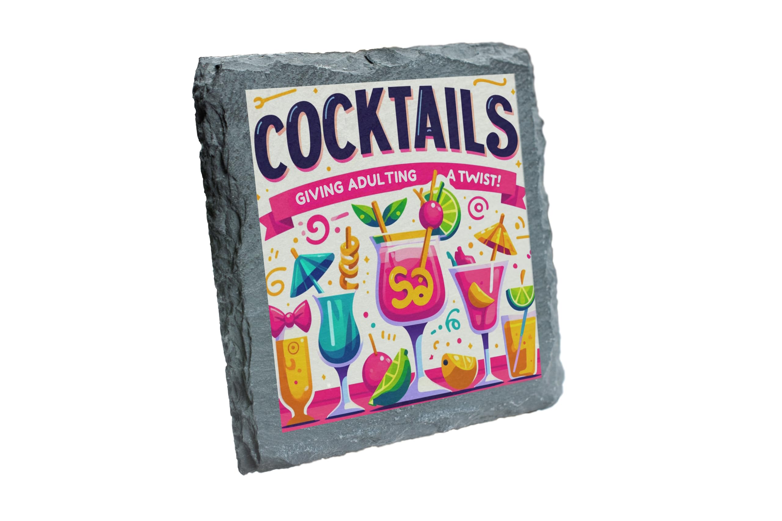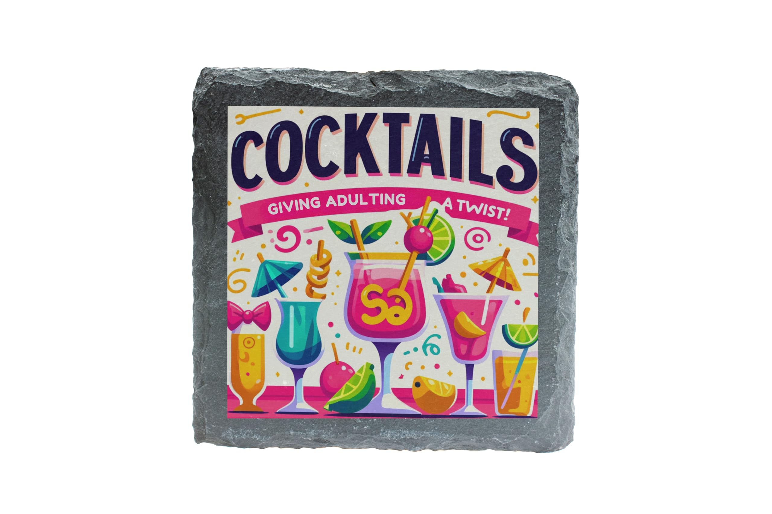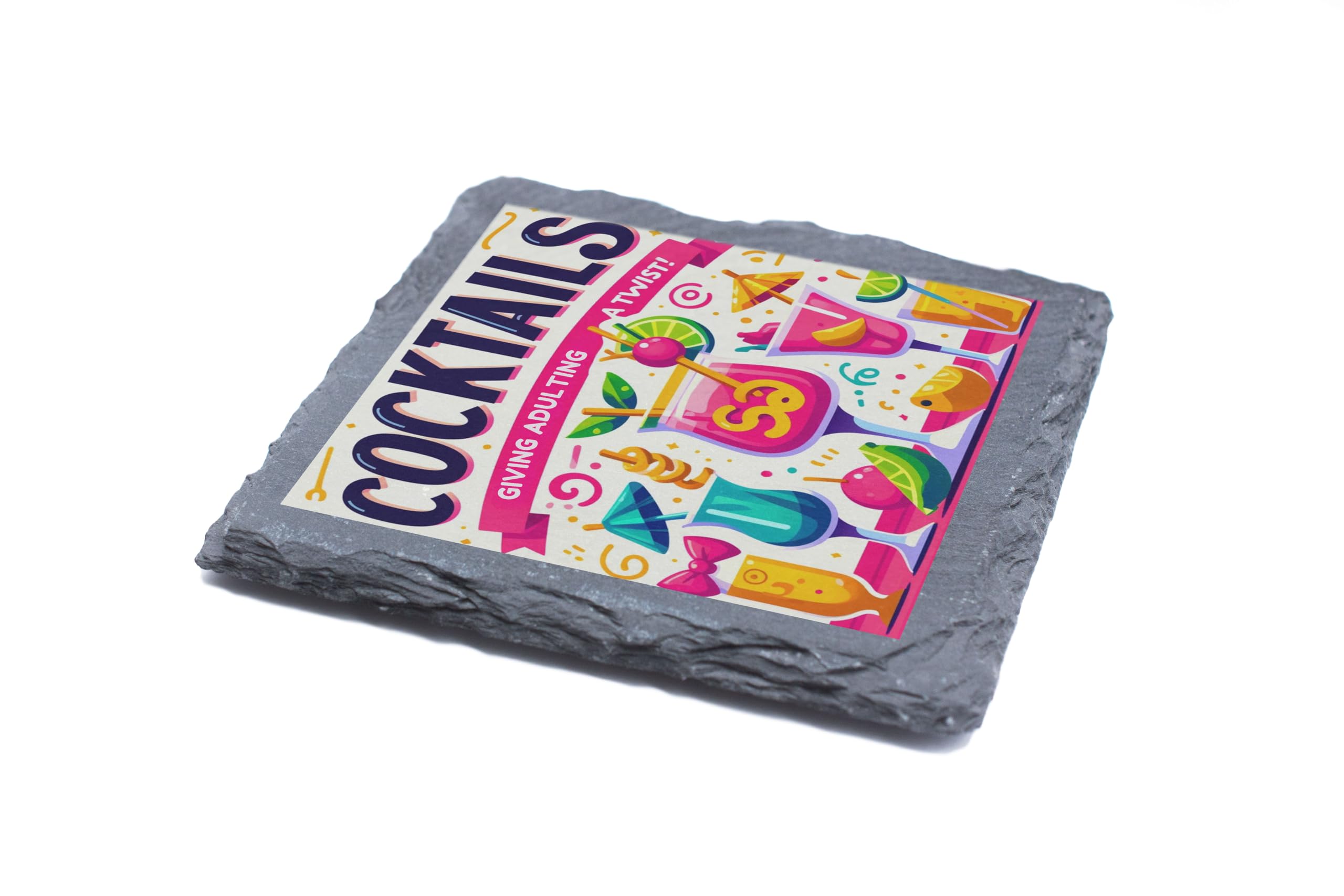 Elevate your cocktail experience with this vibrant and quirky slate coaster. Featuring the witty phrase "Cocktails: Giving Adulting a Twist," it's the perfect blend of functionality and fun. Made from high-quality slate with a natural, raw edge, this coaster is as durable as it is stylish. Its colorful and lively design will brighten up any home bar or coffee table, making it the ultimate conversation starter. Whether you're hosting a cocktail party, looking for a cheerful gift, or enjoying a quiet drink, this coaster is the perfect companion for your favorite beverages.