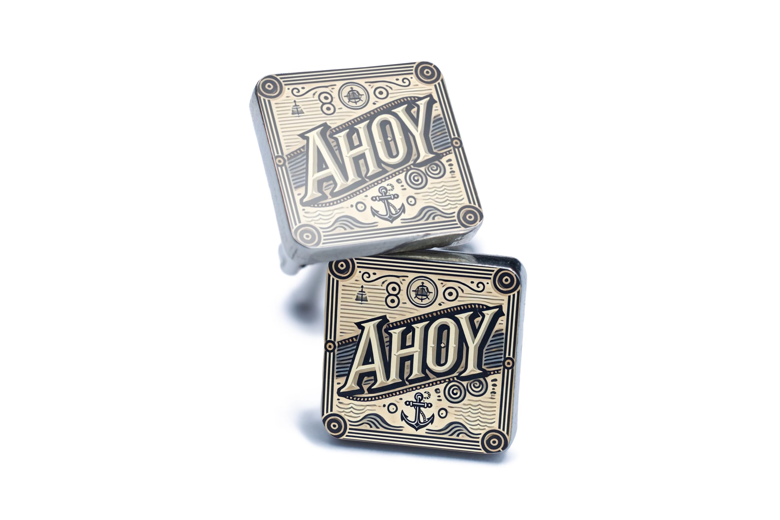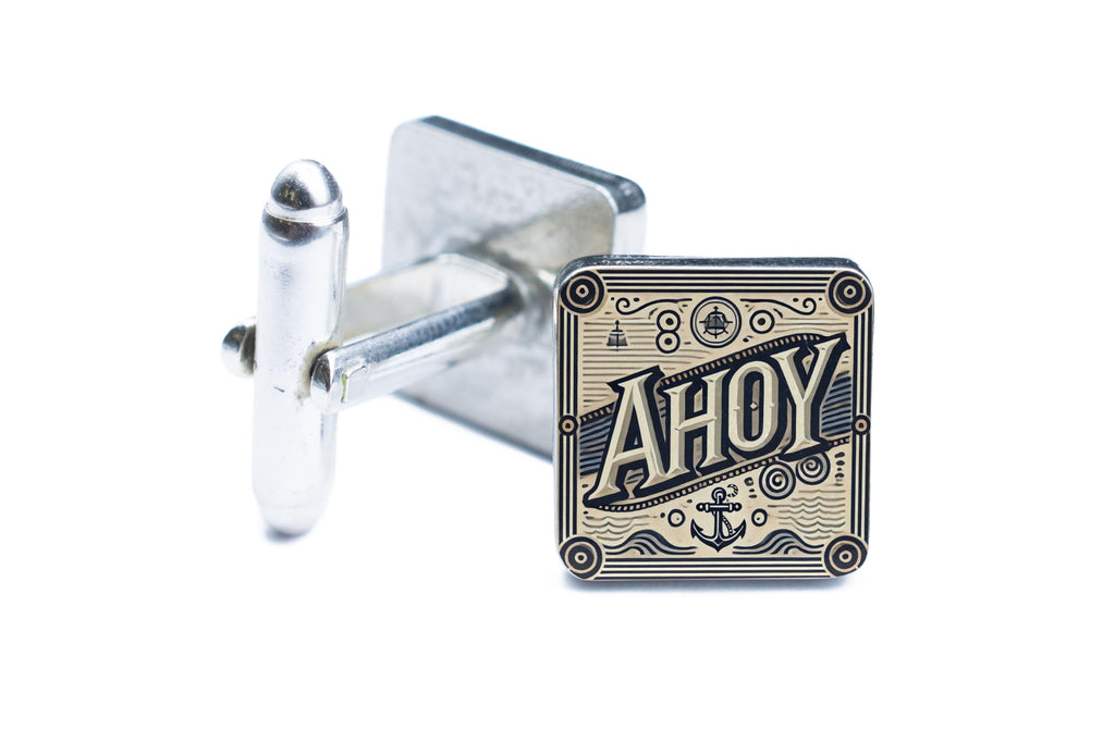Introducing our Vintage Nautical Cufflinks, the perfect accessory for any sailor-inspired outfit. These novelty cufflinks are handcrafted with a unique anchor design, bringing a touch of vintage maritime charm to your formal attire. The 'Ahoy' artwork is UV printed on these stylish men's accessories, adding a pop of colour and personality to your outfit. Made from handcrafted tin and pewter, these retro nautical cufflinks are a unique gift for men who appreciate ocean-inspired fashion. Whether you're a sailor yourself or know someone who is, these cufflinks are sure to be a hit.