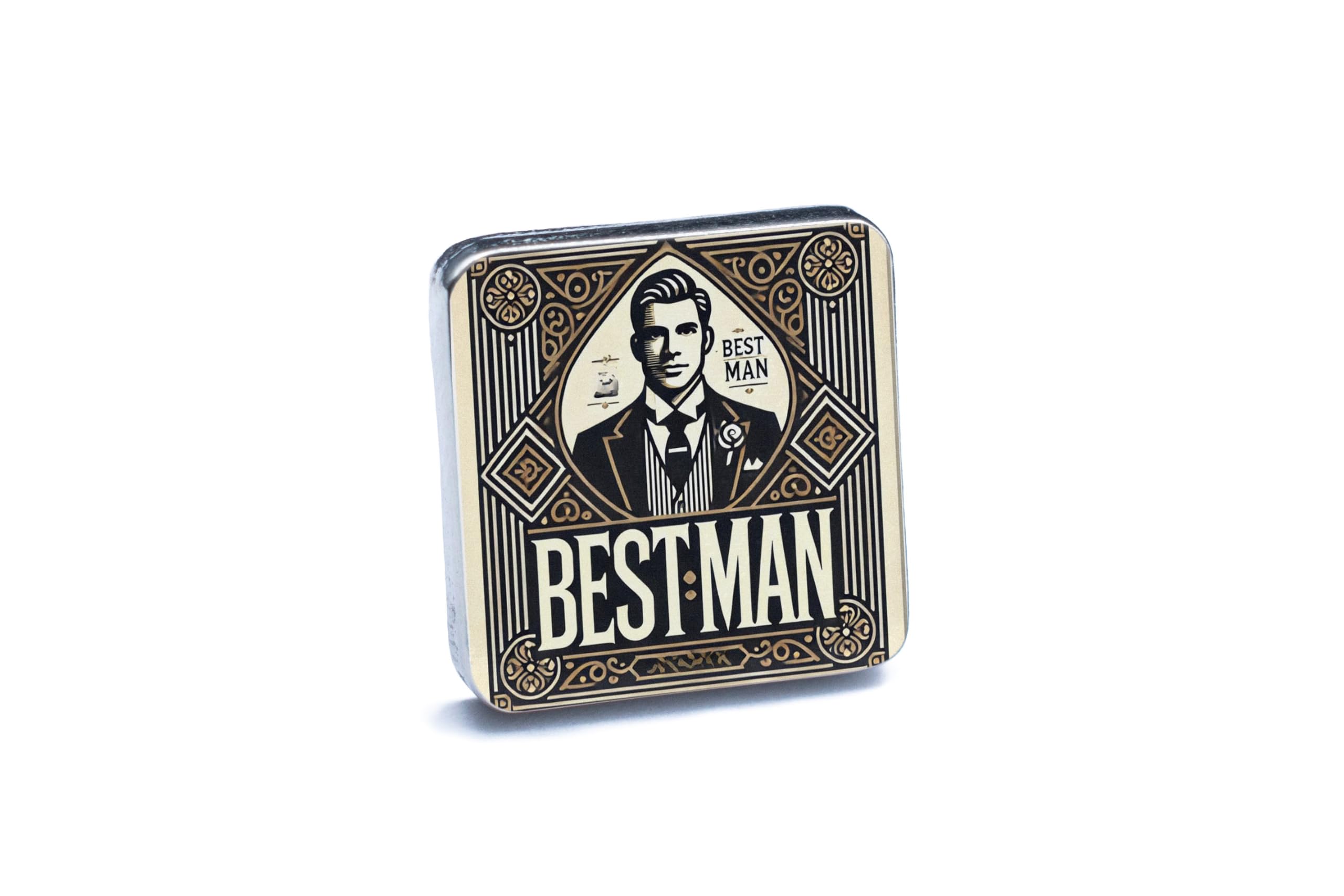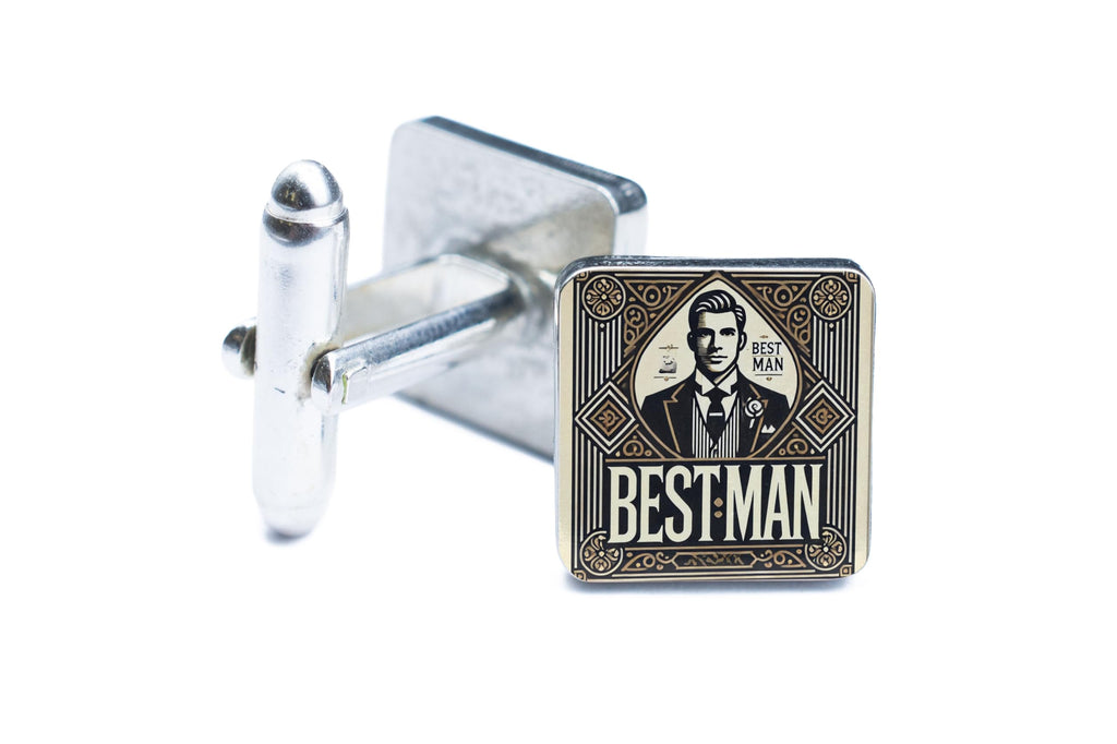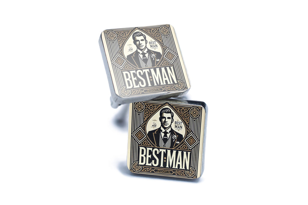 These Vintage Style Handcrafted Tin Cufflinks with UV Printed Art Deco Design are the perfect accessory for weddings, formal events, or just to add a touch of retro charm to your everyday attire. Crafted from quality tin and pewter, these cufflinks are designed to last and will make a stylish statement every time you wear them. The UV printed art deco design is a stunning marriage of modern technology and classic design, creating a unique look that is sure to impress. These cufflinks read 'Best Man' in an elegant font, making them an ideal gift for your best man or groomsmen. Add a touch of vintage style and sophistication to your ensemble with these exquisite cufflinks.