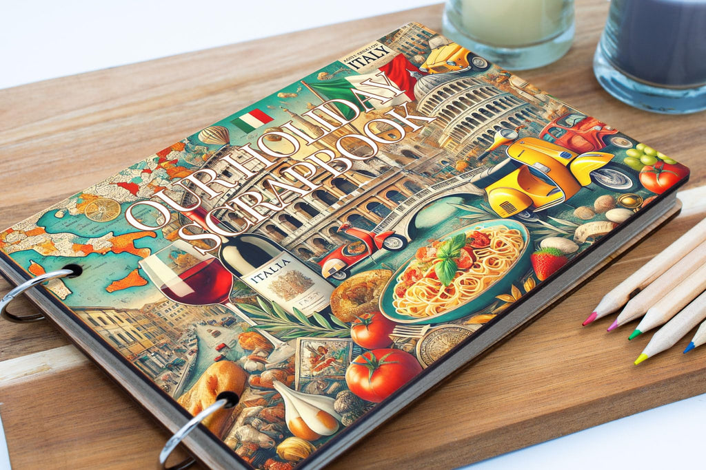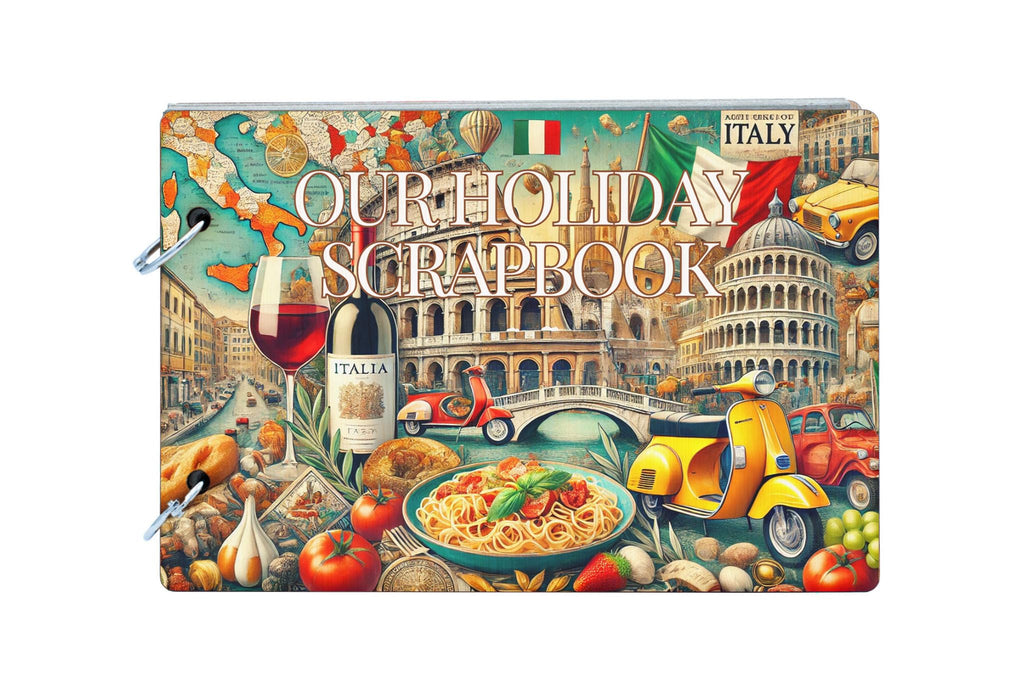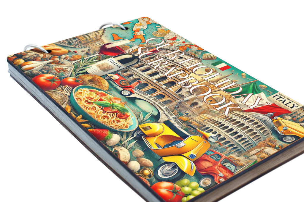 - Artistic wooden cover with AI Generated cover art, 25 recycled pages, reads 'Our Holiday Scrapbook', full-colour Italy-inspired collage