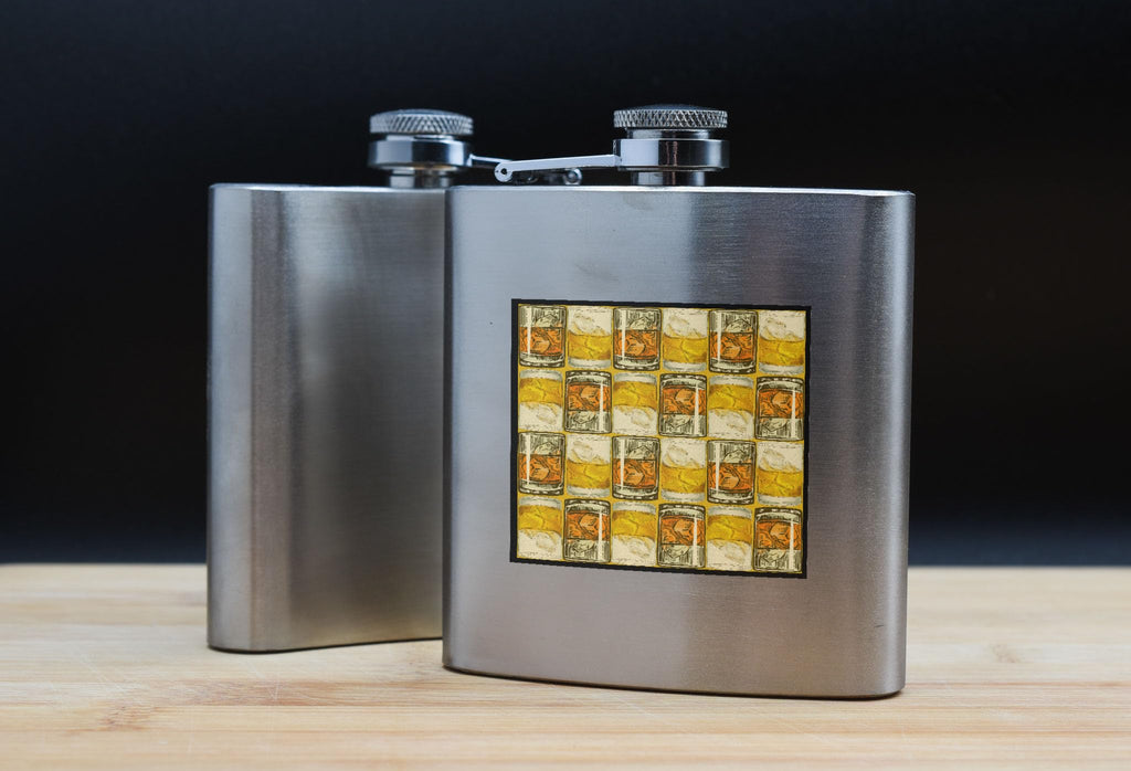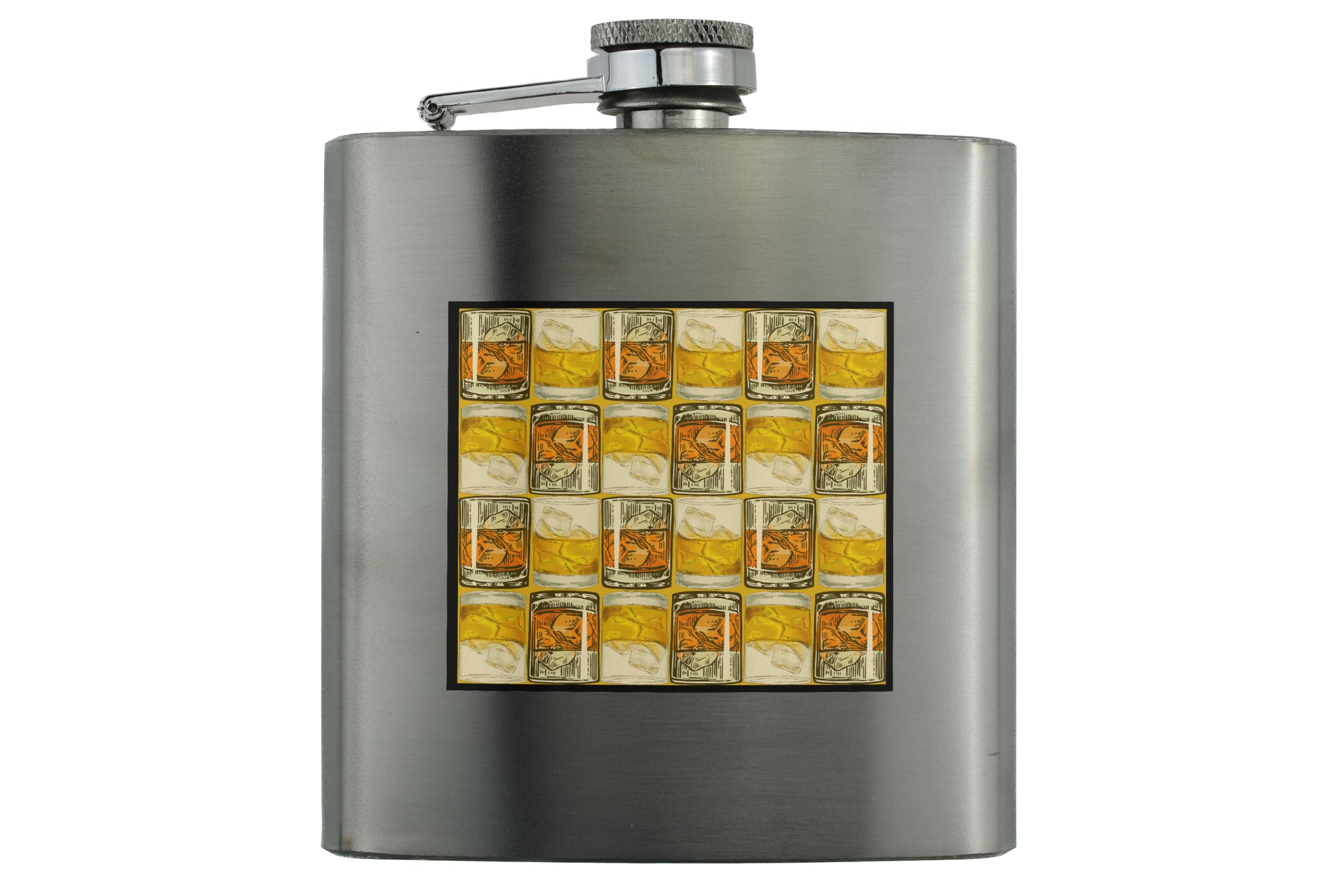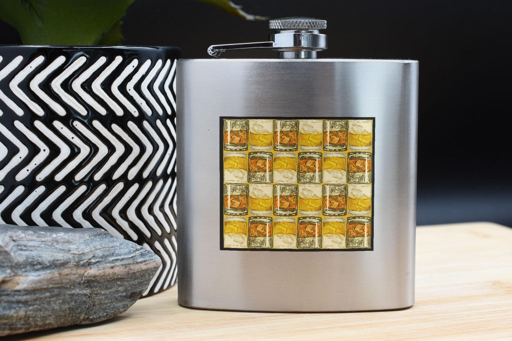 Introducing our Vintage Whiskey Patterned Stainless Steel Hip Flask, the perfect accessory for any cocktail lover or whiskey enthusiast. This flask features a unique and stylish design inspired by classic whiskey glasses, making it the ultimate beverage-themed flask. Made from quality stainless steel, this retro-style flask is not only durable but also adds a touch of elegance to any drinking occasion. The full-colour UV printed design showcases a vintage drink pattern, making it a standout piece in any barware collection. Whether you're out on the town or enjoying a drink at home, this art print flask is sure to impress. Treat yourself or gift it to a friend - either way, this classic whiskey flask is sure to be a hit.