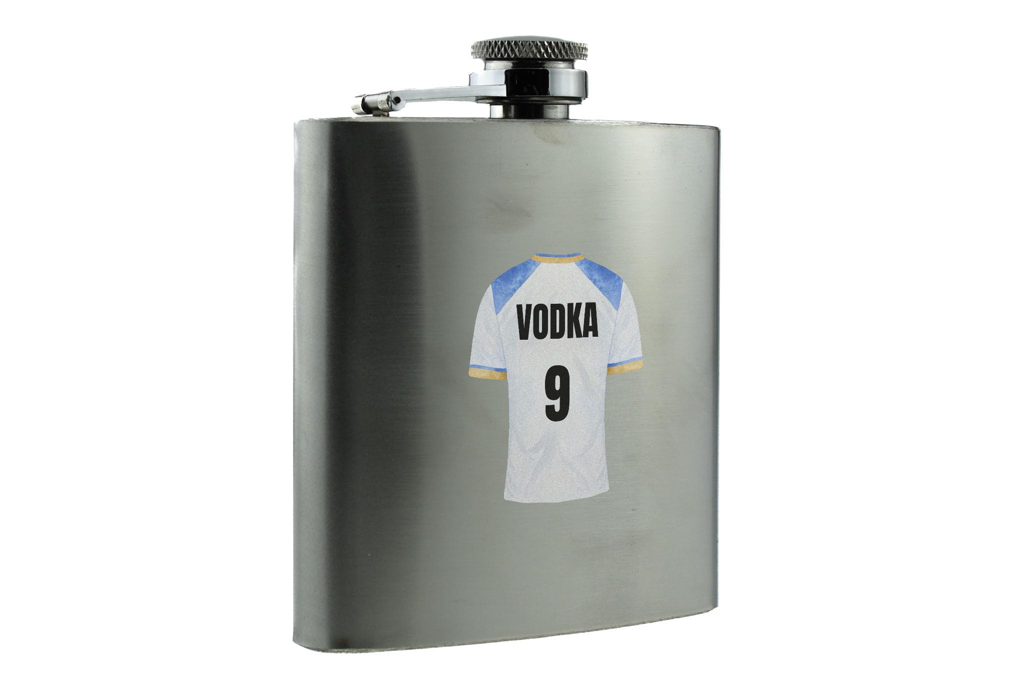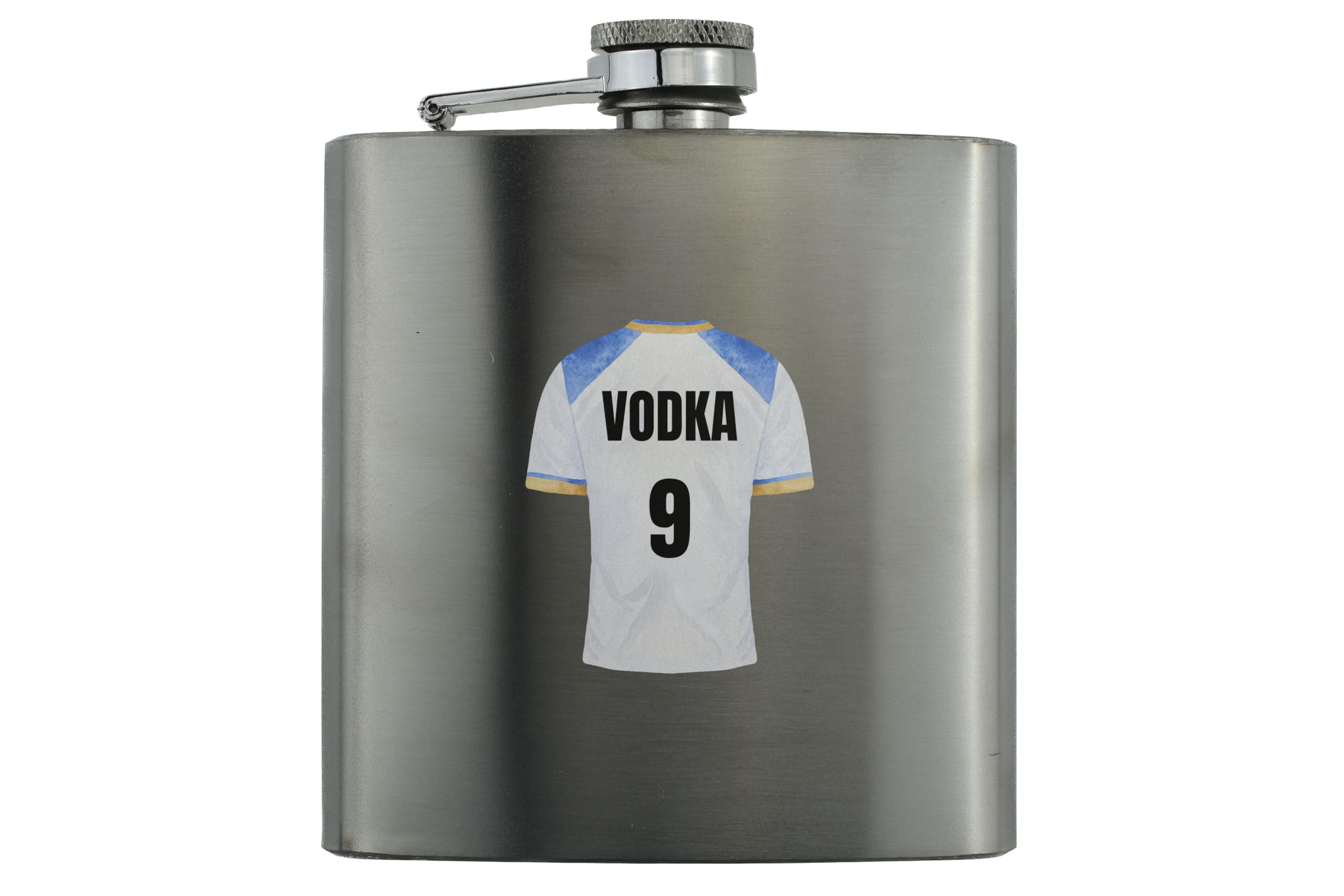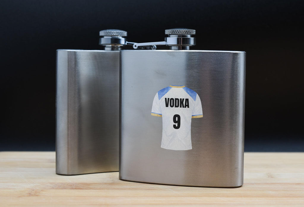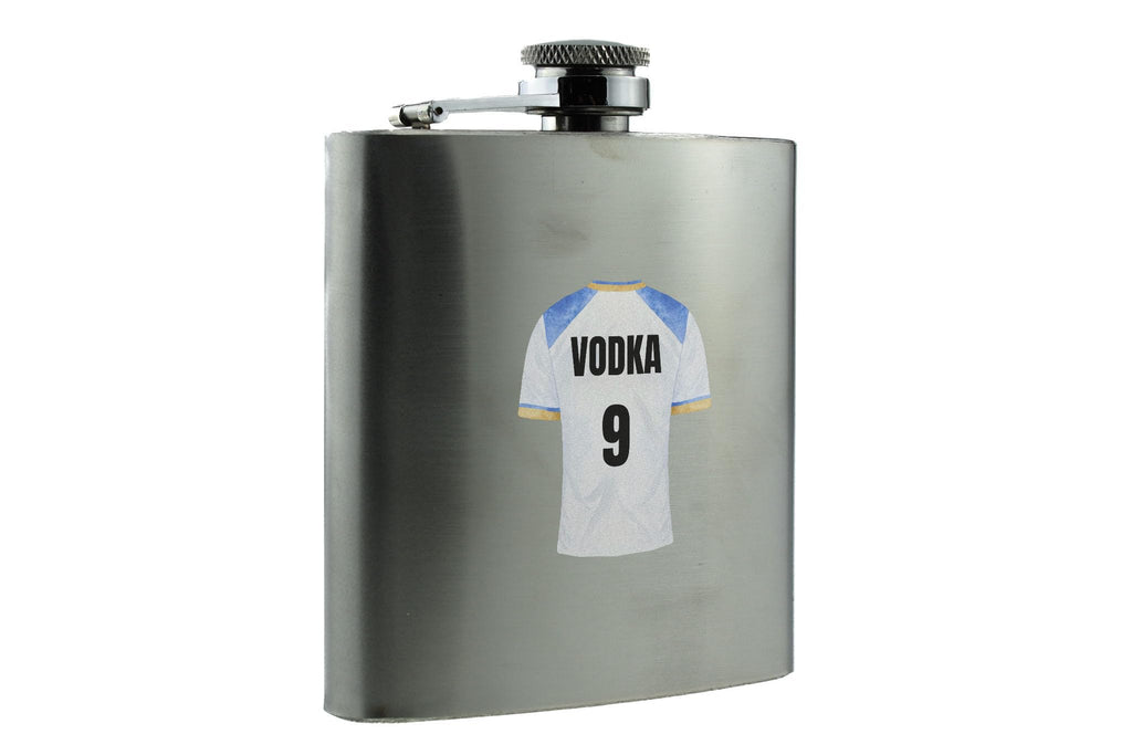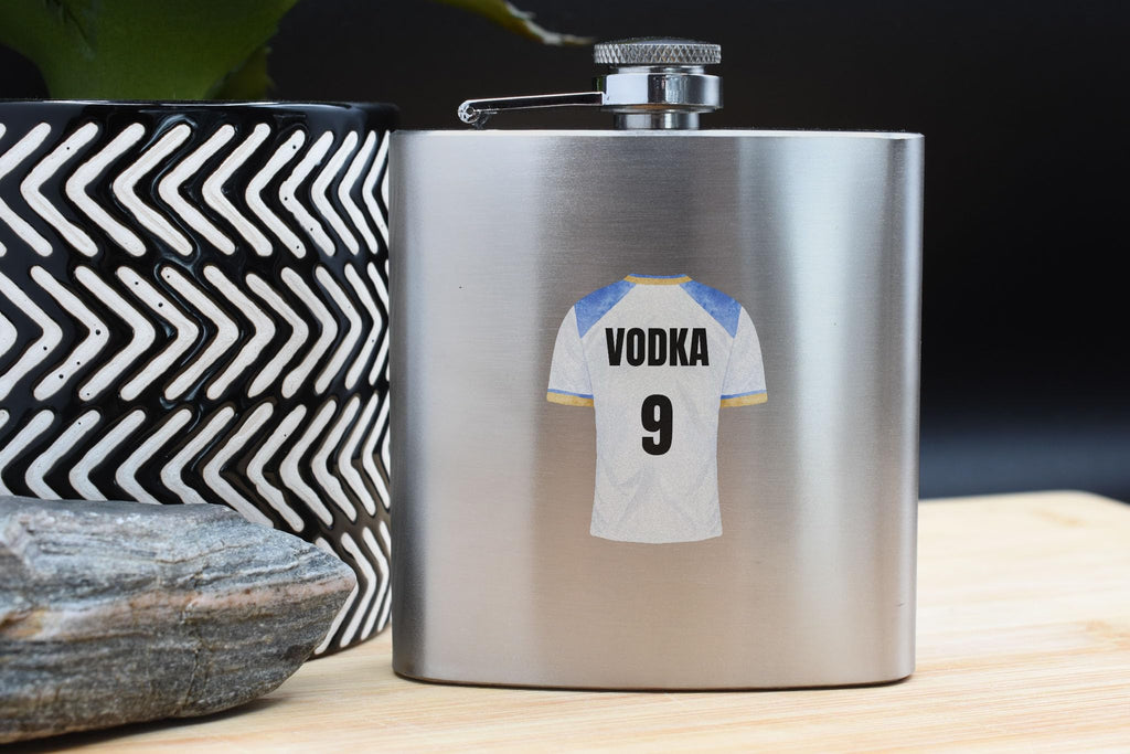 Introducing our Vodka 9 - Stainless Steel Hip Flask - a perfect novelty gift for sports fans. This hip flask is a unique and stylish way to enjoy your favourite spirit while showcasing your love for sports. It features a full colour design with an image of a sports shirt, complemented by black writing that reads 'Vodka 9'. Whether you're cheering for your favourite team or simply enjoying a drink with friends, this hip flask is sure to be a hit. Made from quality stainless steel, it is durable and built to withstand any adventure. Surprise your family and friends with this thoughtful present - it's perfect for wives, husbands, girlfriends, boyfriends, sons, daughters, and siblings. Get ready to impress the sports enthusiasts in your life with this one-of-a-kind hip flask.