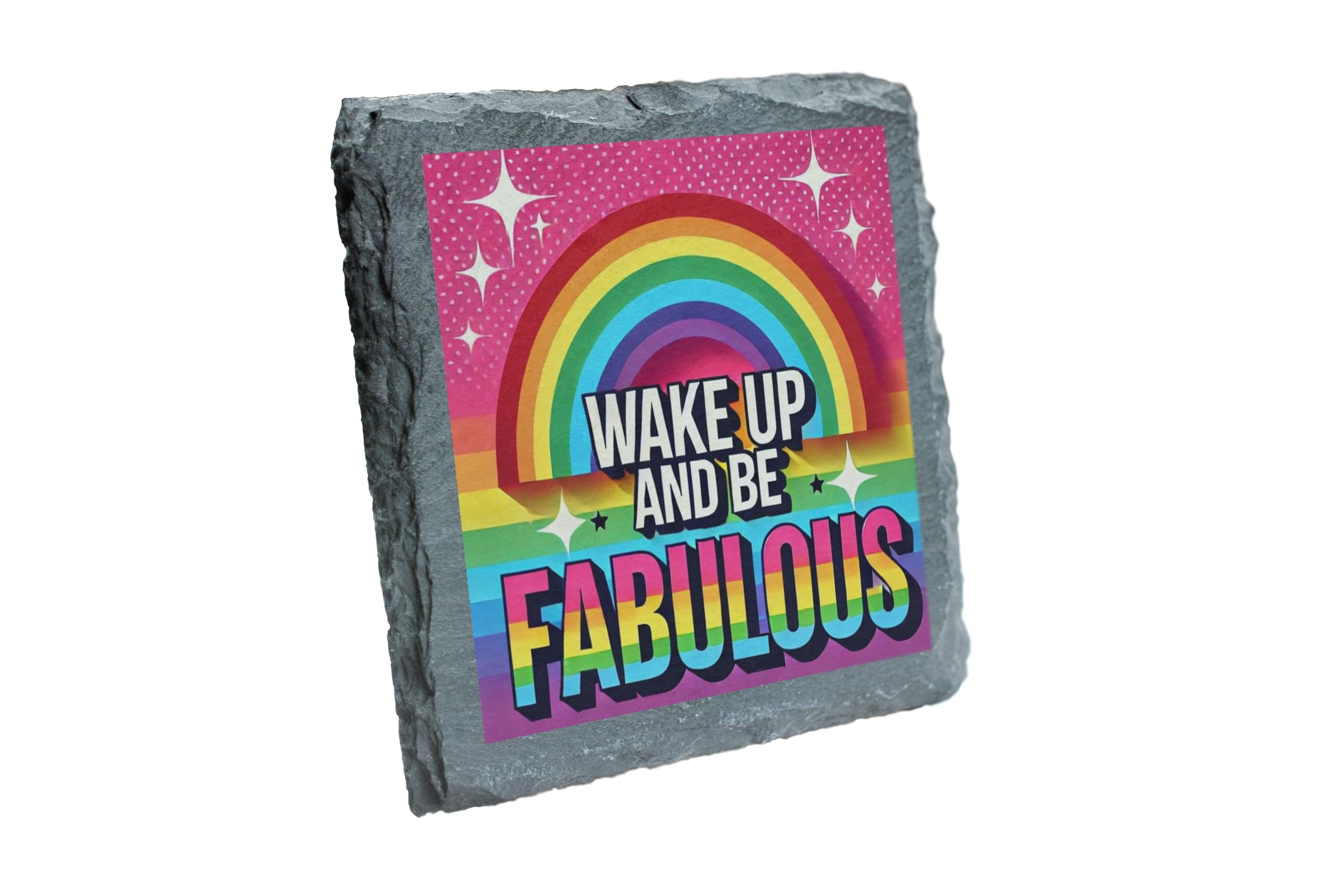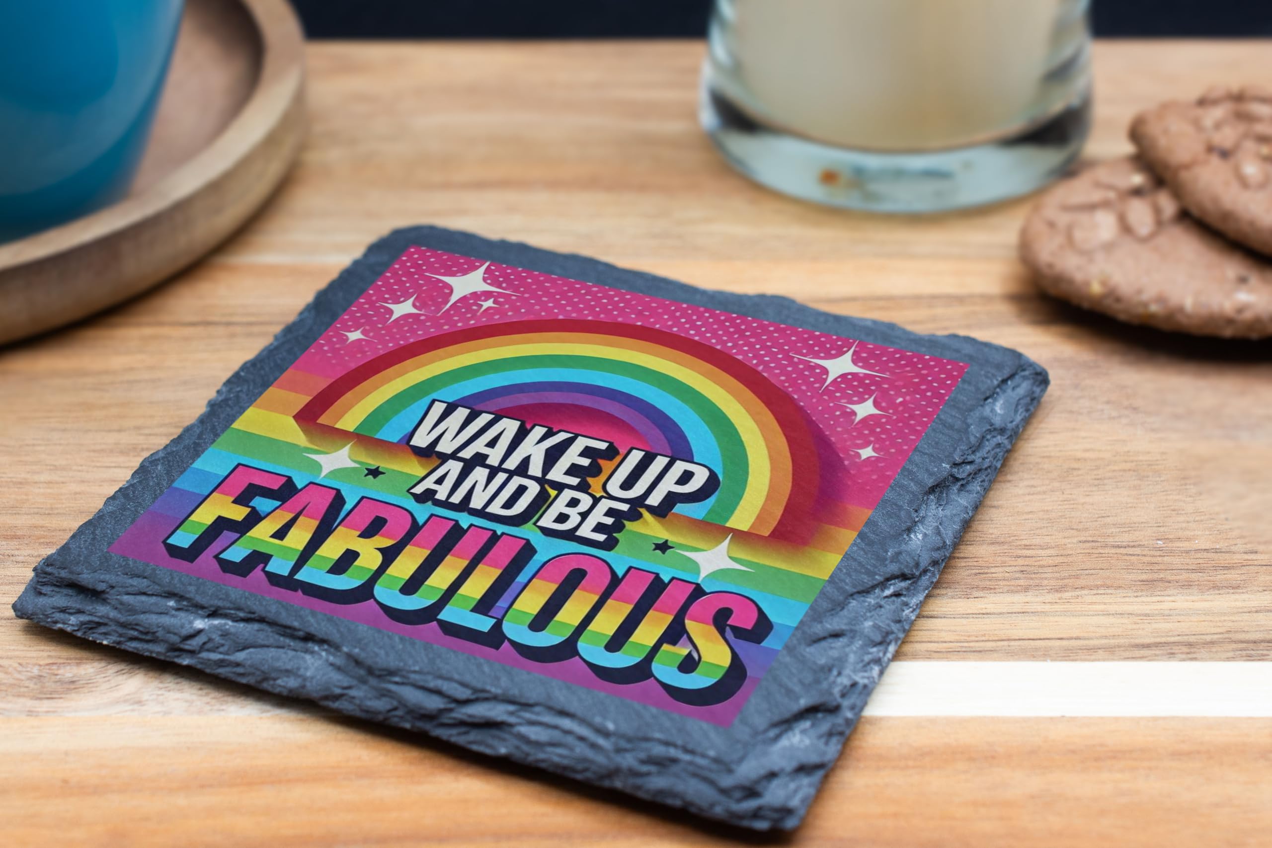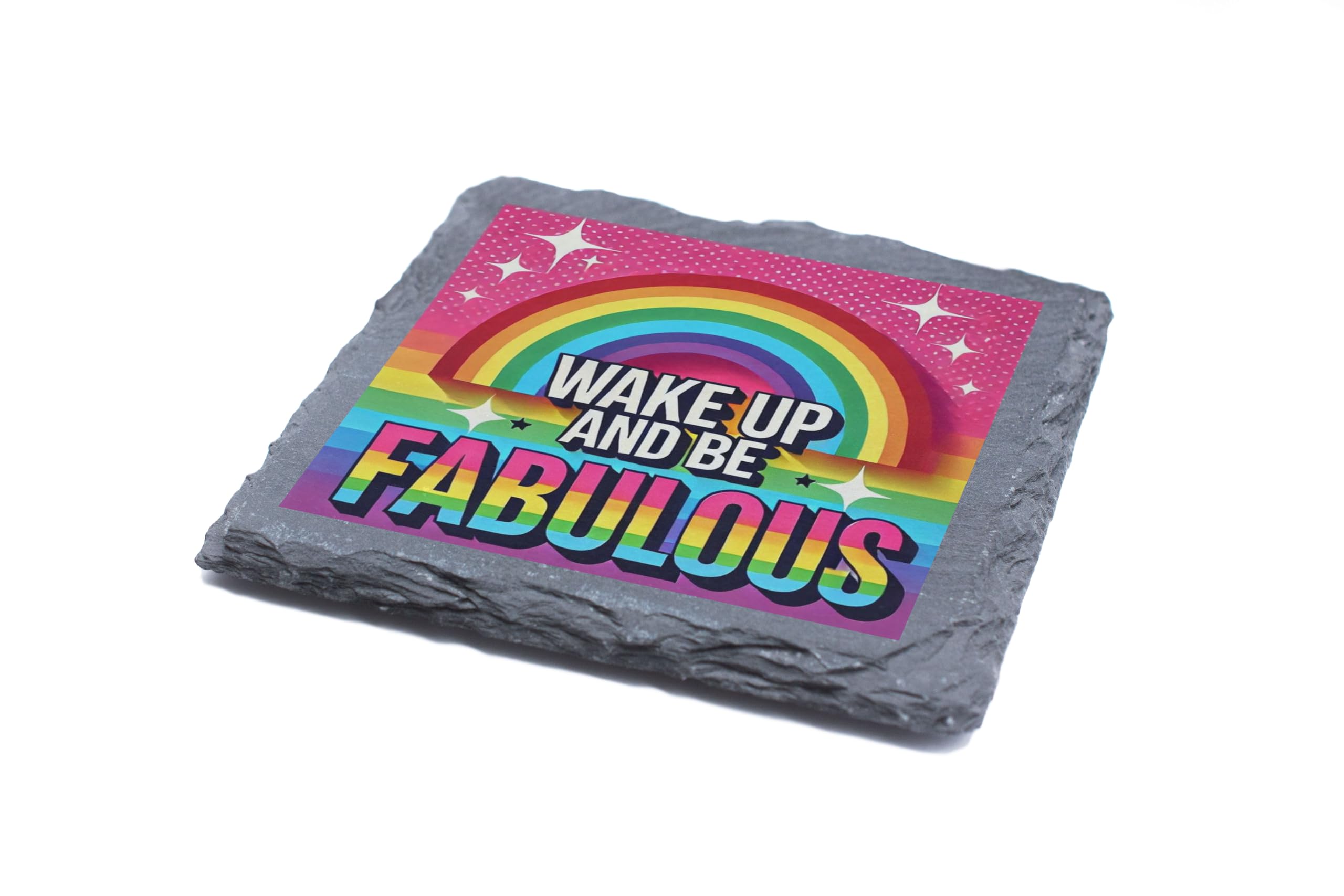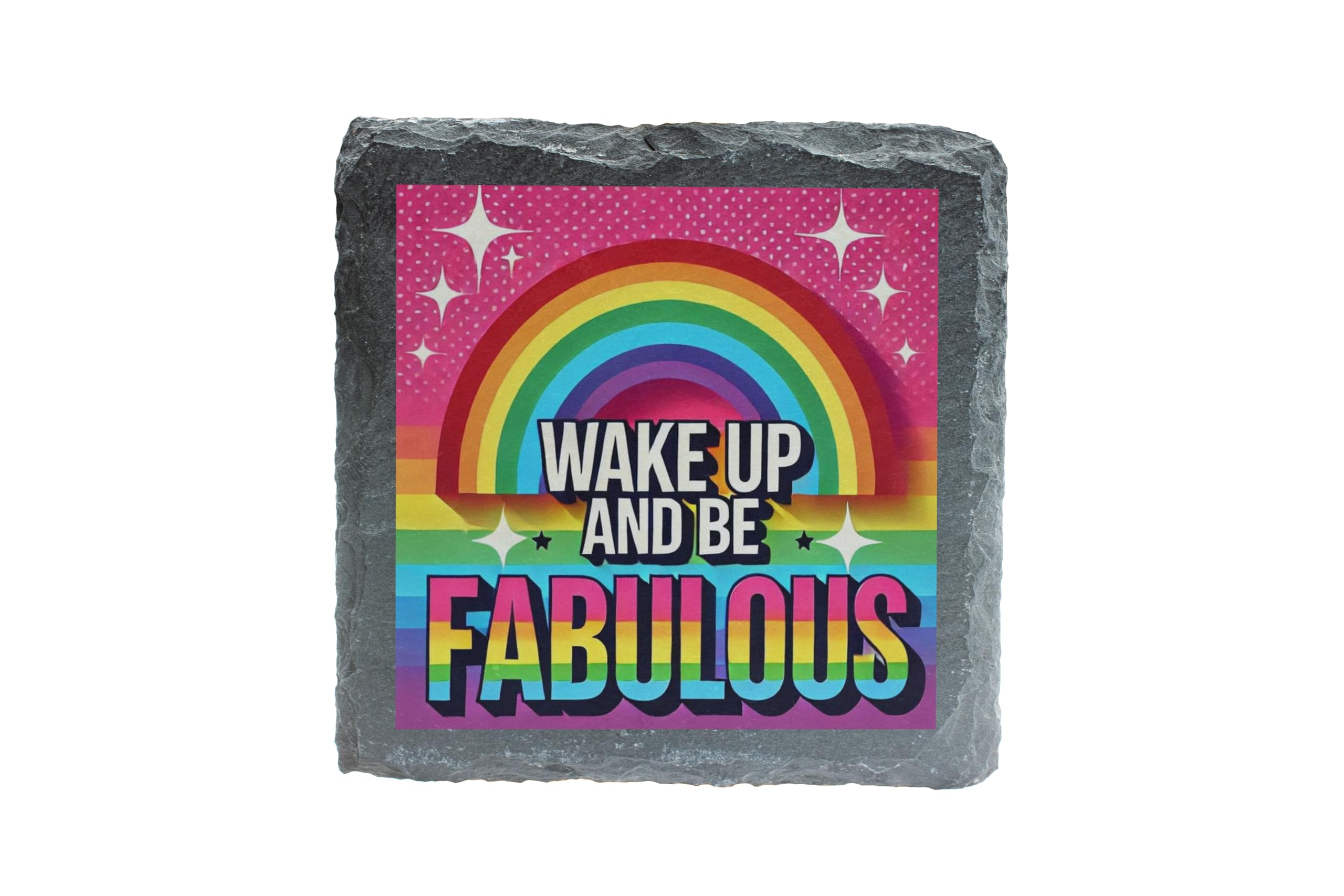 Start your day with positivity and flair with the "Wake Up and Be Fabulous" Rainbow Slate Coaster. Its vibrant design features a colorful rainbow, glittering stars, and an uplifting message that inspires you to seize the day. Whether you?re enjoying your morning coffee or winding down with an evening drink, this cheerful coaster is the perfect companion. Crafted from durable natural slate, this coaster not only brightens your space but also protects your surfaces from spills and stains. The non-slip backing ensures it stays in place, making it as practical as it is stylish. This decorative coaster makes a thoughtful gift for loved ones, coworkers, or anyone who needs a little encouragement to start their day fabulously. Brighten your surroundings and your spirits with this one-of-a-kind piece!