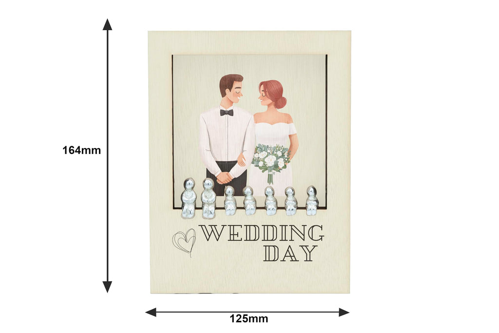 Introducing our Customisable Wedding Day Family Ornament, the perfect home decor gift to celebrate your special day! This beautiful ornament features a cream background with elegant black writing, and comes with a 7 people set that can be personalised to create your own unique family combination. Made from quality plywood, this ornament is free-standing and is printed in full colour for a stunning visual impact. The metal people fit perfectly in the frame, adding a touch of charm and sophistication. Cherish your wedding memories with this lovely ornament that celebrates the love and unity of your family.