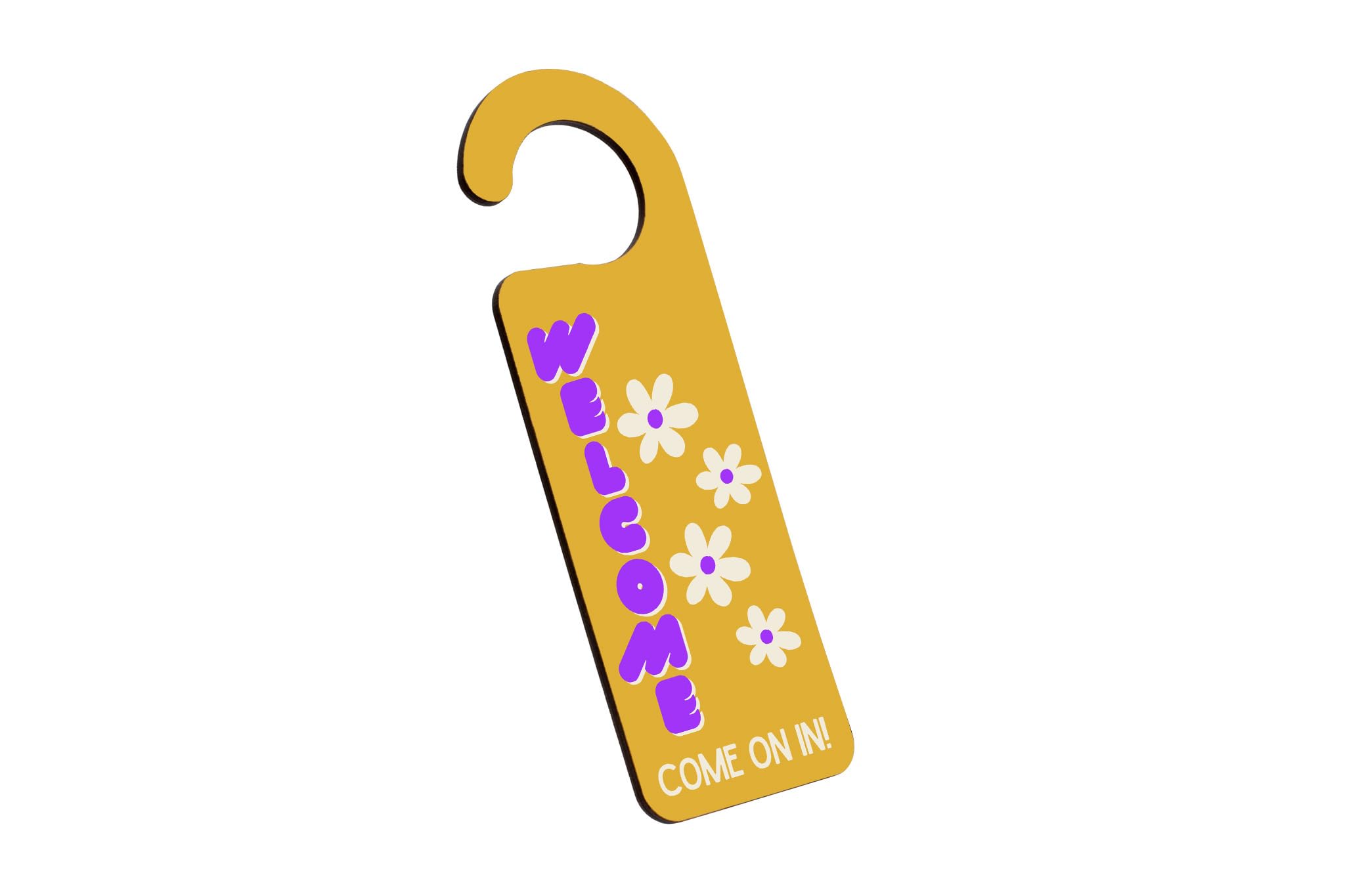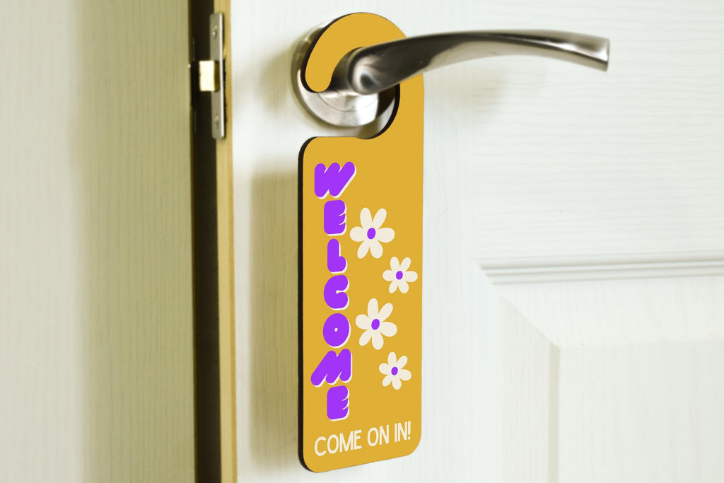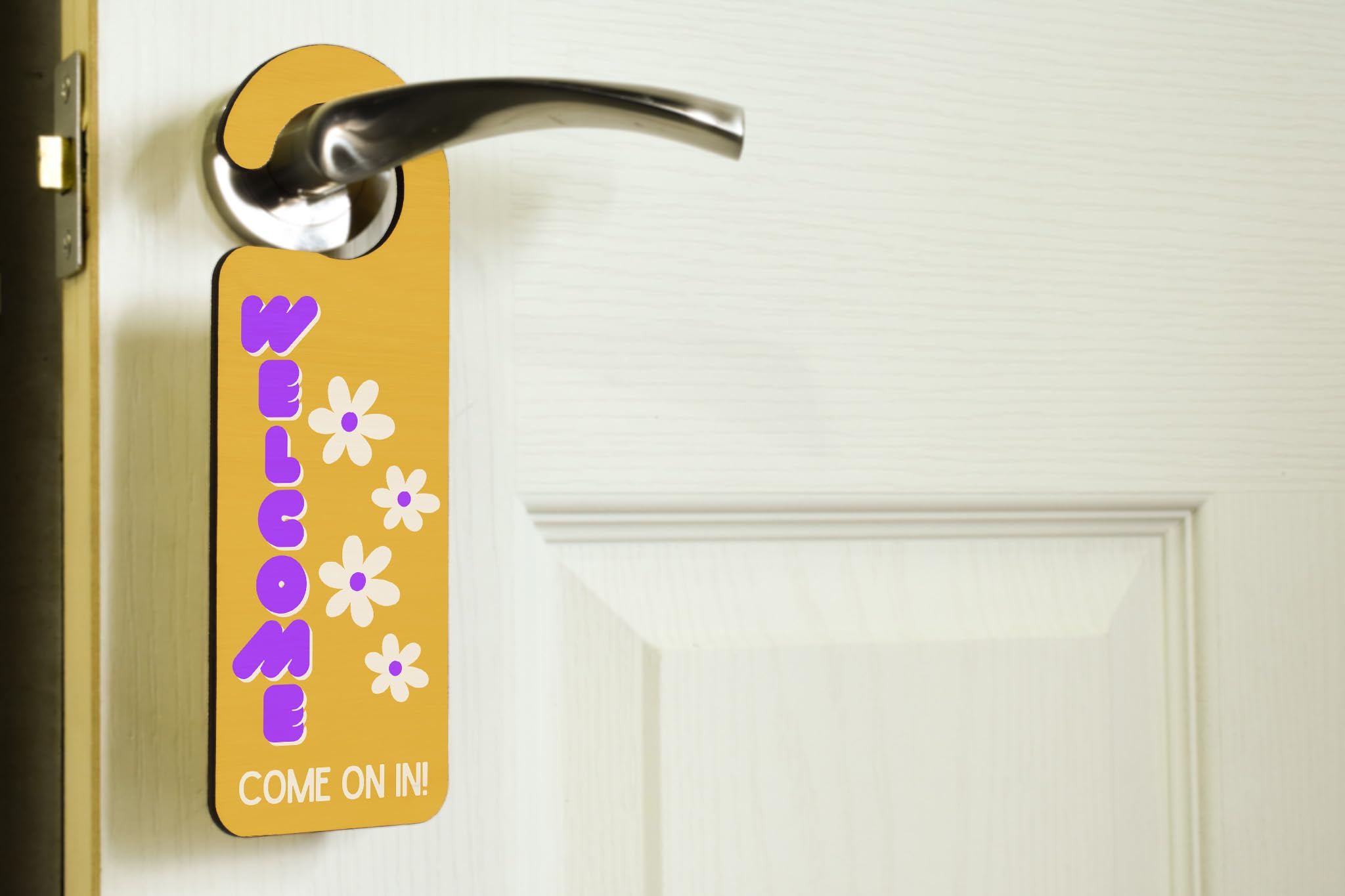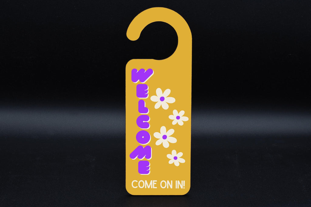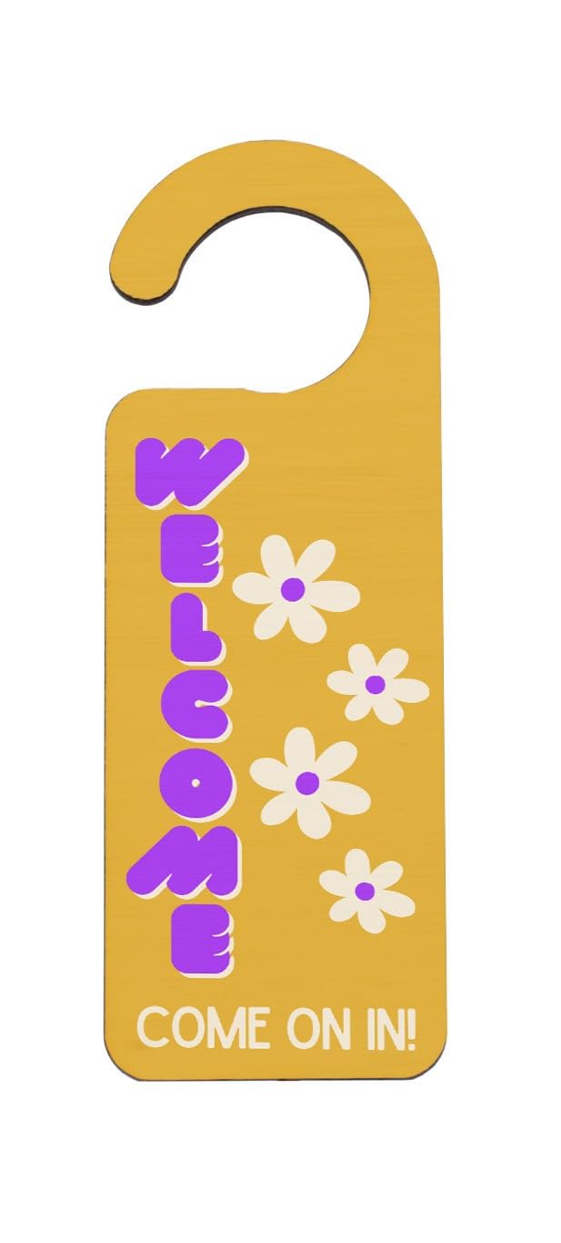 Introducing our beautiful Welcome Door Handle Hanger, featuring a stunning full colour retro design with bright purple and orange flowers. Made from quality plywood, this hanger is perfect for adding a dash of vibrant colour and a warm welcome to any home. It is not only a practical and decorative door accessory but also a thoughtful gift for new homeowners, families, sons, daughters, siblings, grandparents, couples, and parents. The hanger reads 'Welcome, Come on In' to ensure that your guests feel invited and loved. Add a touch of retro charm to your home with this unique and eye-catching door knob hanger!