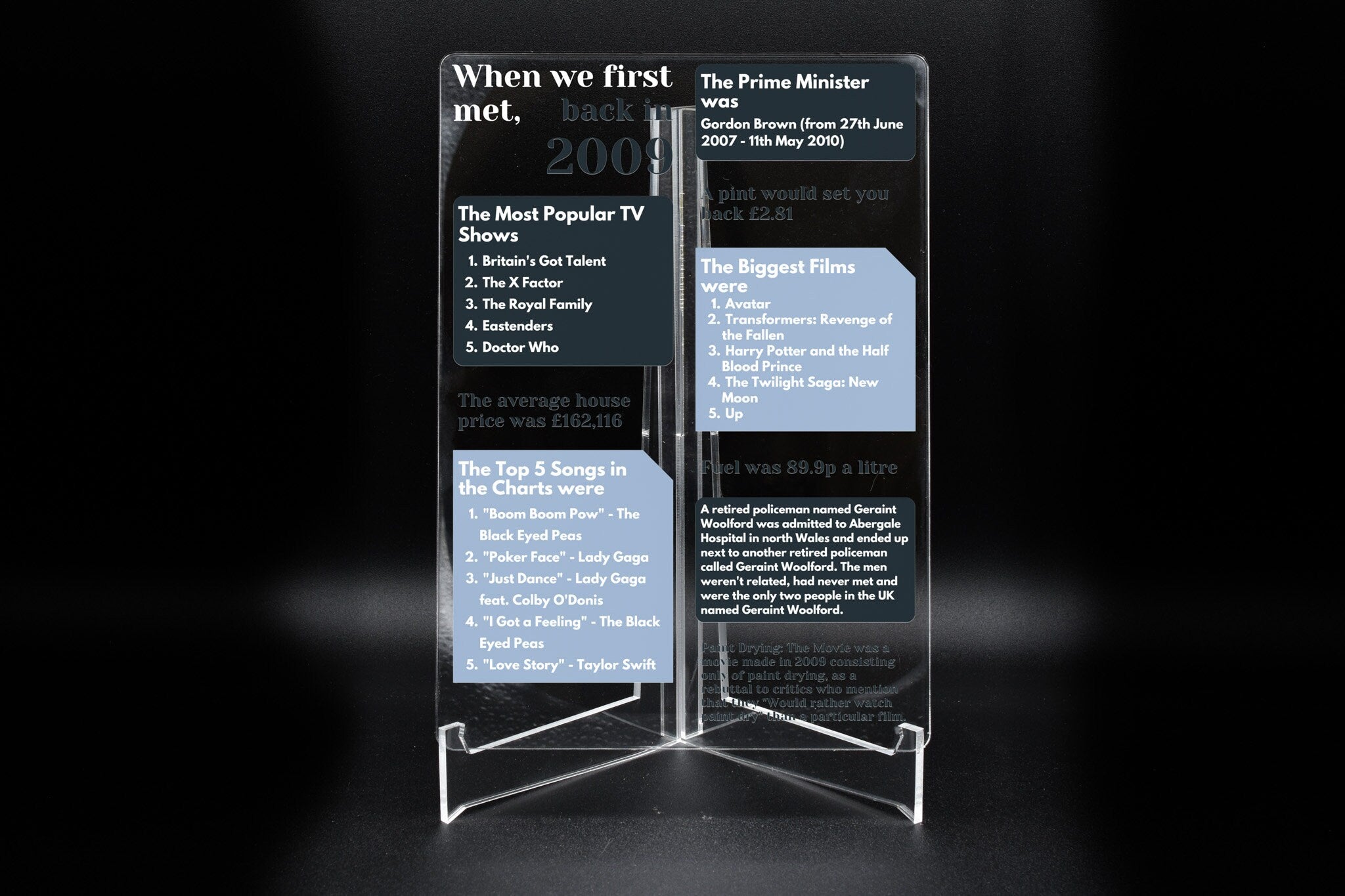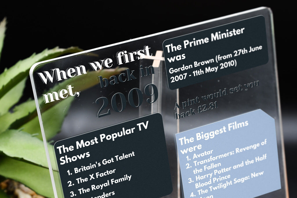 Celebrate the year you first met with our When We First Met 2009 Free Standing Ornament. This beautifully crafted ornament is a perfect gift for your loved ones, including mum, dad, boyfriend, girlfriend, husband, and wife. Made from quality clear acrylic, it is a stunning addition to any home and can be displayed all year round. With its unique design, this ornament encapsulates the essence of 2009, allowing you to revisit the past and cherish the memories of that special year. It features notable highlights such as the most popular TV show, the cost of a pint, top of the charts music, and who was the prime minister in 2009. Whether it's for an anniversary, wedding anniversary, birthday, Valentine's Day, or Christmas, this ornament is the perfect way to commemorate the year you first met and make it a truly unforgettable gift.