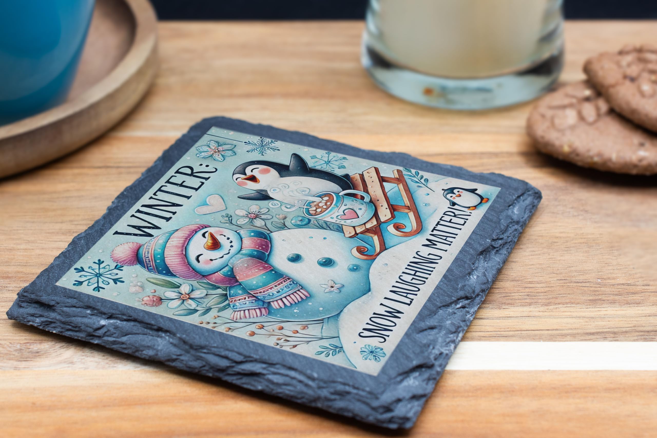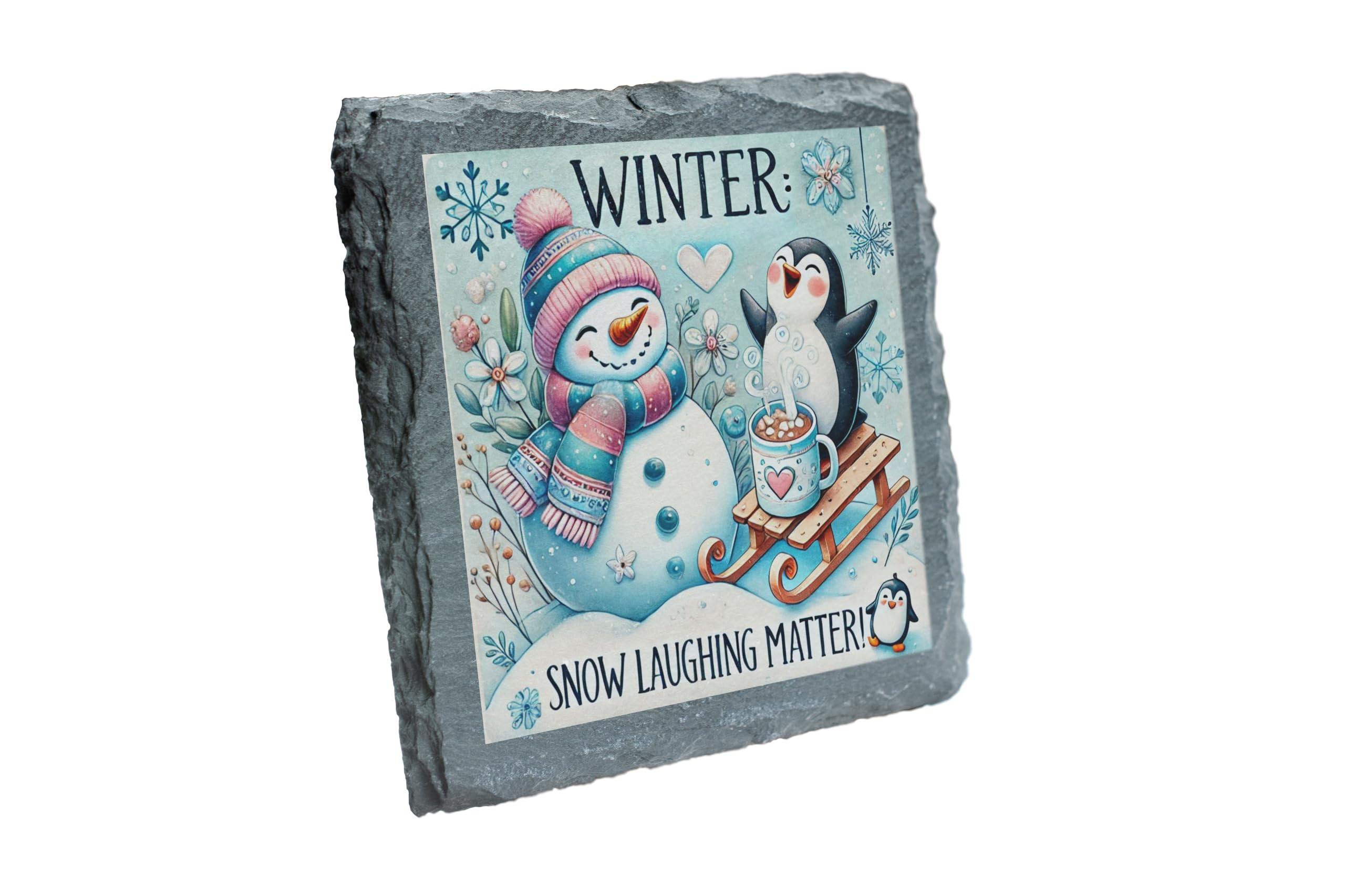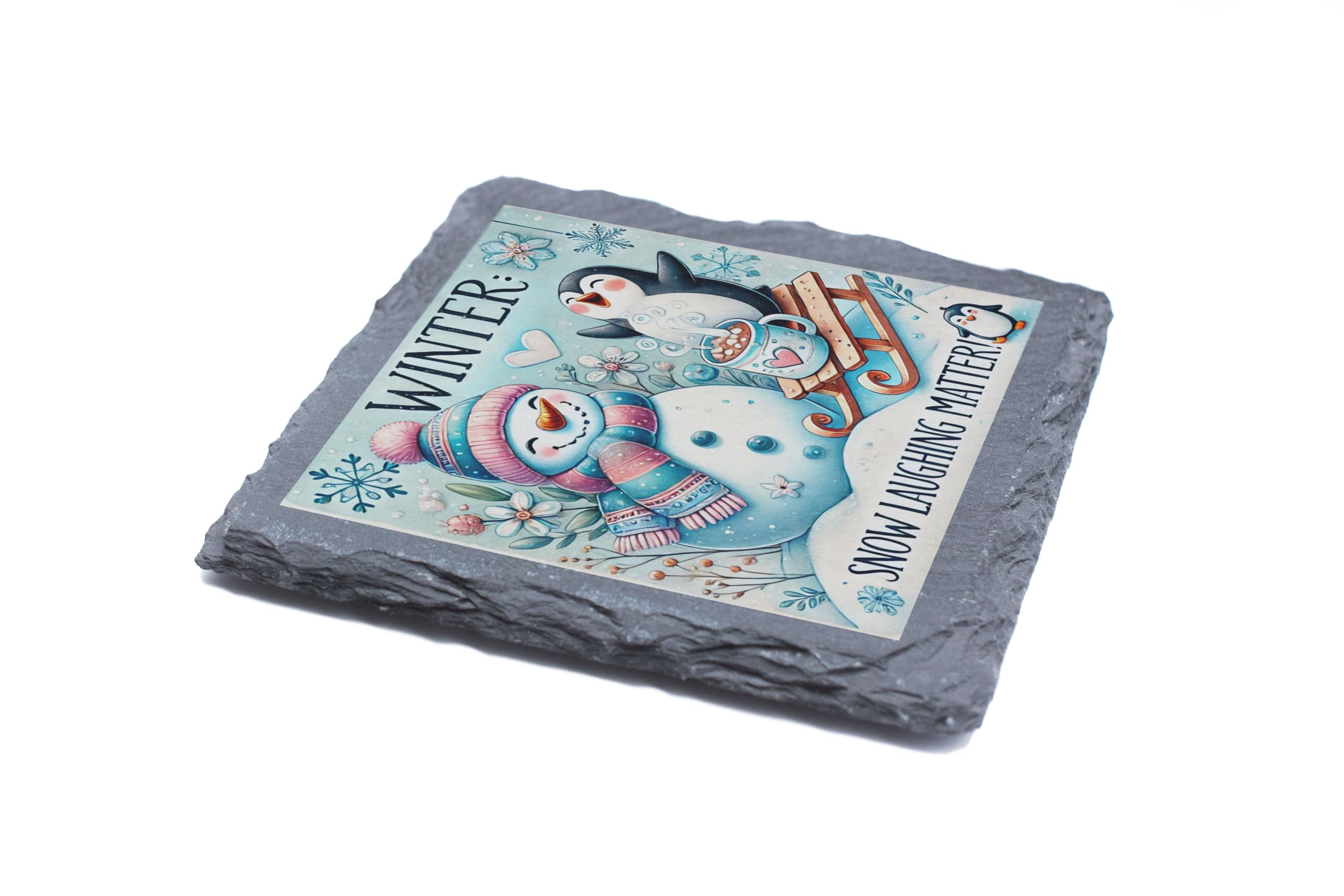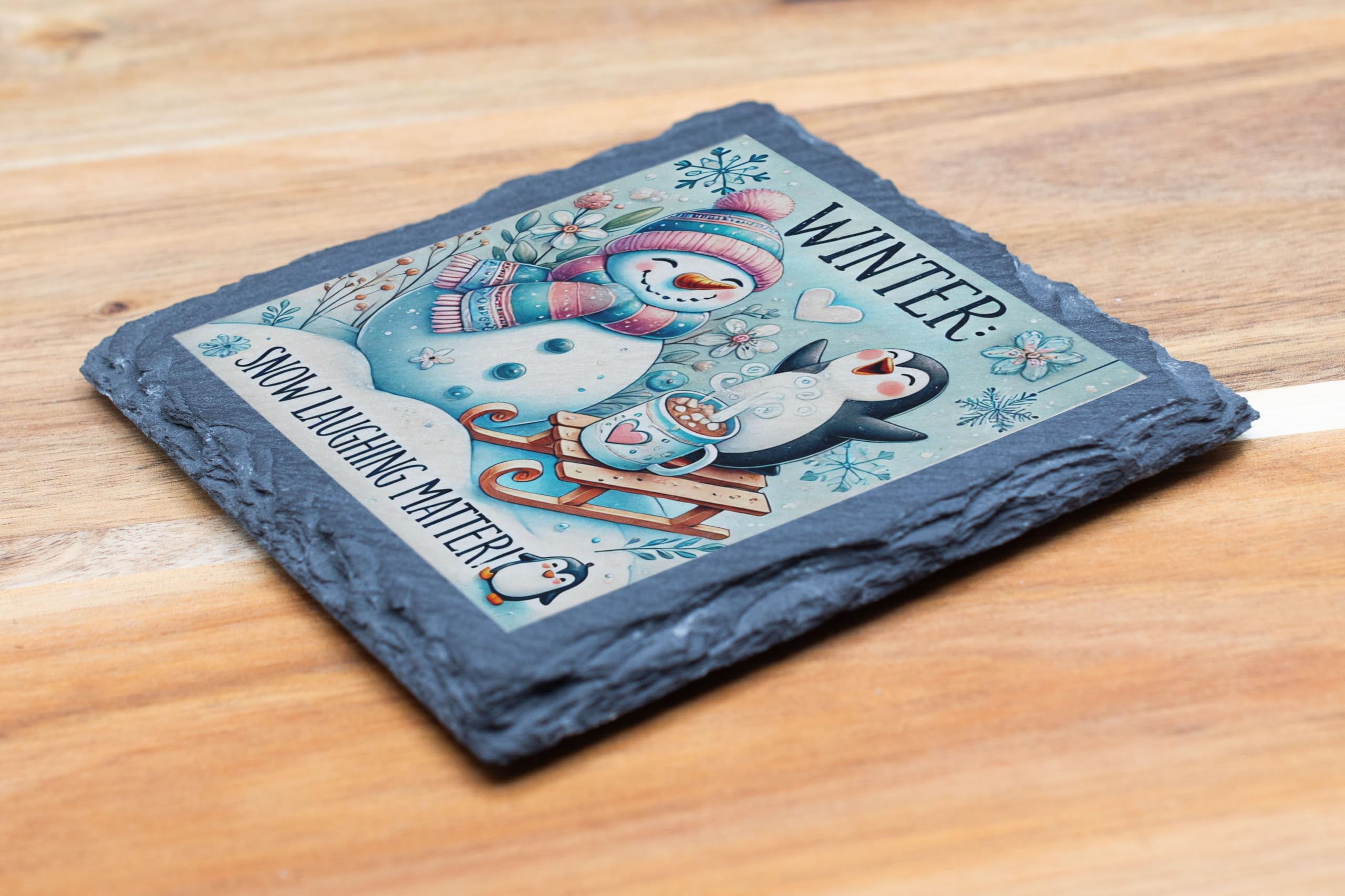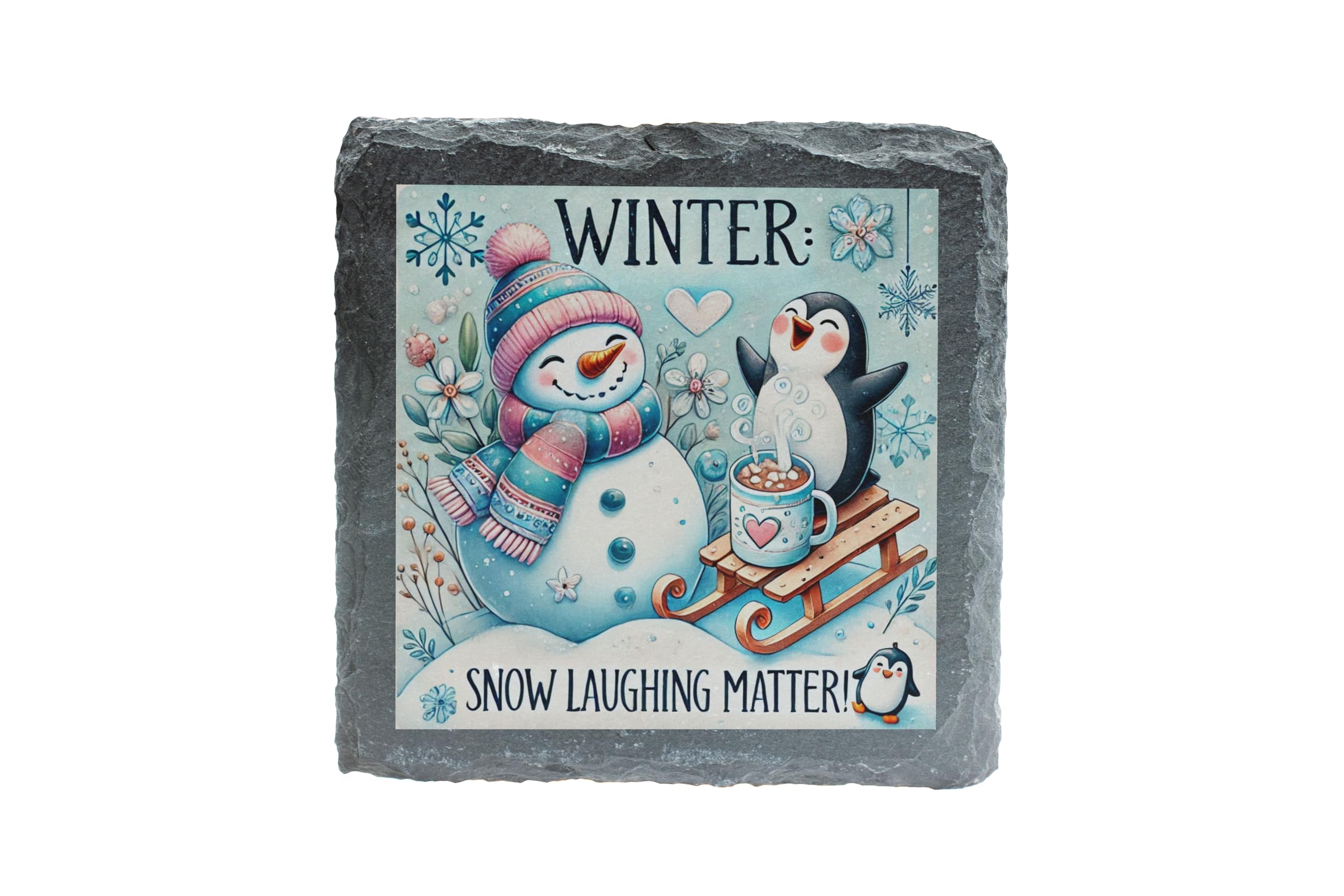 Celebrate the joy of the winter season with the "Winter Fun" Slate Coaster. This delightful coaster showcases an endearing snowman and penguin illustration accompanied by the playful phrase, "Snow Laughing Matter." Perfect for adding a festive and cozy touch to your home, this coaster not only protects your tabletops but also spreads seasonal cheer. Made from durable natural slate, this coaster ensures lasting quality and functionality. Whether you?re hosting a holiday party or looking for the perfect gift for a winter enthusiast, this unique piece is a practical and decorative addition to any space. Enjoy your hot cocoa, tea, or mulled wine while basking in the warmth of this charming winter-themed design!