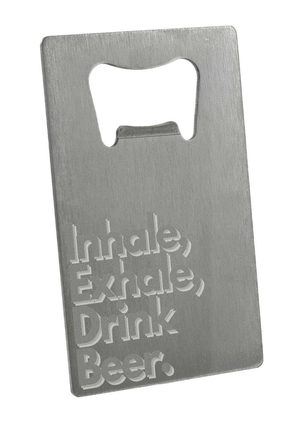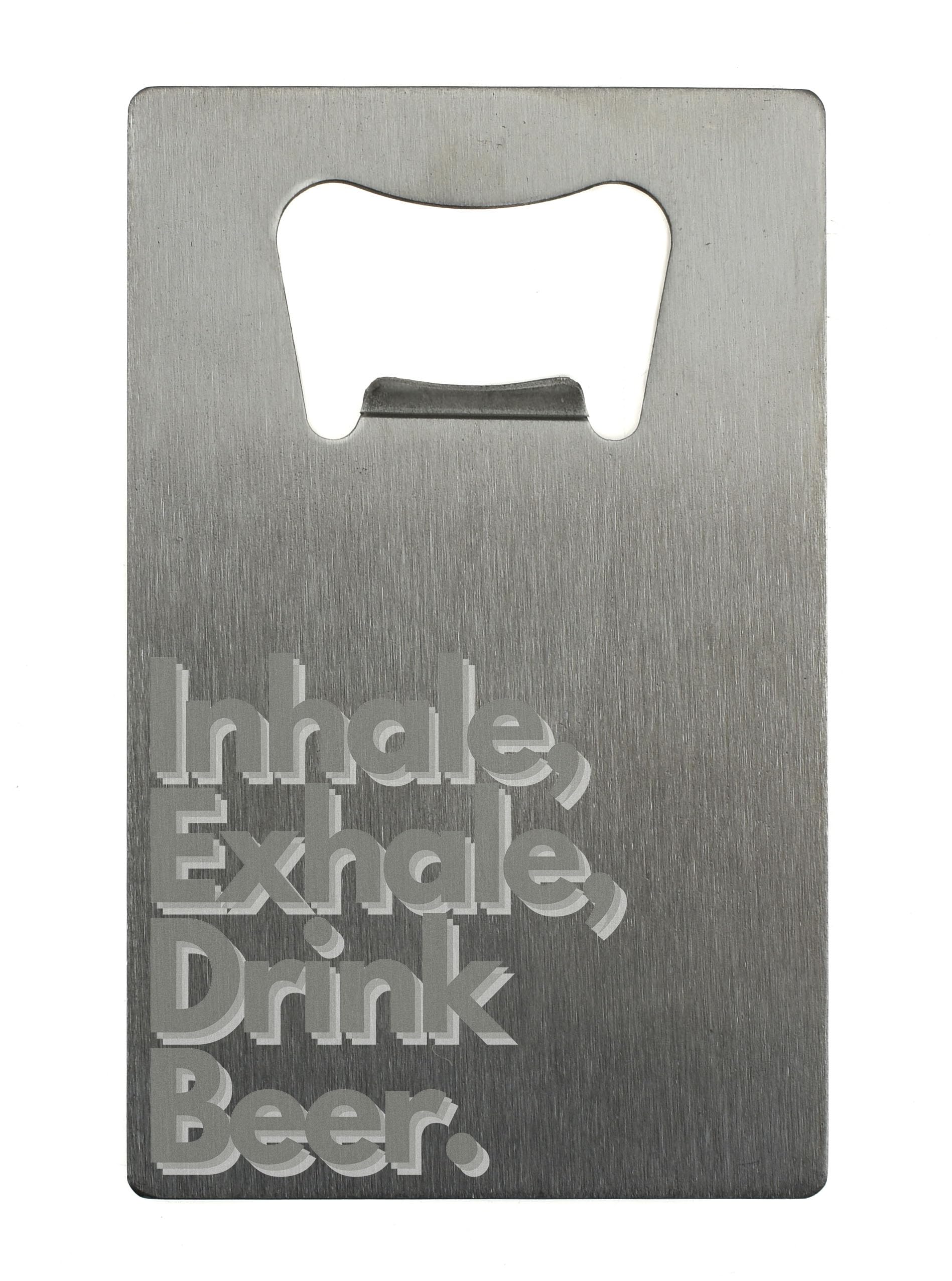 - Stainless steel bottle opener with a unique 'Inhale Exhale Drink Beer' design
